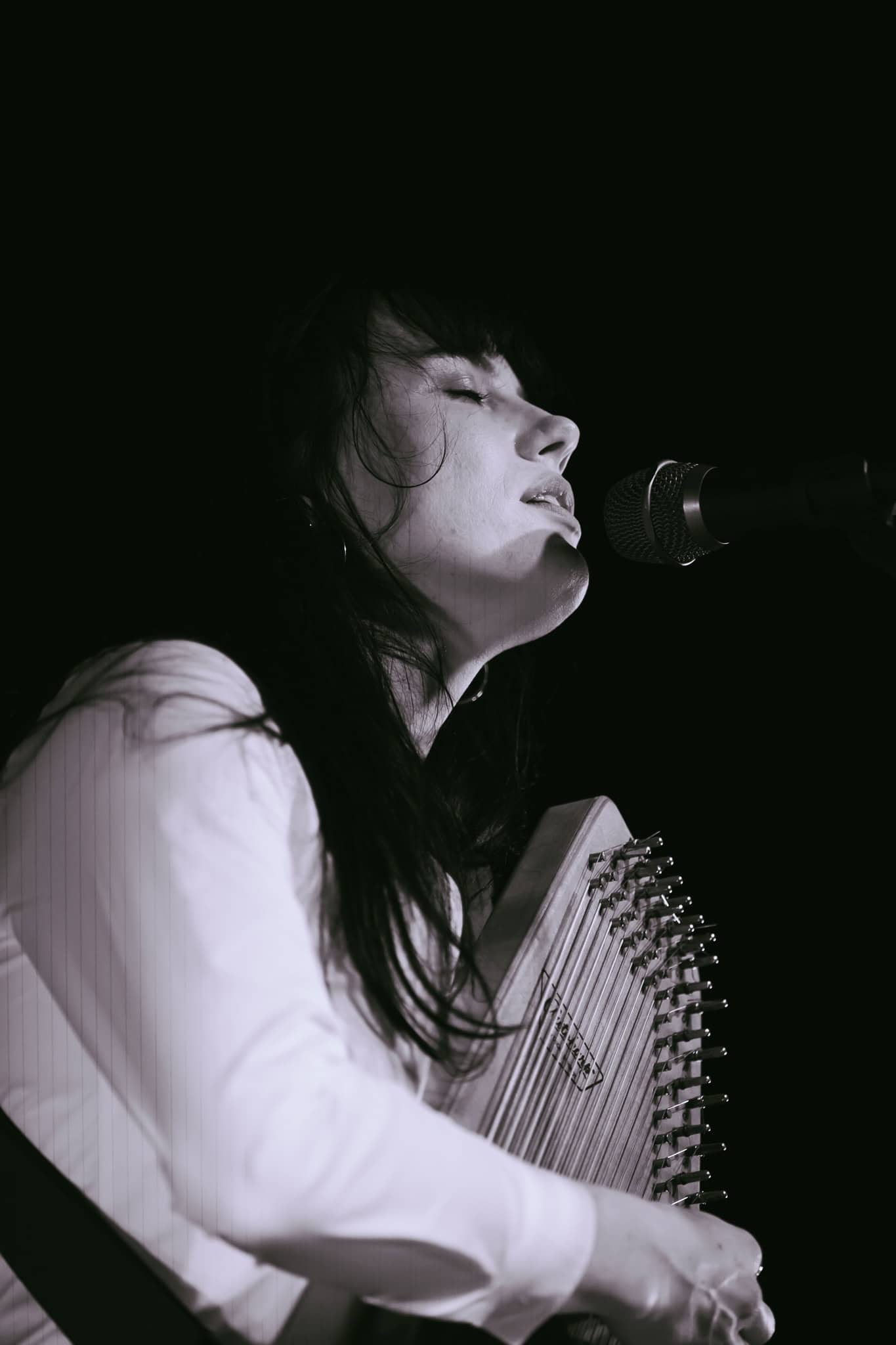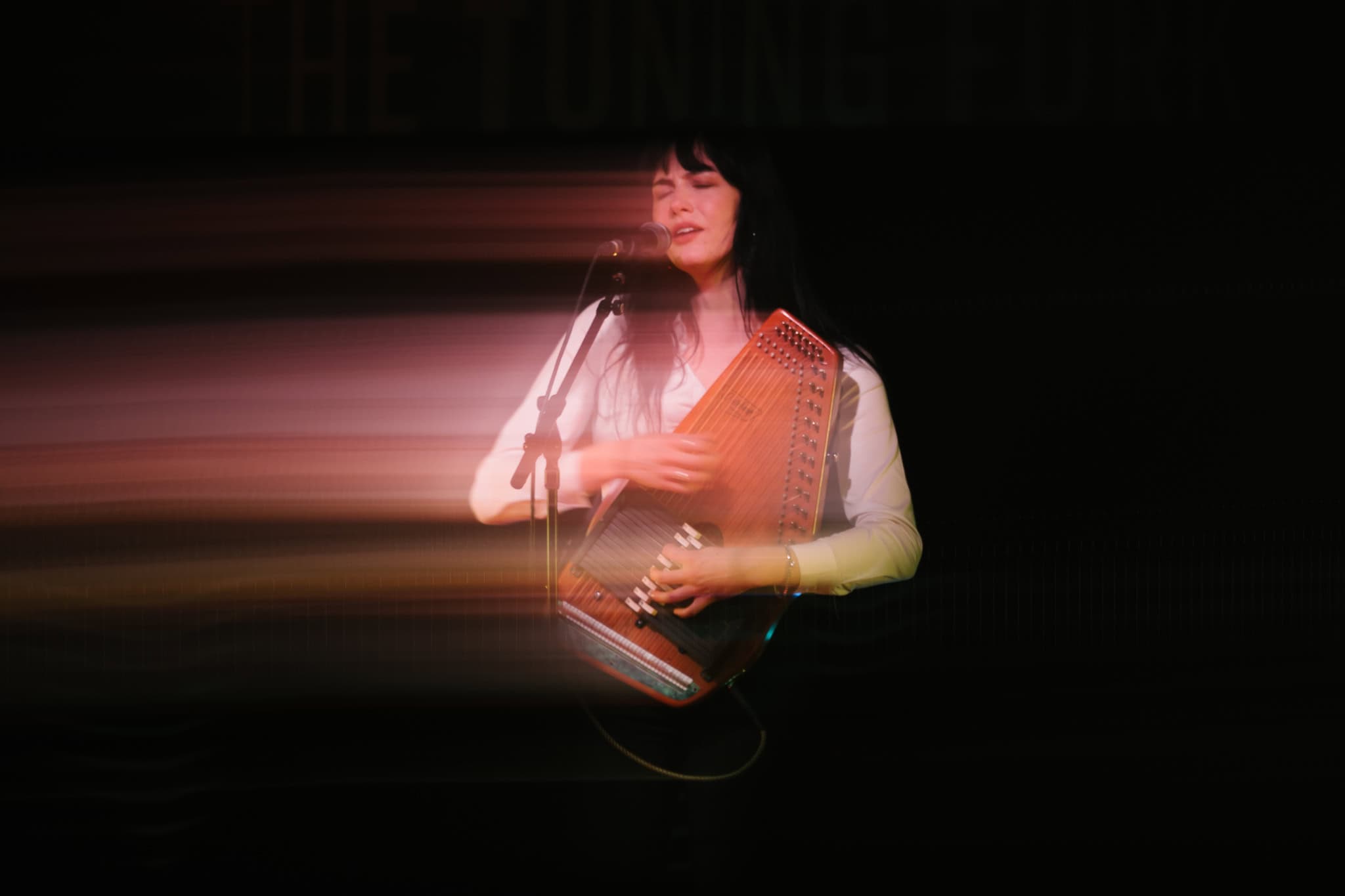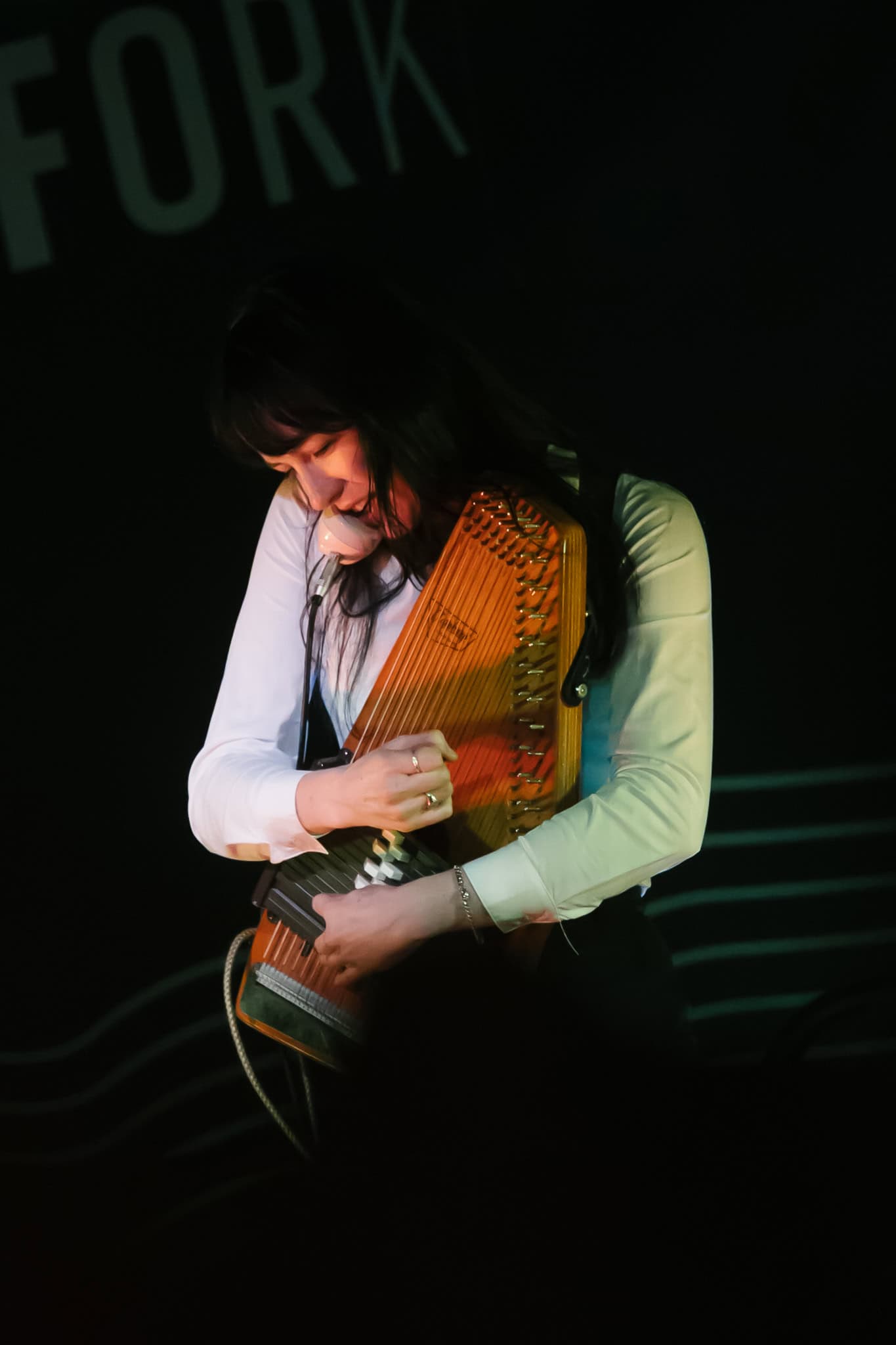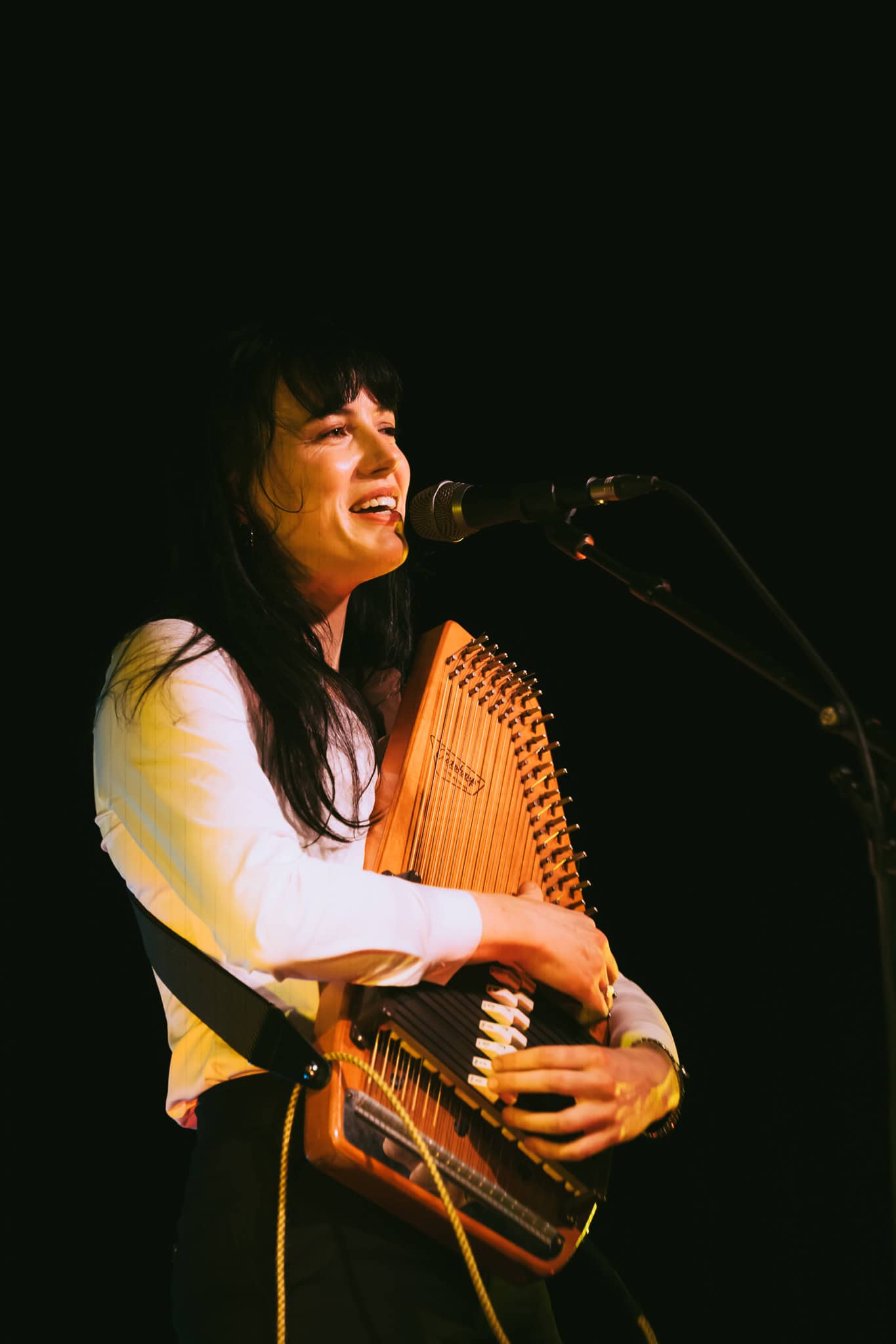 First up, though, its Georgia Knight. Walks on, takes off a puffer jacket and dons an autoharp. Holds it in affectionate embrace, whispering into the beginnings of first song Mingle. Spacious, atmospheric, mysterious sounds. Lyrics to match I’m looking for something to do/we can talk revolution/I say maybe. Something alluringly hypnotic in her repetitive strums.