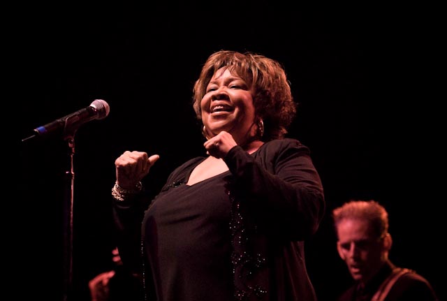 In a month full of extraordinary live performances, Mavis Staples’ hour-long set at The Civic may have been the high point. In a surprise move, the 71-year-old singer took the stage ahead of The Blind Boys and Aaron Neville. Her crack band appeared promptly at 8pm. This is the same band that backed Mavis up on her recent Grammy Award winning album, You Are Not Alone, produced by Wilco’s Jeff Tweedy, and they provided a perfect backing for Mavis’ gospel/soul/blues/rock sound. But first, Mavis and her three backing singers, including sister Yvonne and former Skylark singer Donny Gerrard (remember their 1970’s hit Wildflower?) started things with an acapella gospel number to warm up the vocal cords. Mavis’ voice is a bit huskier than it was in the 70s, but she still retains her power and control, as she proved when she and the band performed John Fogerty’s Wrote A Song For Everyone.