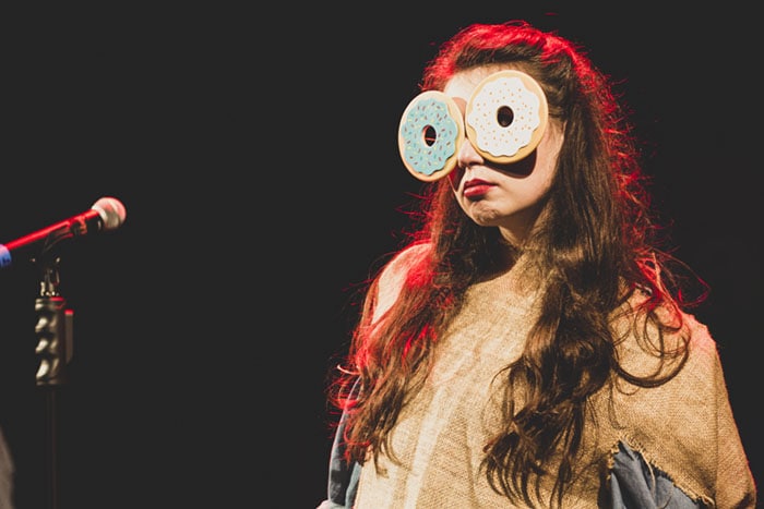 Game Face challenges these ideas head on, using their personal experiences to shine a light on the absurdity of not only external pressures, but those from within; mawkish ‘Love the Skin Your In’ motivational quotes nothing more than passing Facebook posts, or words spoken through gritted teeth and false smiles to oneself at 3am in the morning when depression begins to rap on the window. Often echoing each other’s lines, or talking over each other at rapid pace – Clare at one point donning a brown sack for a tongue in cheek visual representation of how many women feel – the trio give an insight into the madness that is often running through the neural pathways each and every day for women as they consistently strive for a level of achievement that should never have been set in the first place.