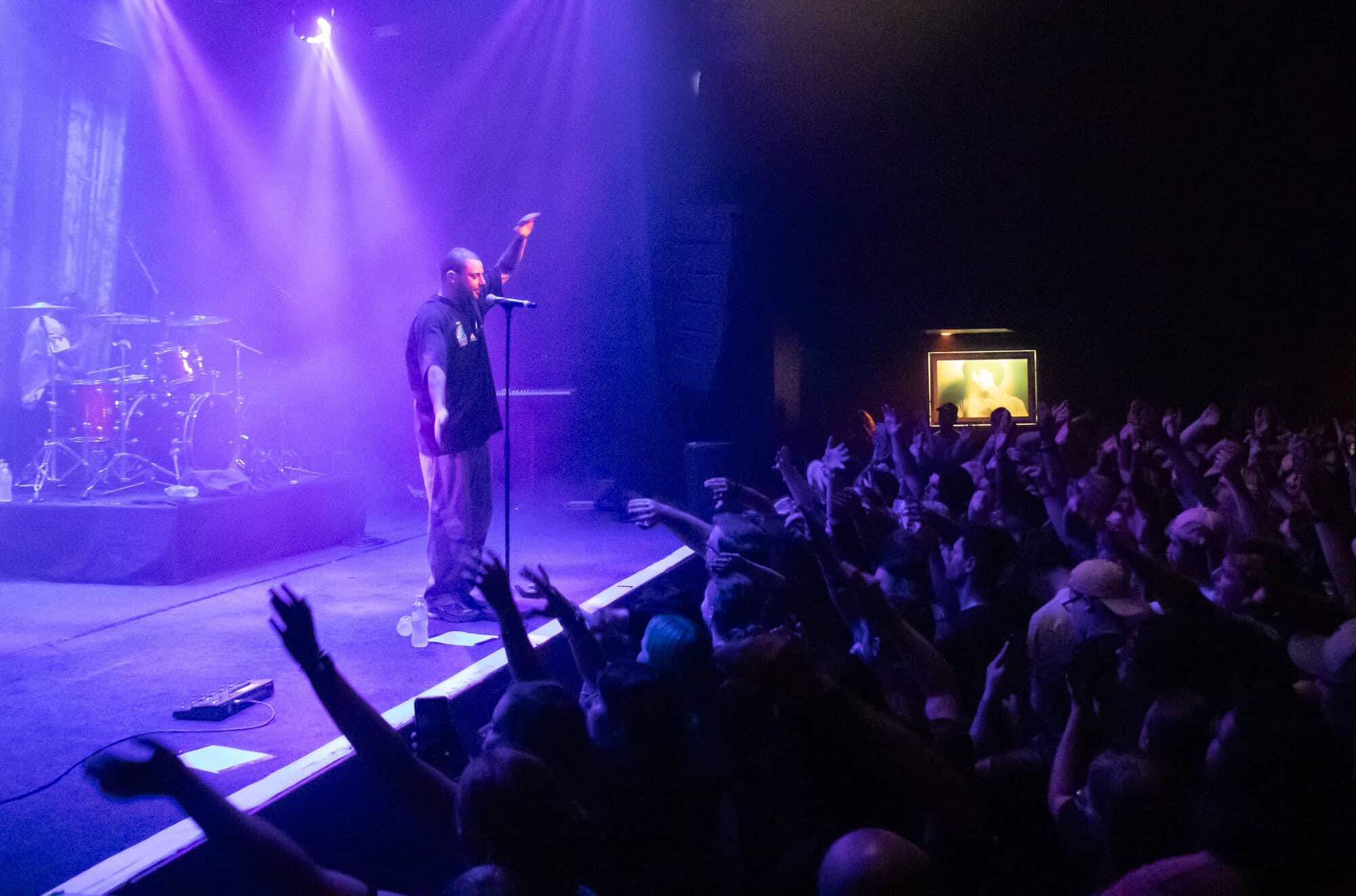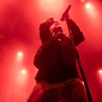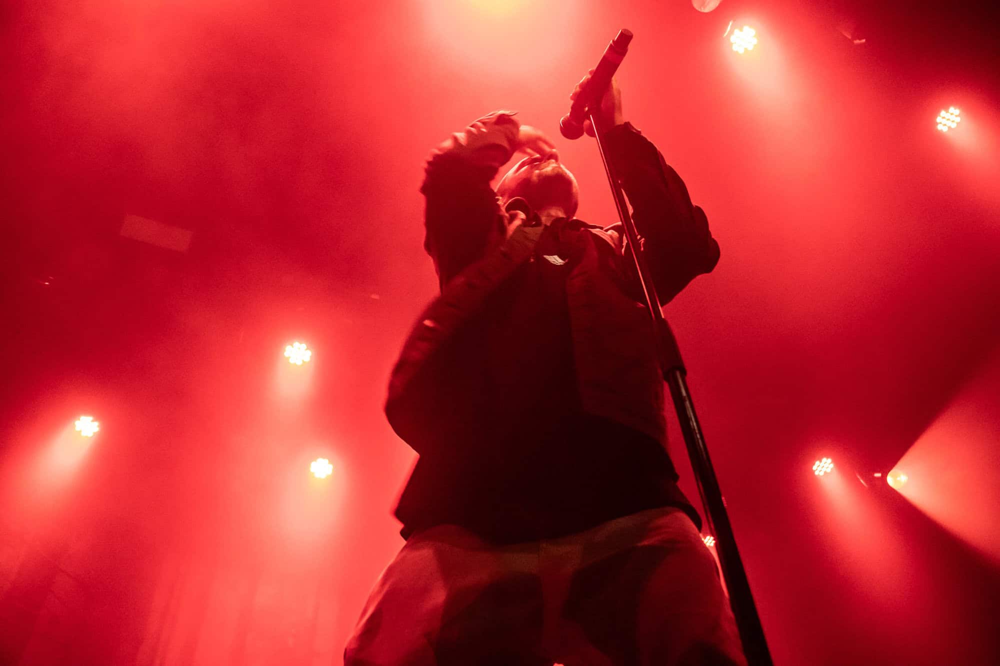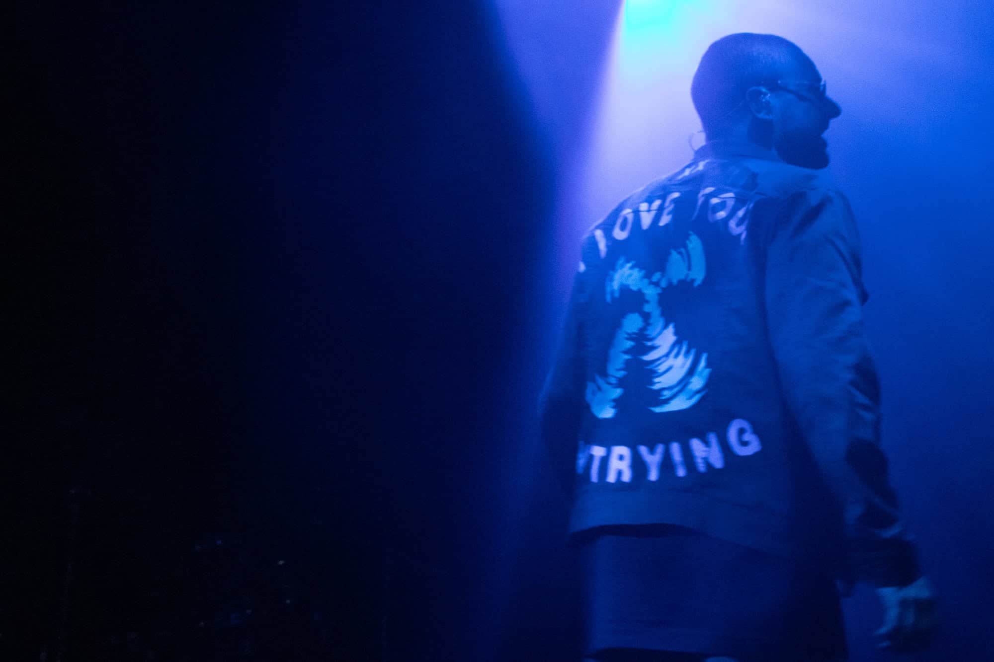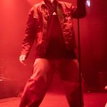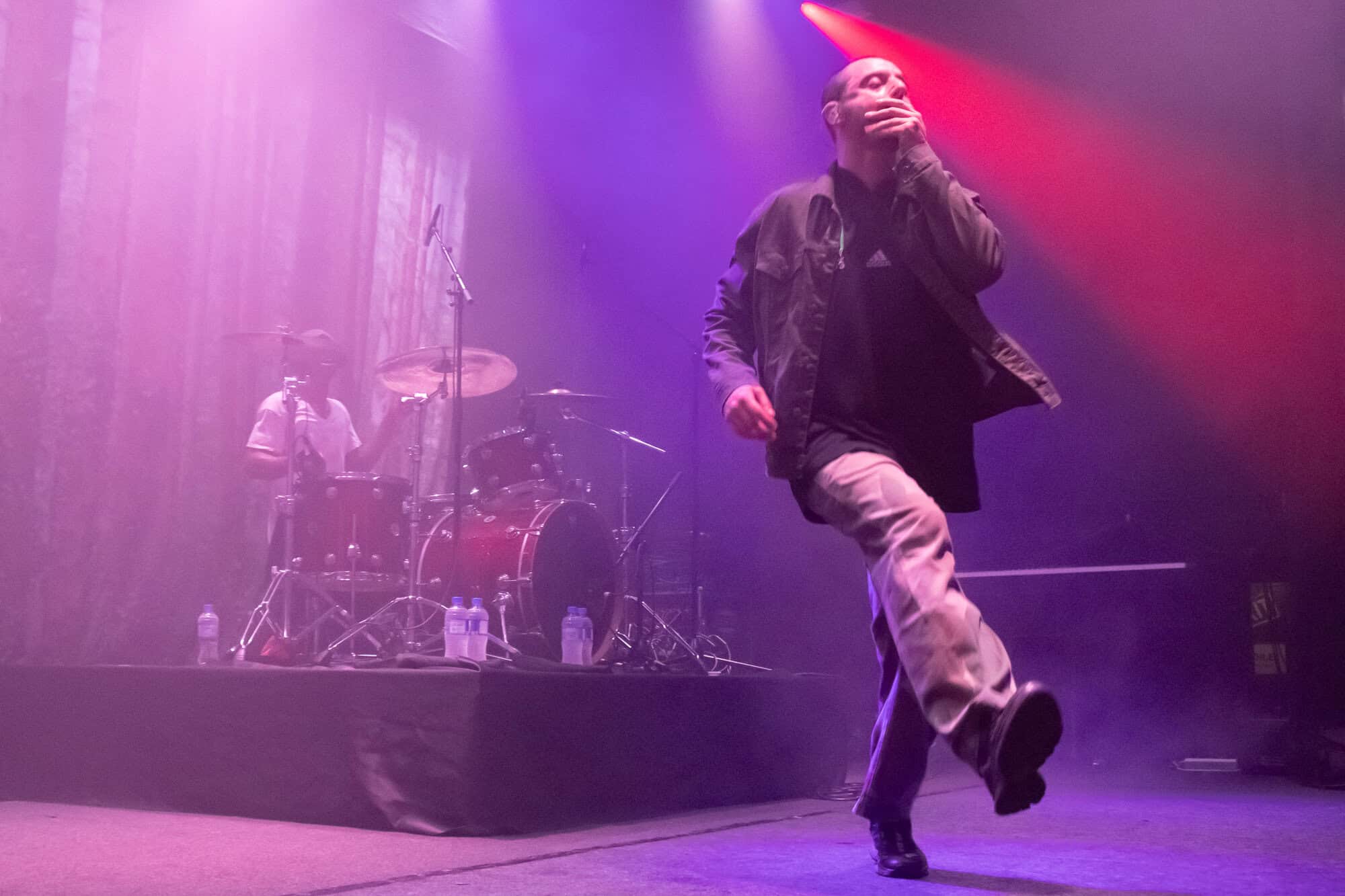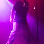 I had been curious as to how the recordings were going to translate to the live show. On stage grandson was accompanied by a two-piece band Tobias Kelly on the drums and Leo Varella on guitar; their sound further substantiated by the occasional pre-recorded backing vocal and bass track. Tobias literally didn’t miss a beat, playing to a click track in his headphones the entire show, whereas Leo frequently bent his guitar sound into a more primal and singular interpretation of the array of sounds we hear across the album versions’ counterparts. Grandson’s emphasis and vocal delivery had a punk rock aesthetic, a raw intensity that served to rachet up and maintain the energy in the room. He gave an extremely physical performance throwing his entire body behind his voice; banging his head, swinging his limbs, and bouncing from his centred mic stand to each corner of the stage and back again.