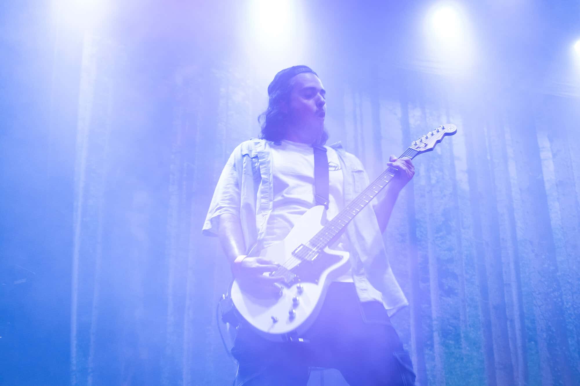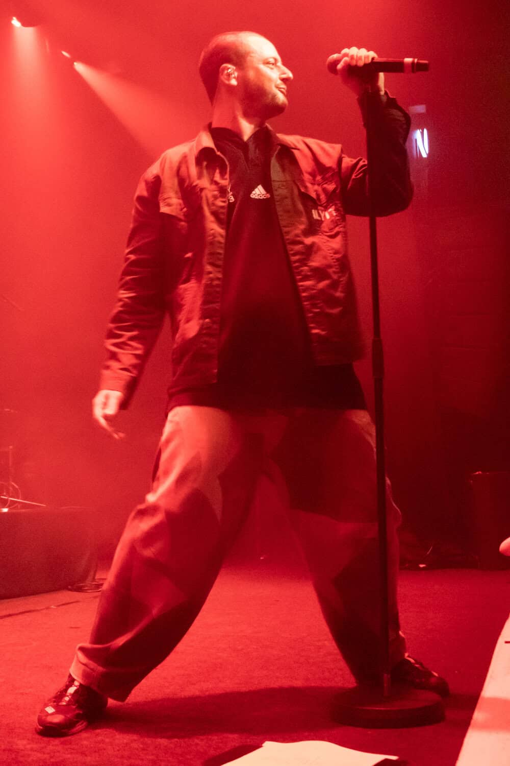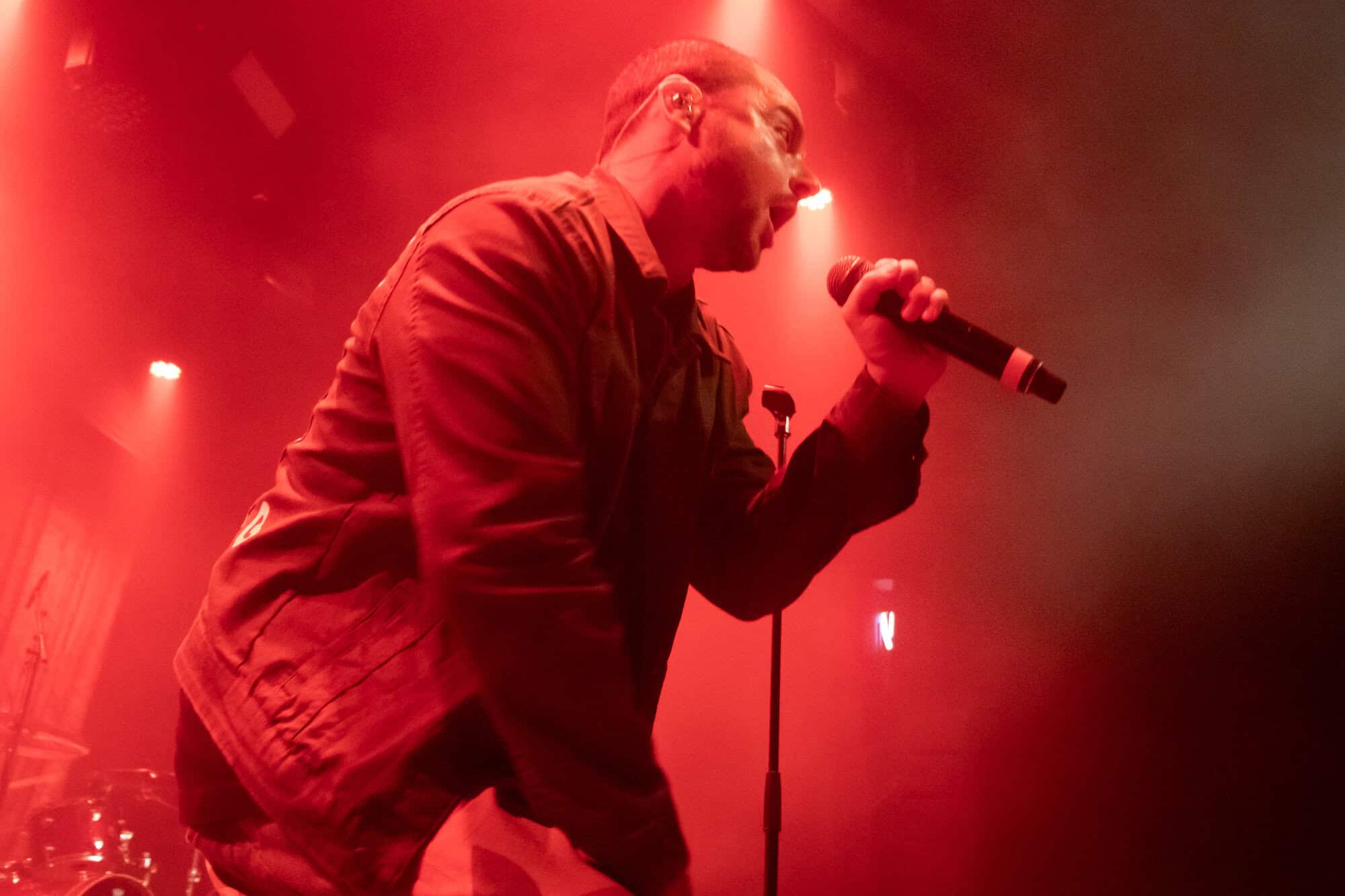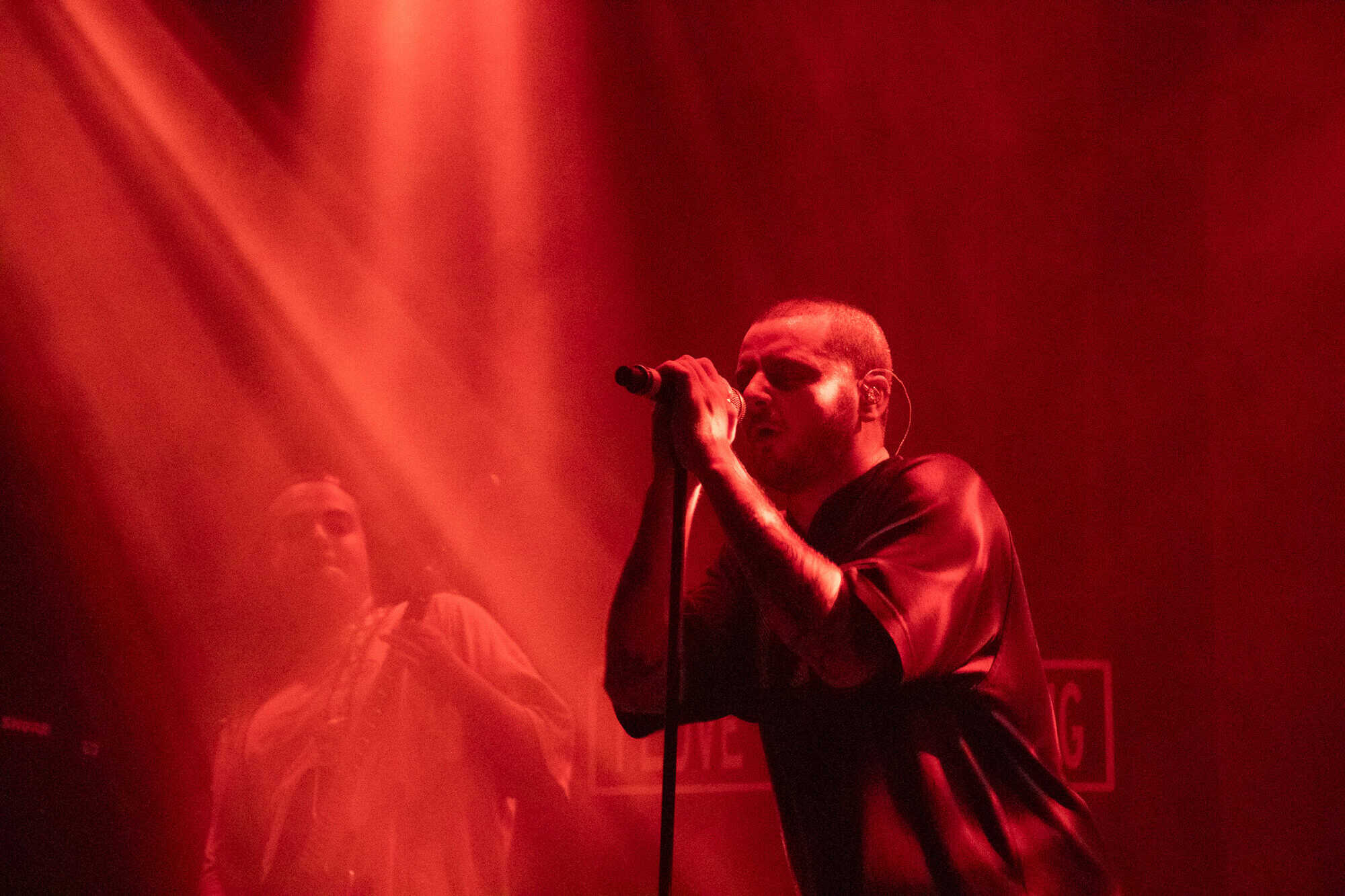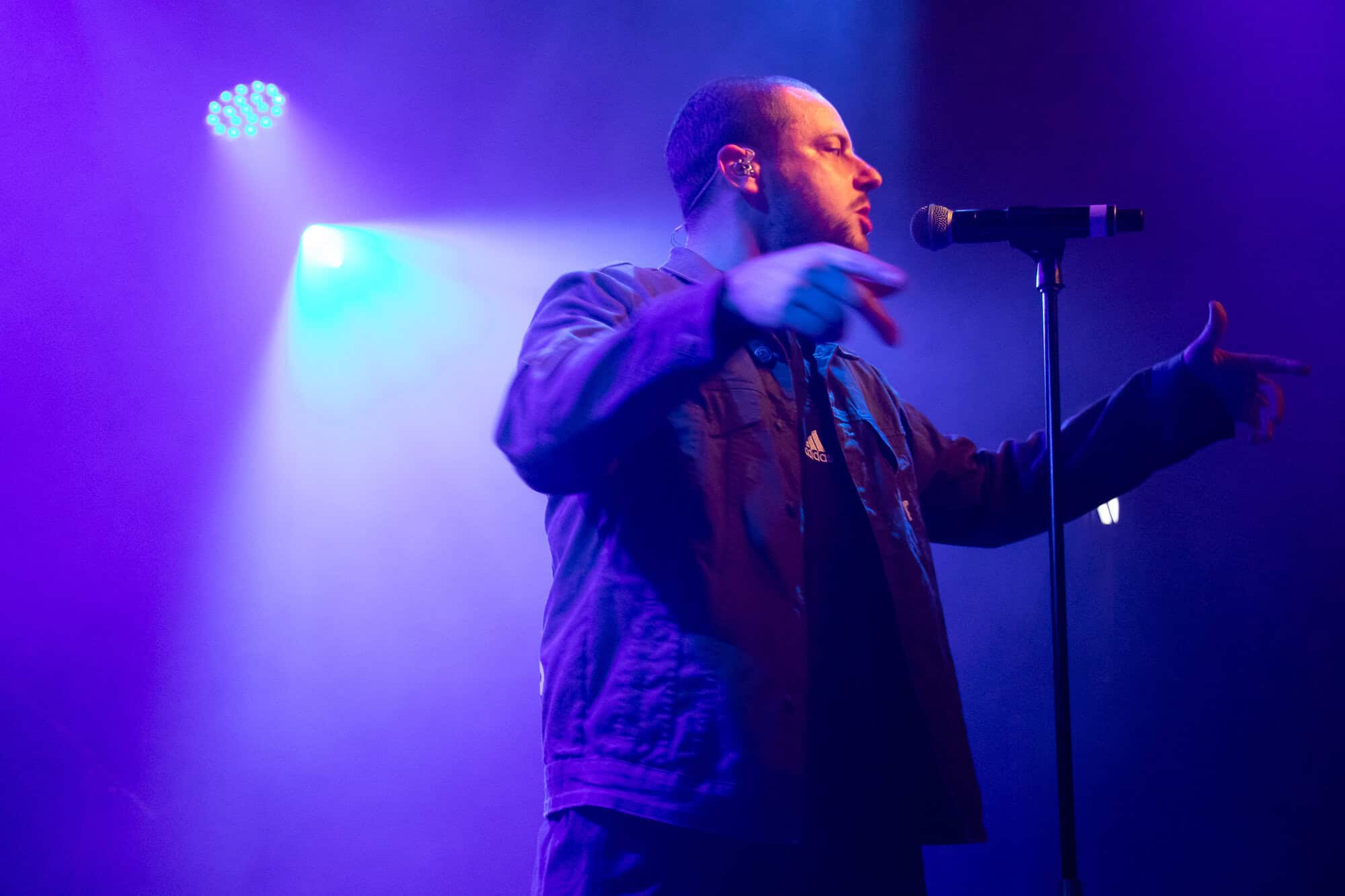 I had been curious as to how the recordings were going to translate to the live show. On stage grandson was accompanied by a two-piece band Tobias Kelly on the drums and Leo Varella on guitar; their sound further substantiated by the occasional pre-recorded backing vocal and bass track. Tobias literally didn’t miss a beat, playing to a click track in his headphones the entire show, whereas Leo frequently bent his guitar sound into a more primal and singular interpretation of the array of sounds we hear across the album versions’ counterparts. Grandson’s emphasis and vocal delivery had a punk rock aesthetic, a raw intensity that served to rachet up and maintain the energy in the room. He gave an extremely physical performance throwing his entire body behind his voice; banging his head, swinging his limbs, and bouncing from his centred mic stand to each corner of the stage and back again.