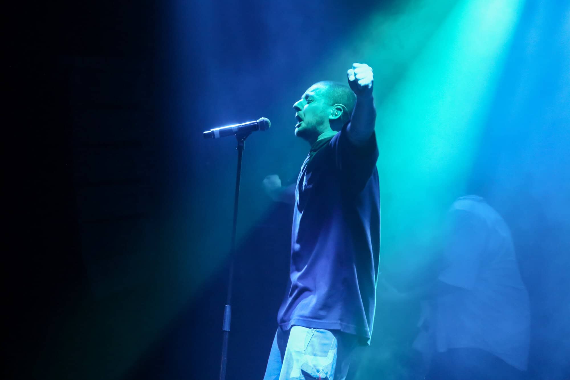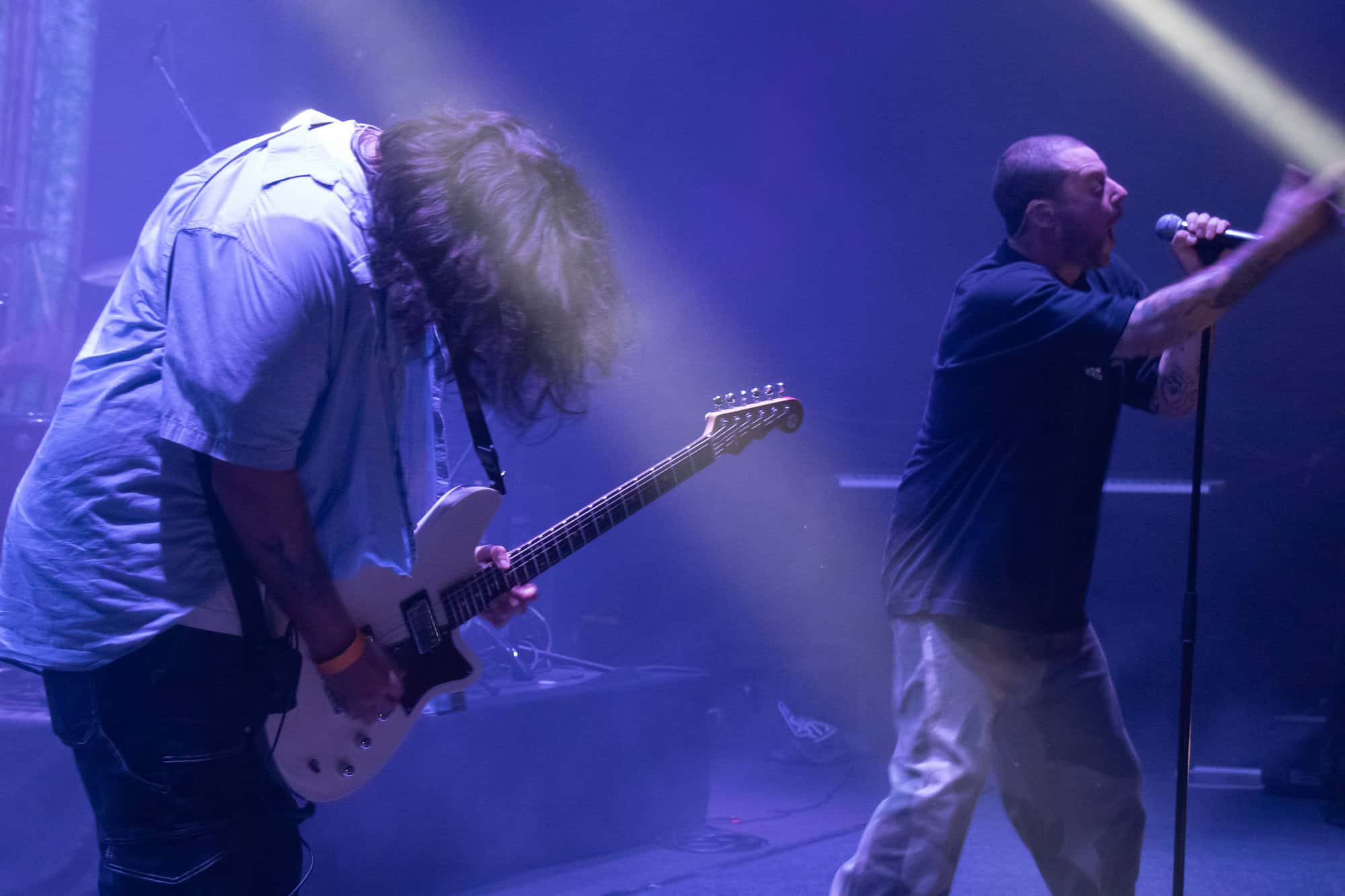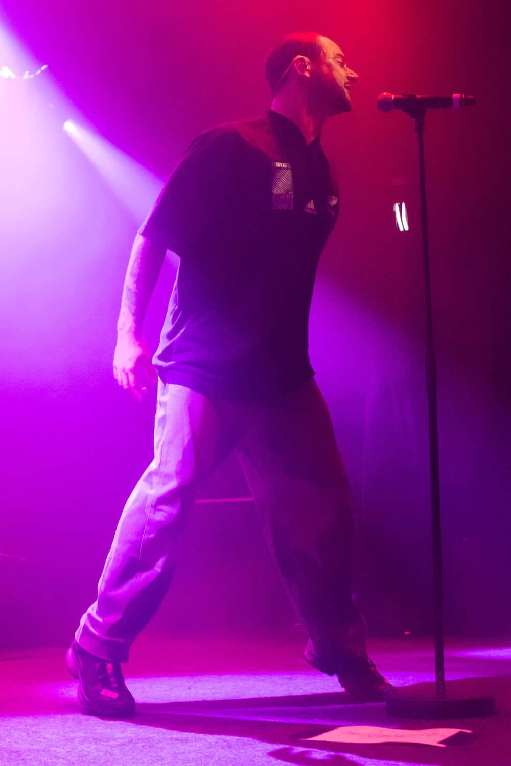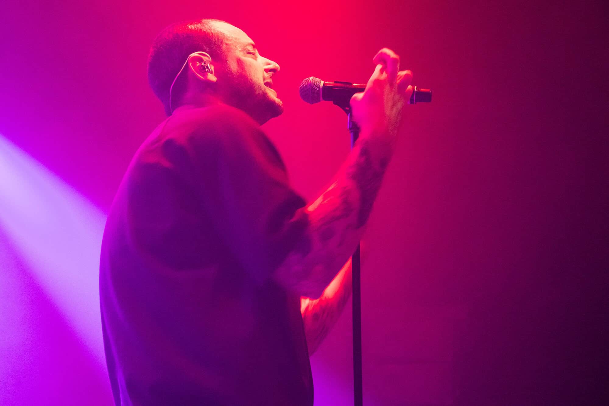 I had been curious as to how the recordings were going to translate to the live show. On stage grandson was accompanied by a two-piece band Tobias Kelly on the drums and Leo Varella on guitar; their sound further substantiated by the occasional pre-recorded backing vocal and bass track. Tobias literally didn’t miss a beat, playing to a click track in his headphones the entire show, whereas Leo frequently bent his guitar sound into a more primal and singular interpretation of the array of sounds we hear across the album versions’ counterparts. Grandson’s emphasis and vocal delivery had a punk rock aesthetic, a raw intensity that served to rachet up and maintain the energy in the room. He gave an extremely physical performance throwing his entire body behind his voice; banging his head, swinging his limbs, and bouncing from his centred mic stand to each corner of the stage and back again.