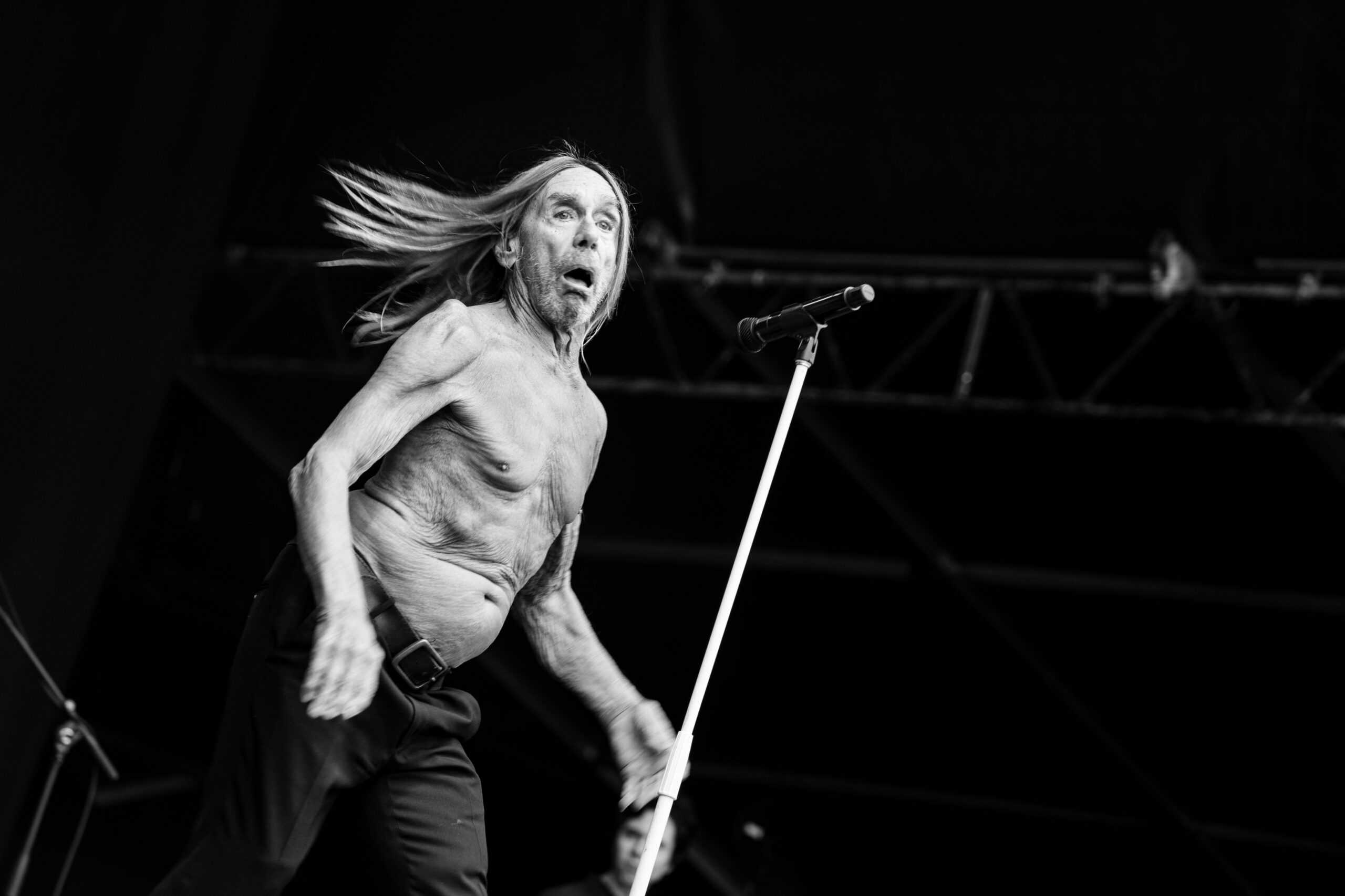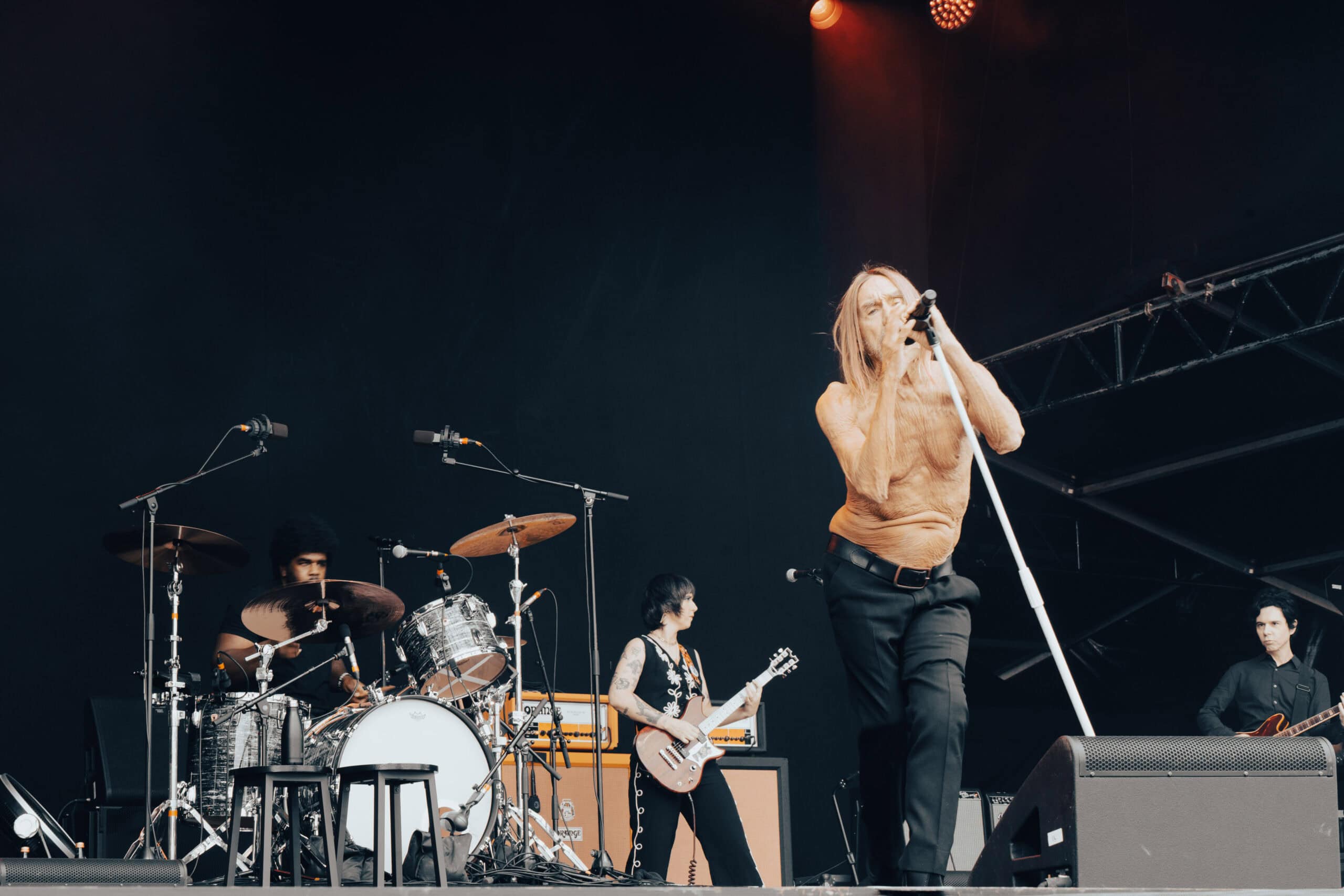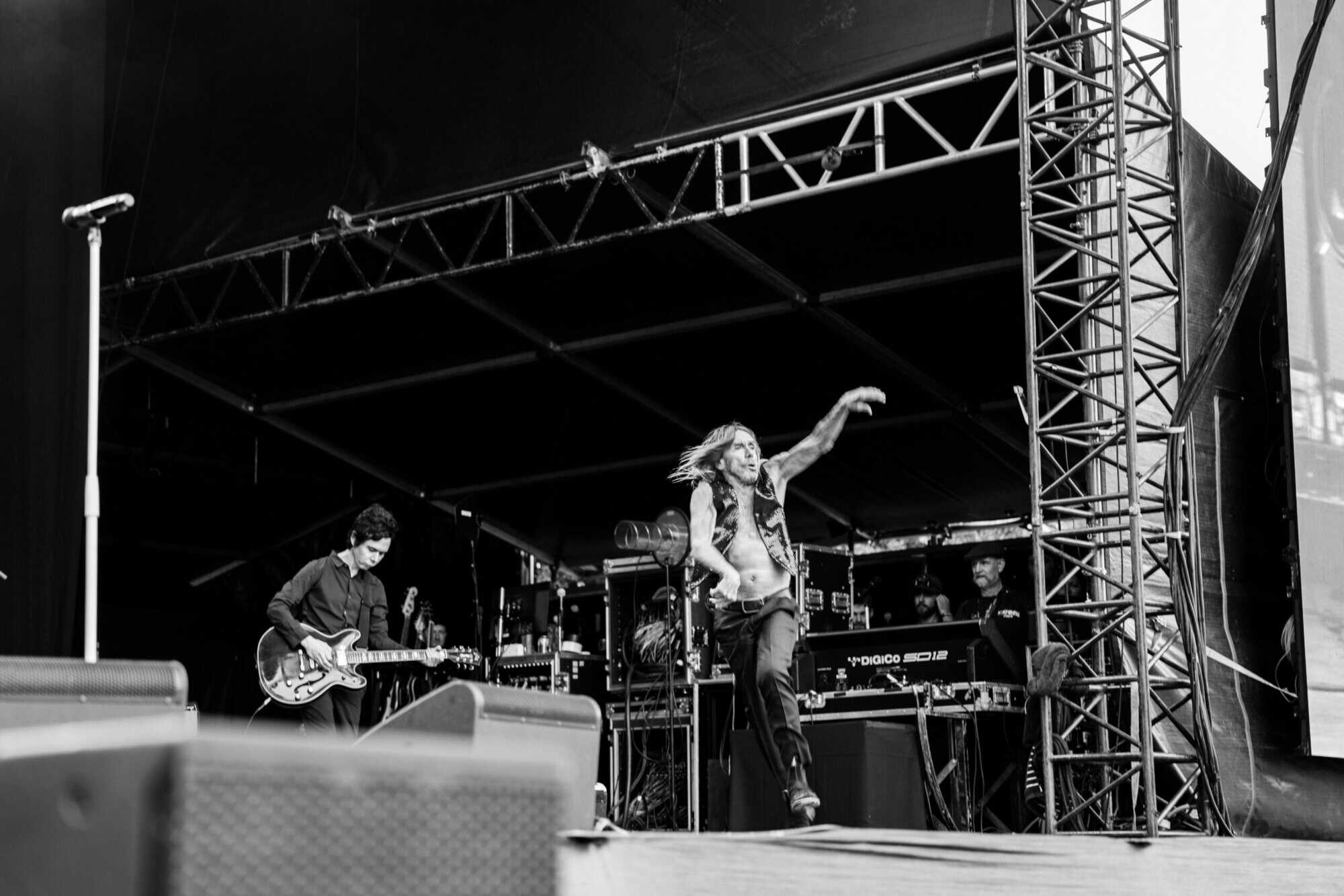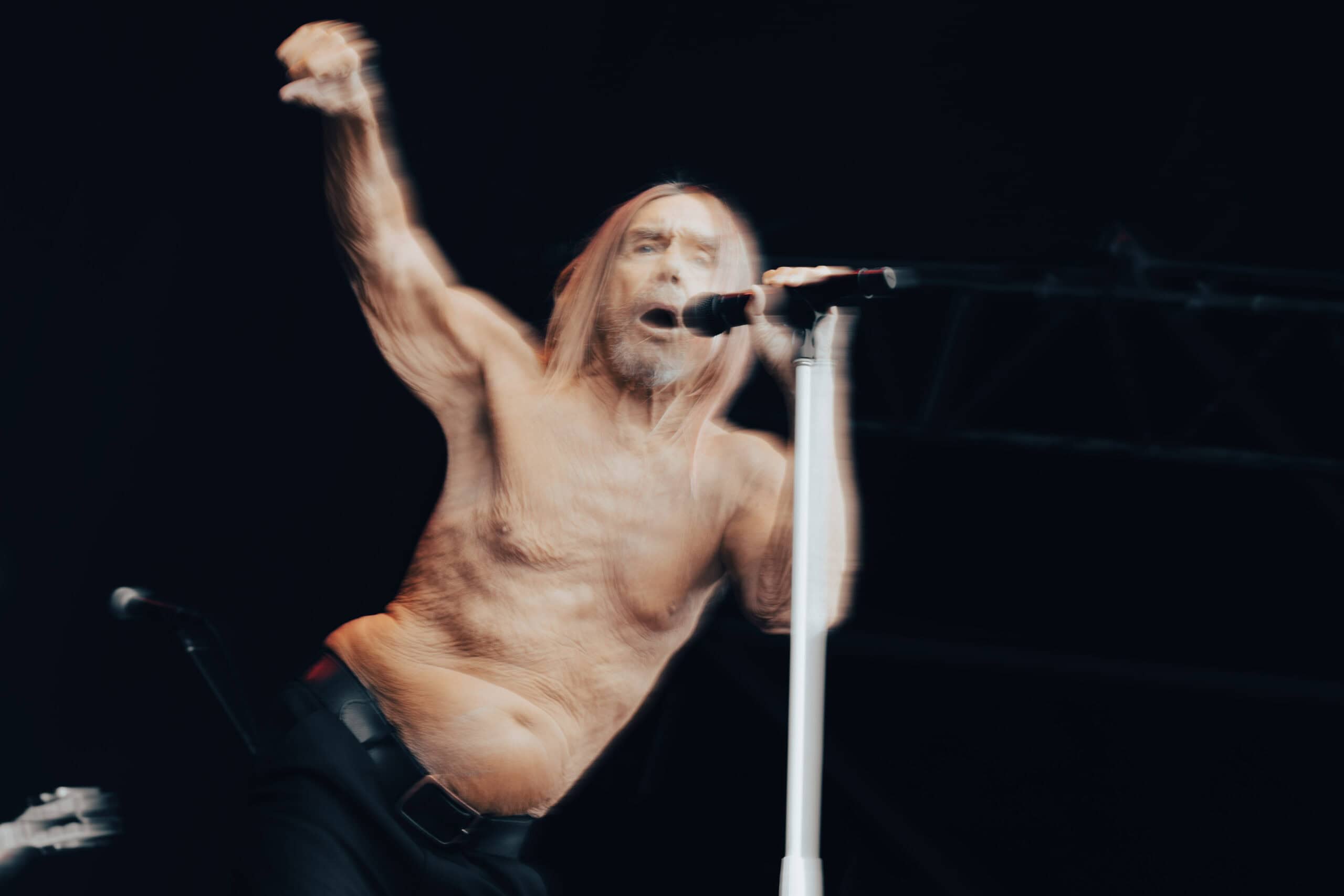 Iggy brought a luxury seven-piece band to the stage, including two guitars, a bass, a drum kit, and two trumpets. Once the musicians were ready, he ran to the center of the stage in a sequin jacket. He grabbed the mic with a death grip. The first song was T.V. Eye from The Stooges. The crowd rushed in from everywhere. People were screaming and waving their fists in the air. He ran to the right of the stage and then to the left. His energy was unbelievable. The photographers were going crazy, switching angles constantly because they were afraid to miss a single second of this rare performance. Yes, Iggy Pop is showing us how it is done.