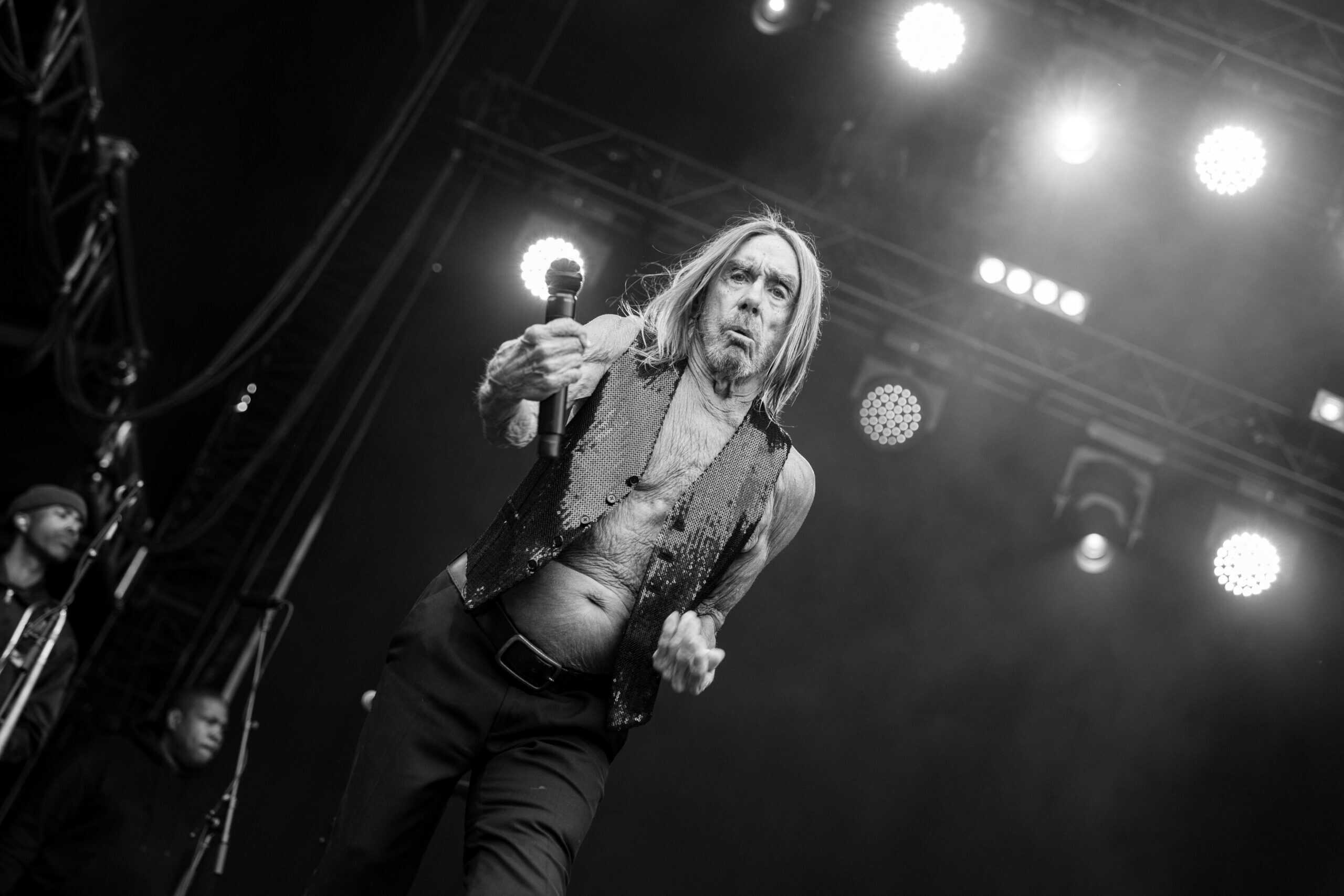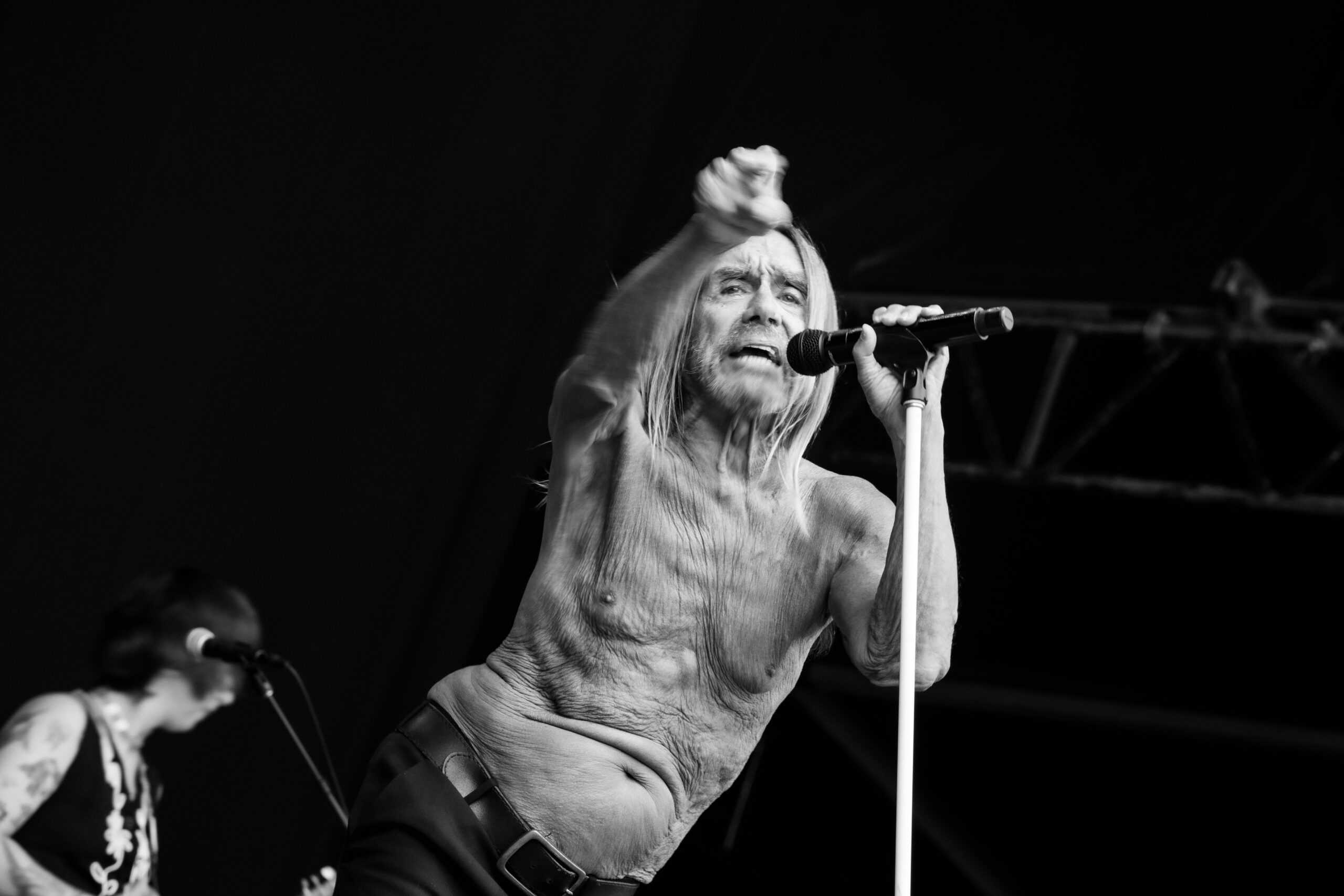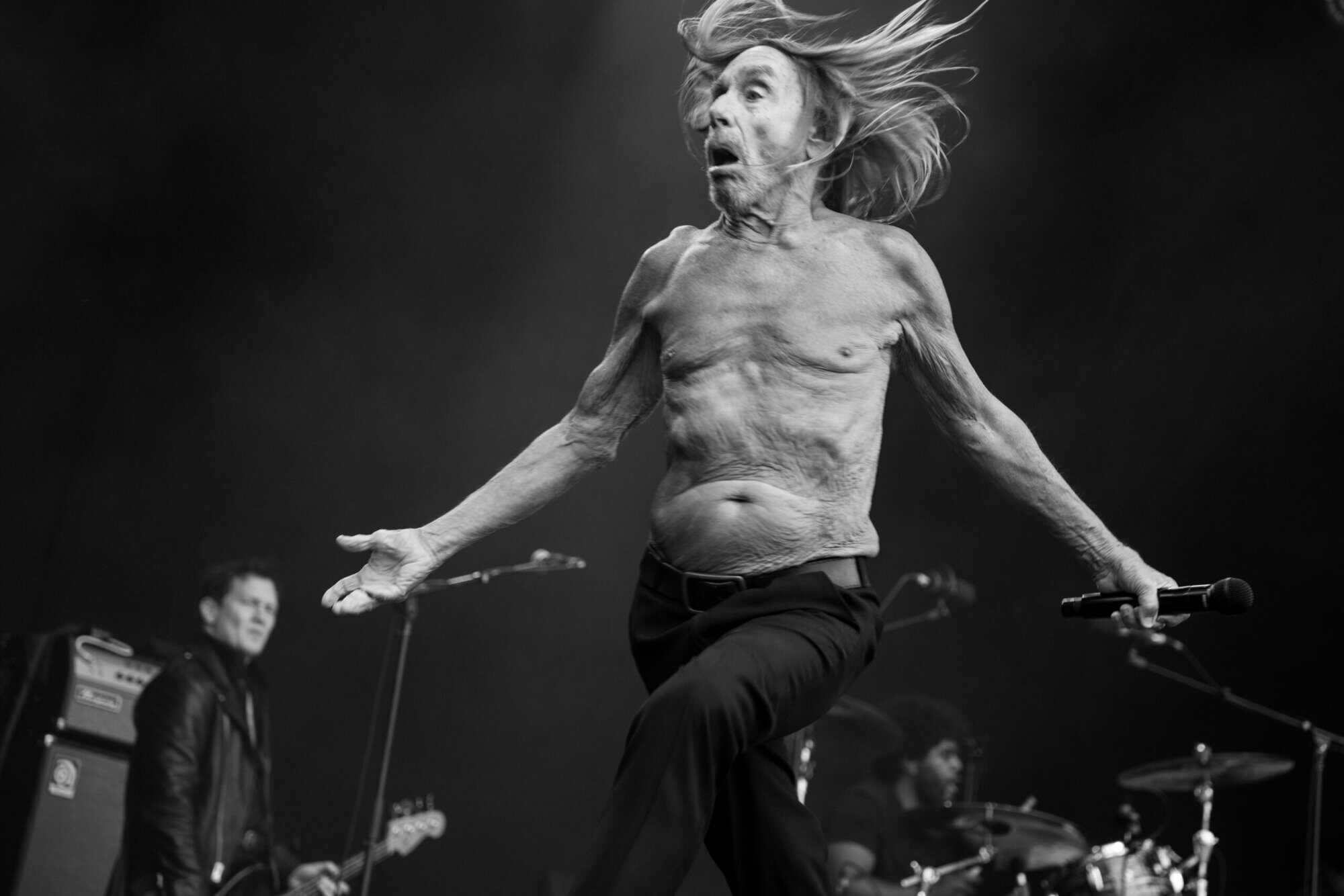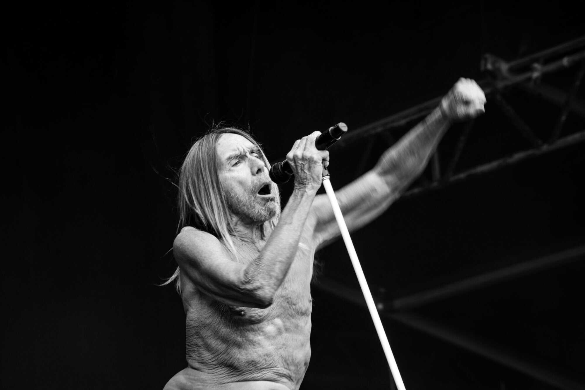 Iggy brought a luxury seven-piece band to the stage, including two guitars, a bass, a drum kit, and two trumpets. Once the musicians were ready, he ran to the center of the stage in a sequin jacket. He grabbed the mic with a death grip. The first song was T.V. Eye from The Stooges. The crowd rushed in from everywhere. People were screaming and waving their fists in the air. He ran to the right of the stage and then to the left. His energy was unbelievable. The photographers were going crazy, switching angles constantly because they were afraid to miss a single second of this rare performance. Yes, Iggy Pop is showing us how it is done.