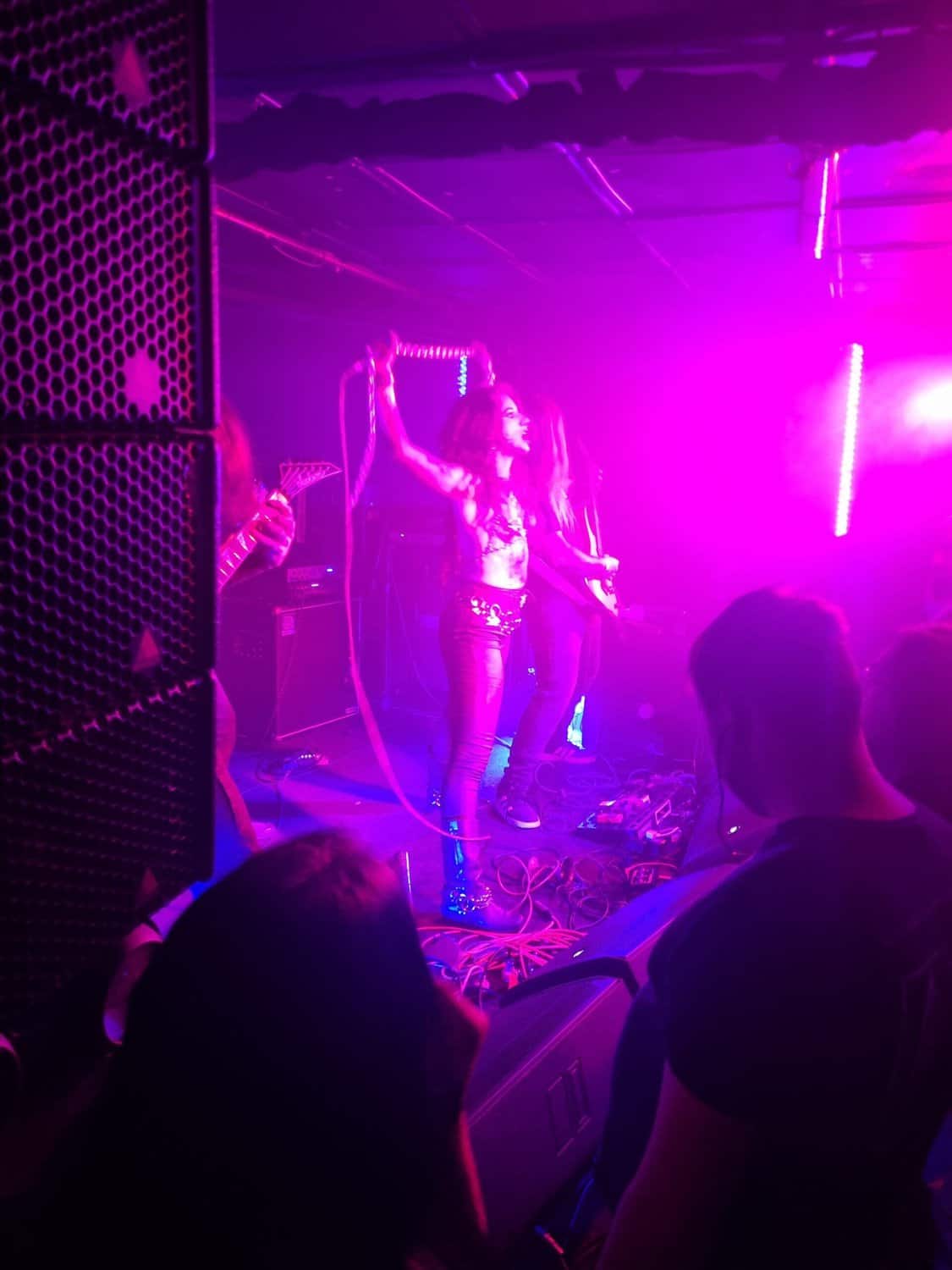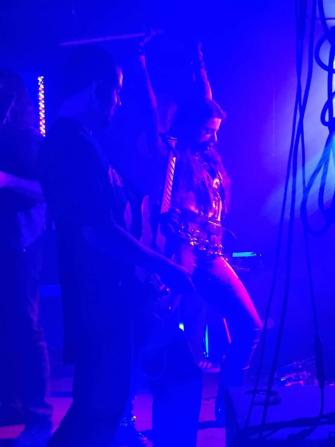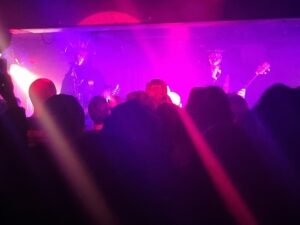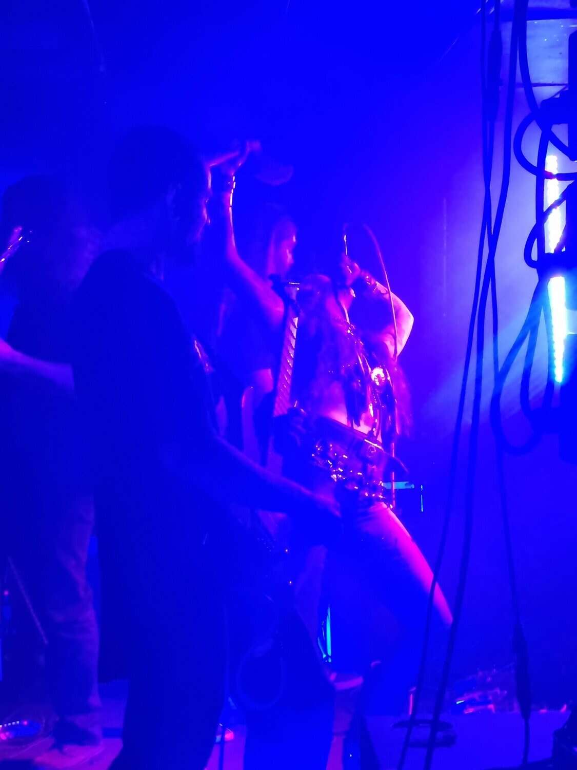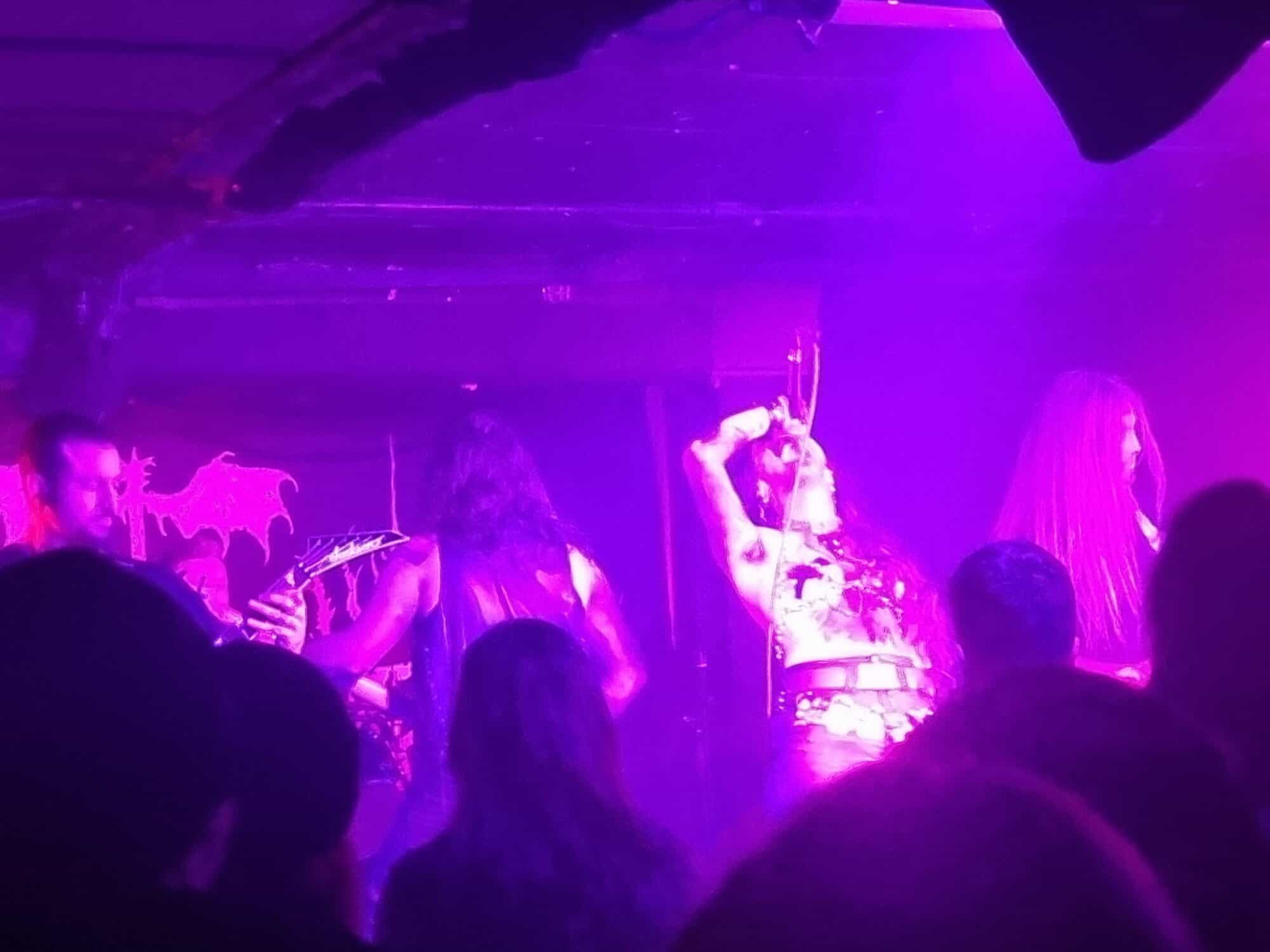 There are theatrics astride the stage, the four guys stand with their backs as theme music plays, then their singer joins them onstage, draped in the garb of Black-Metal, war-axe in one hand and (possibly fake blood) in other, soon to be poured down her face. Windswept live up immediately to their reputation, as growl-scream vocals shaft over a wall of rhythms and noise. In the audience, the purists are enamoured, and it’s impossible to get to front of stage.