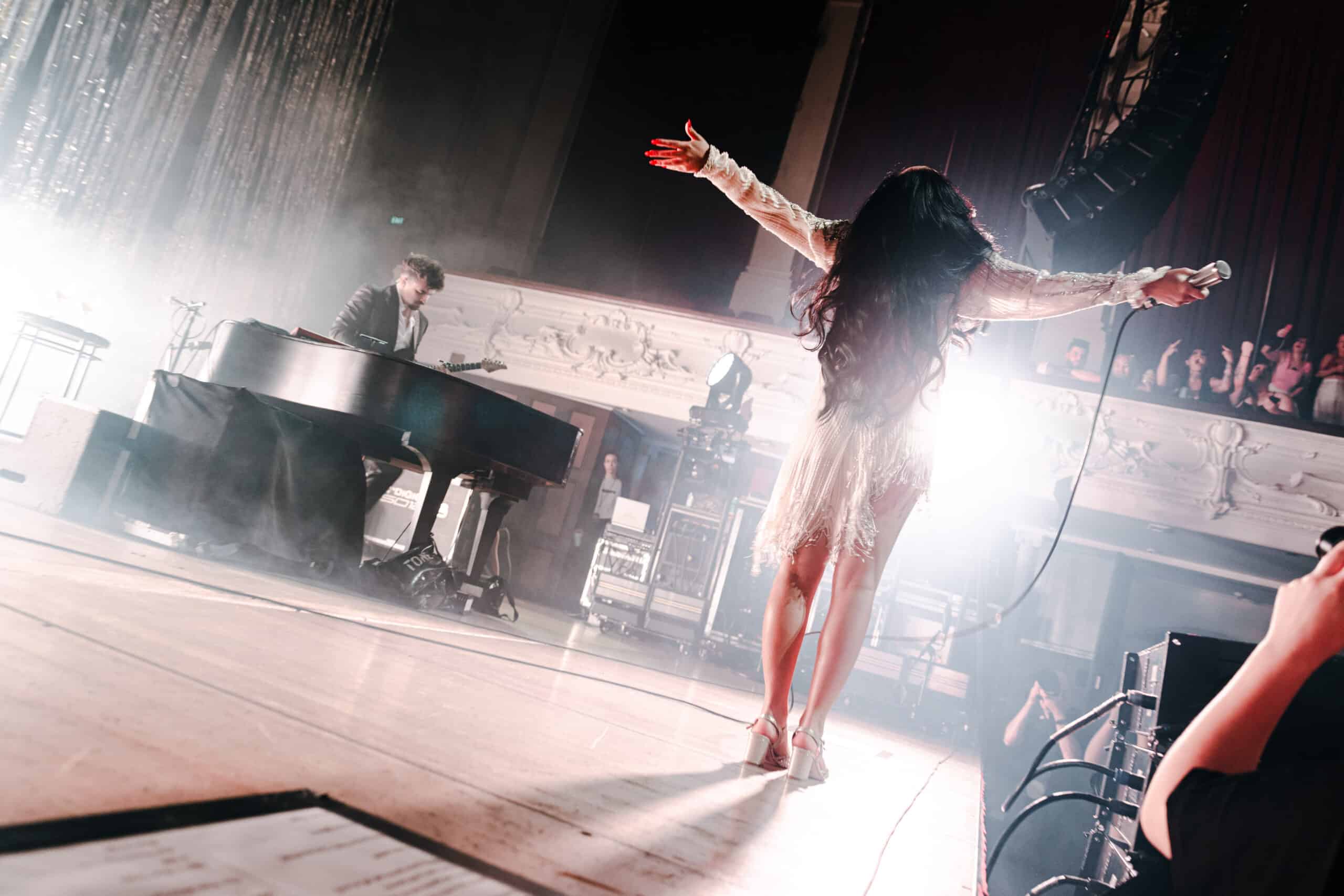 She greeted the crowd for the first time, shouting out New Zealand, before launching into the record’s defining track, Sex Hysteria. The response was instantaneous—a deafening, chest-shaking sing-along from every corner of the hall. Jessie handed her mic to the fans with no hesitation, letting them take the reins. Even Haven got caught in the surge, planting one foot on the piano, while Jessie dropped to her knees, arched back, and held the microphone high above her head. It was a frame-worthy moment, the kind that imprints itself into the collective memory of a tour. The show had hit its first true peak.