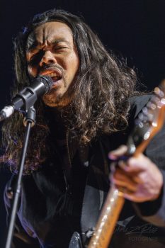 Throughout the set, frontman Dougy Mandagi takes off his guitar and pulls apart one of the drum kits on stage, salvaging a floor drum and cymbals to join Toby Dundas on drums as a supportive percussionist.