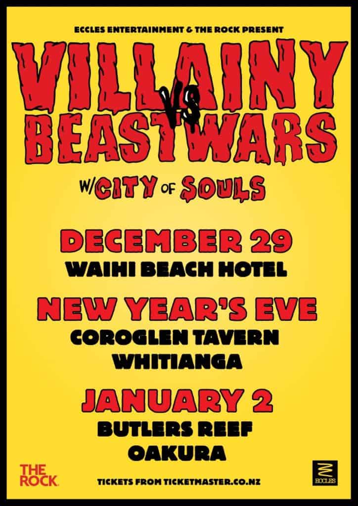 Catch Villainy, Beastwars and City of Souls at Waihi Beach Hotel on December 29; Coroglen Tavern on December 31 (New Year’s Eve) and Butlers Reef Oakura on January 2.