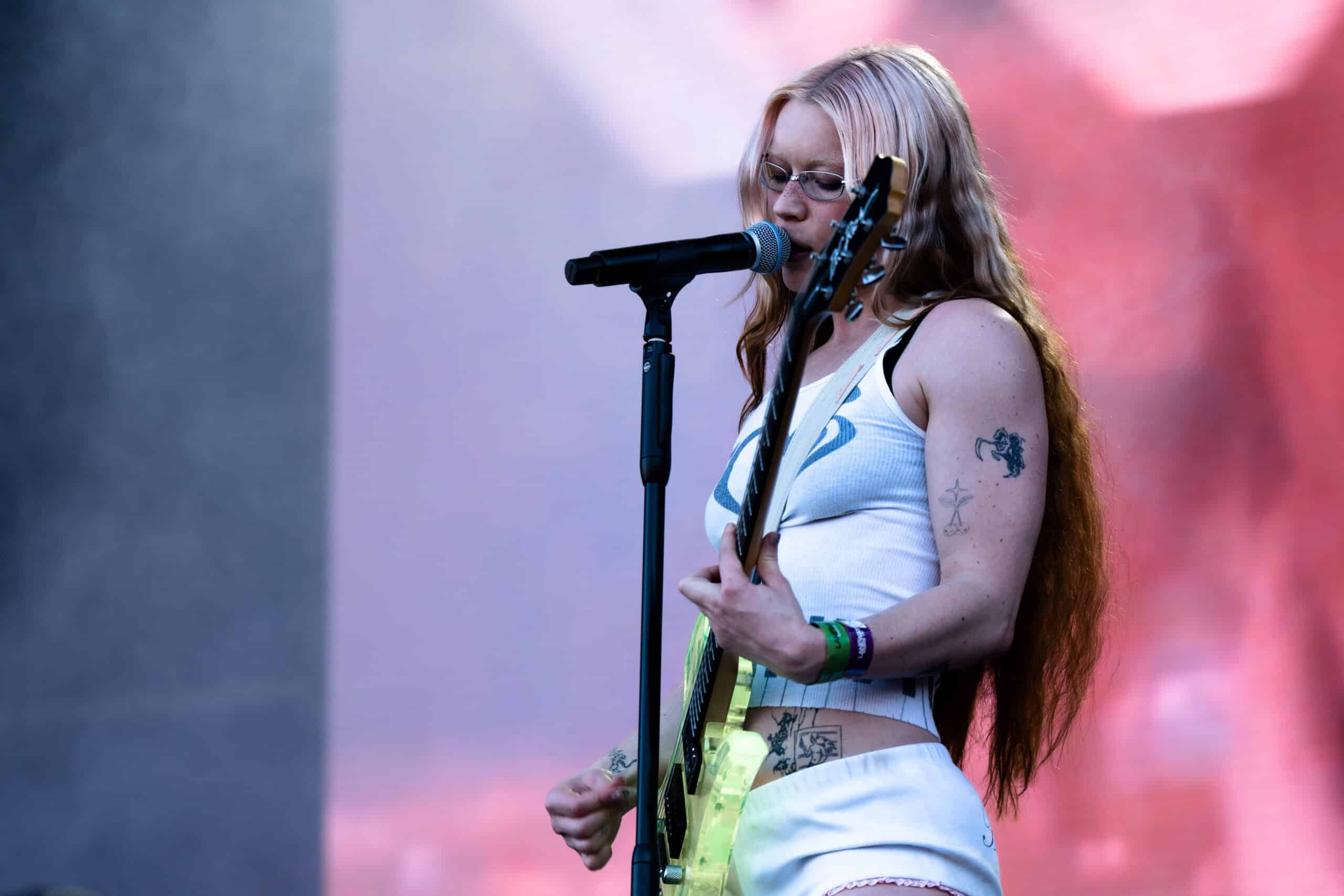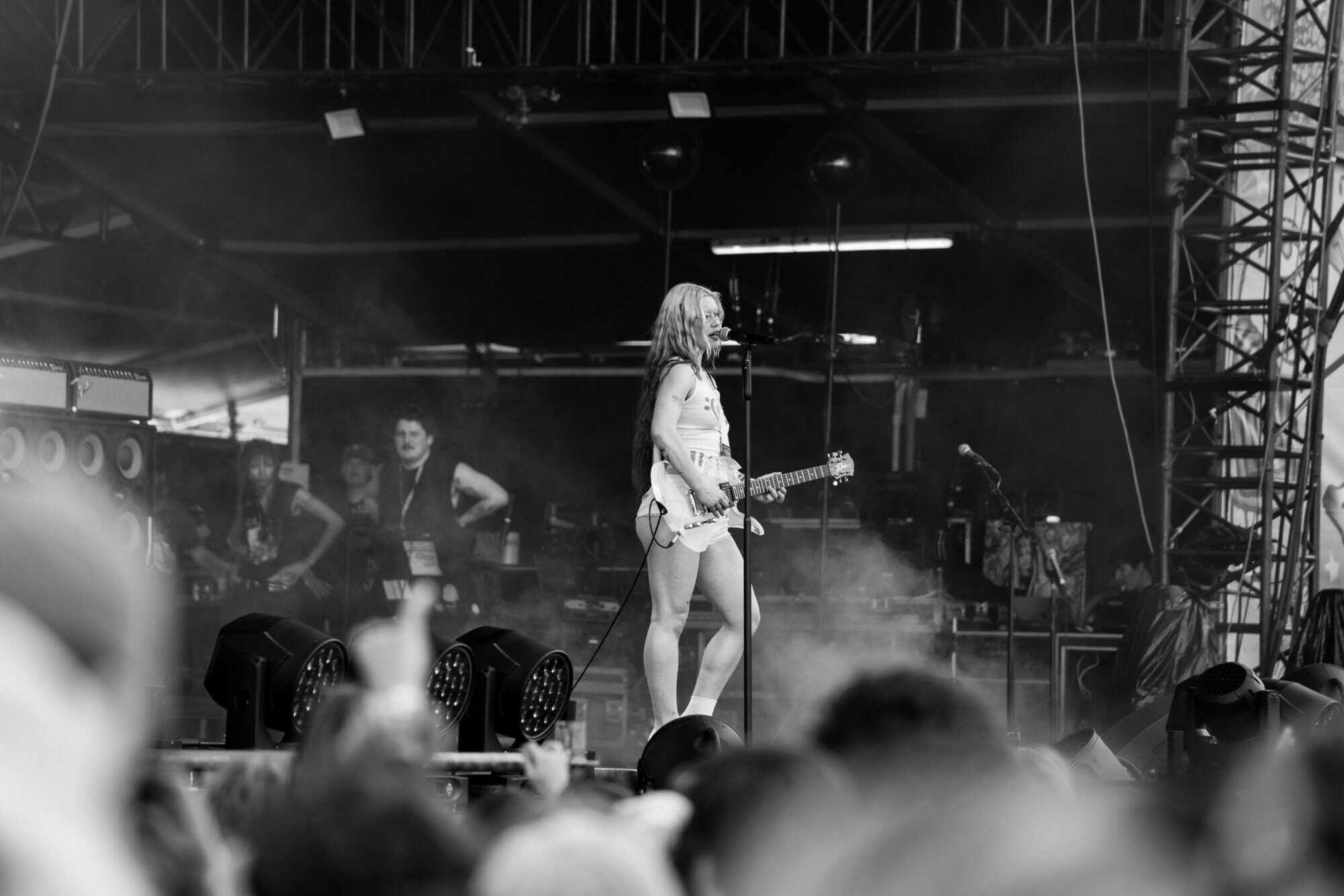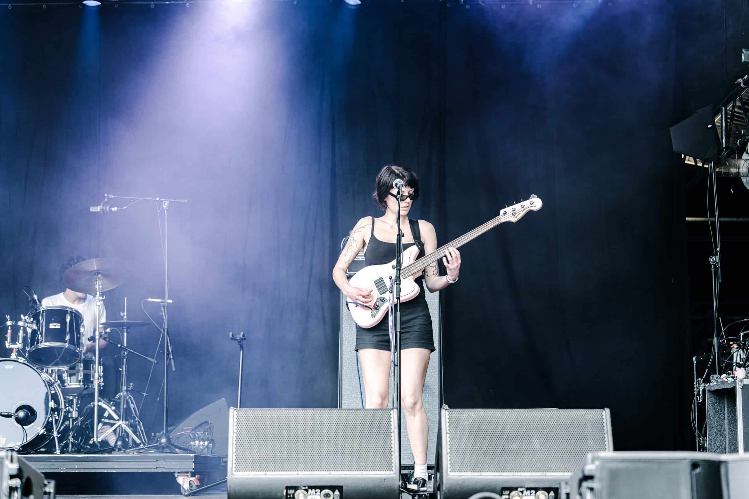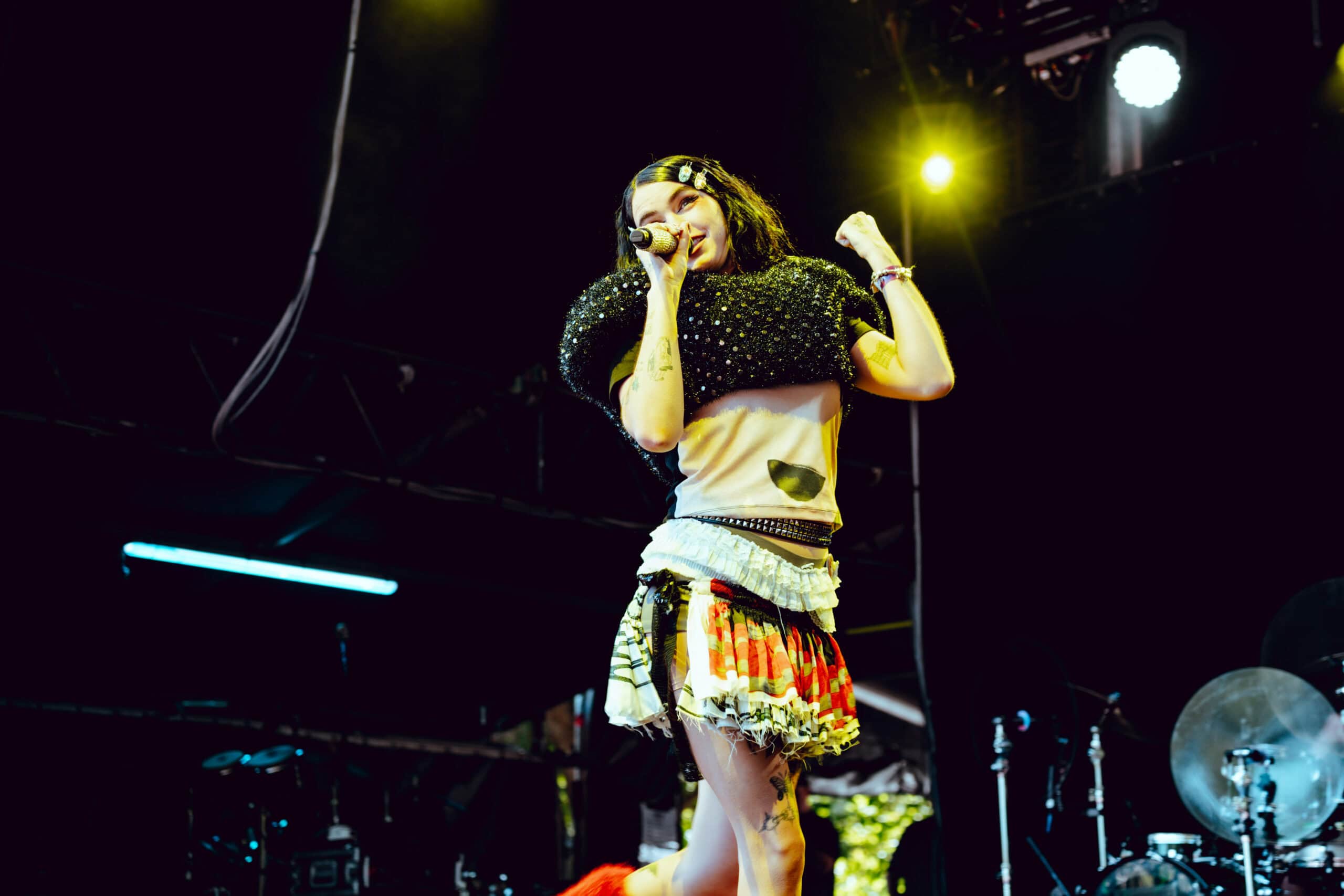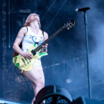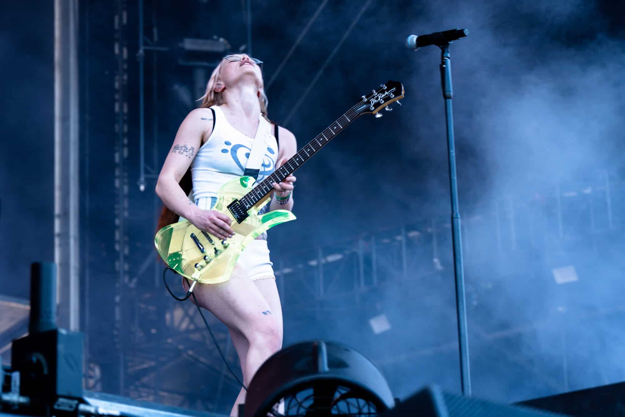 Frontwoman Rhian Teasdale, armed with a transparent neon green guitar, shredded on her knees, strutted the stage’s catwalk, and briefly lost her prescription glasses amongst the chaos. Her outfit — with a bass and treble clef intertwined into a love heart on her chest and “Hardcore For Life” scrawled across the back of her shorts — matched the band’s quirky, overdriven sound. I didn’t know any of the songs, yet I was invested in every single one.