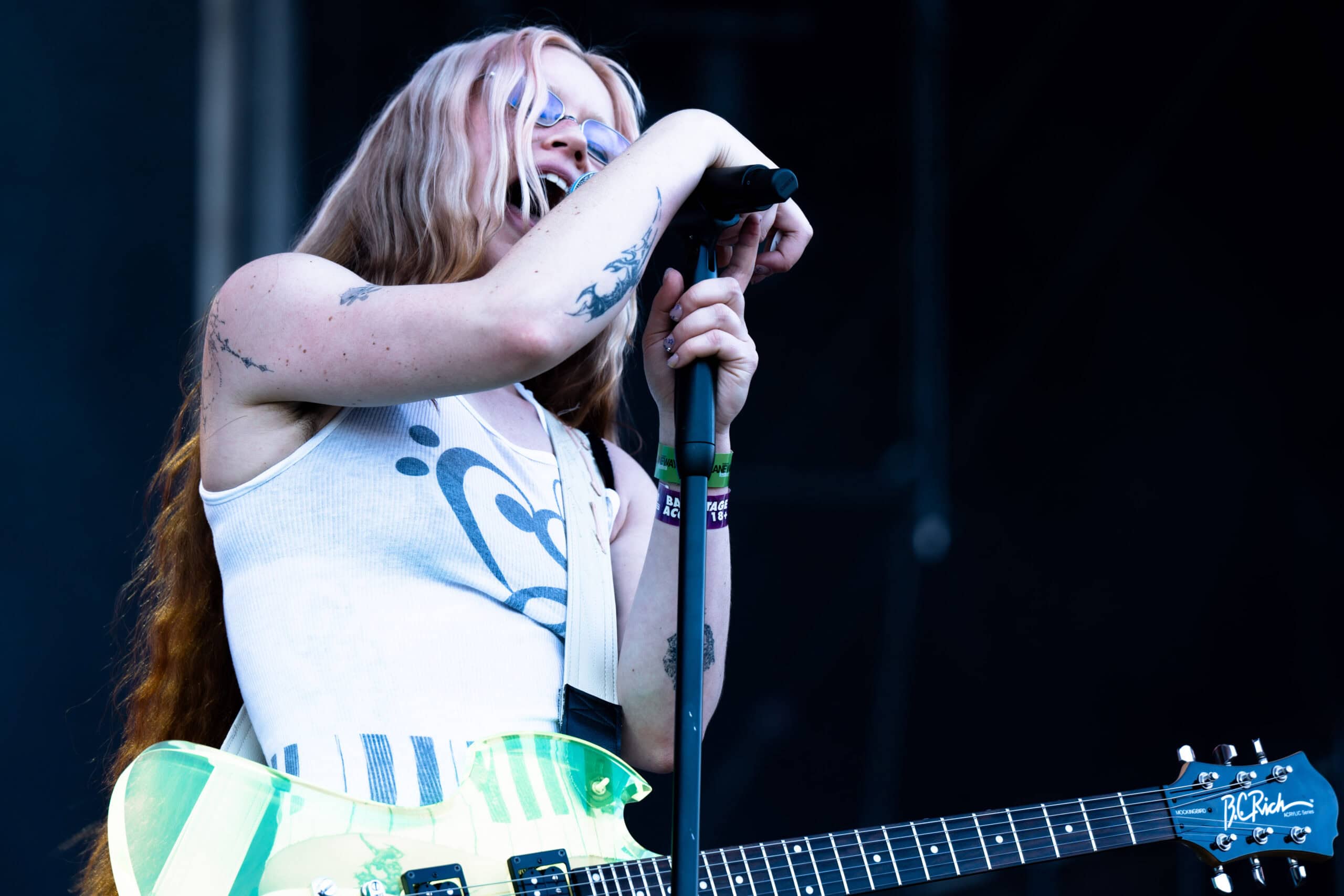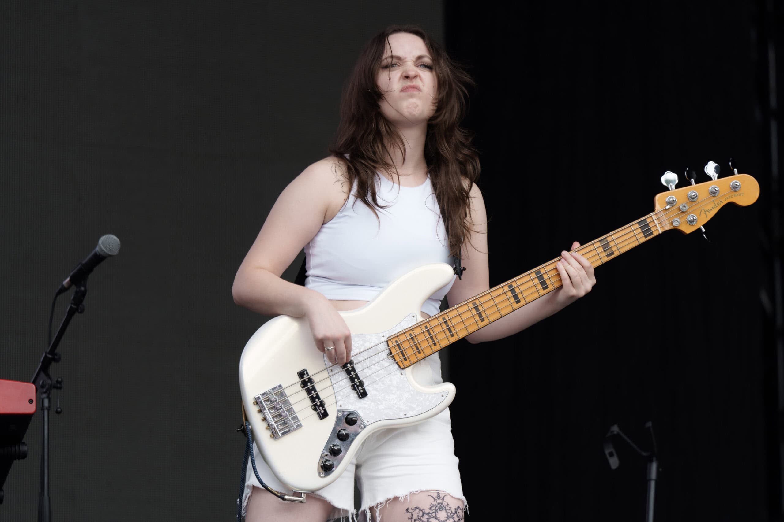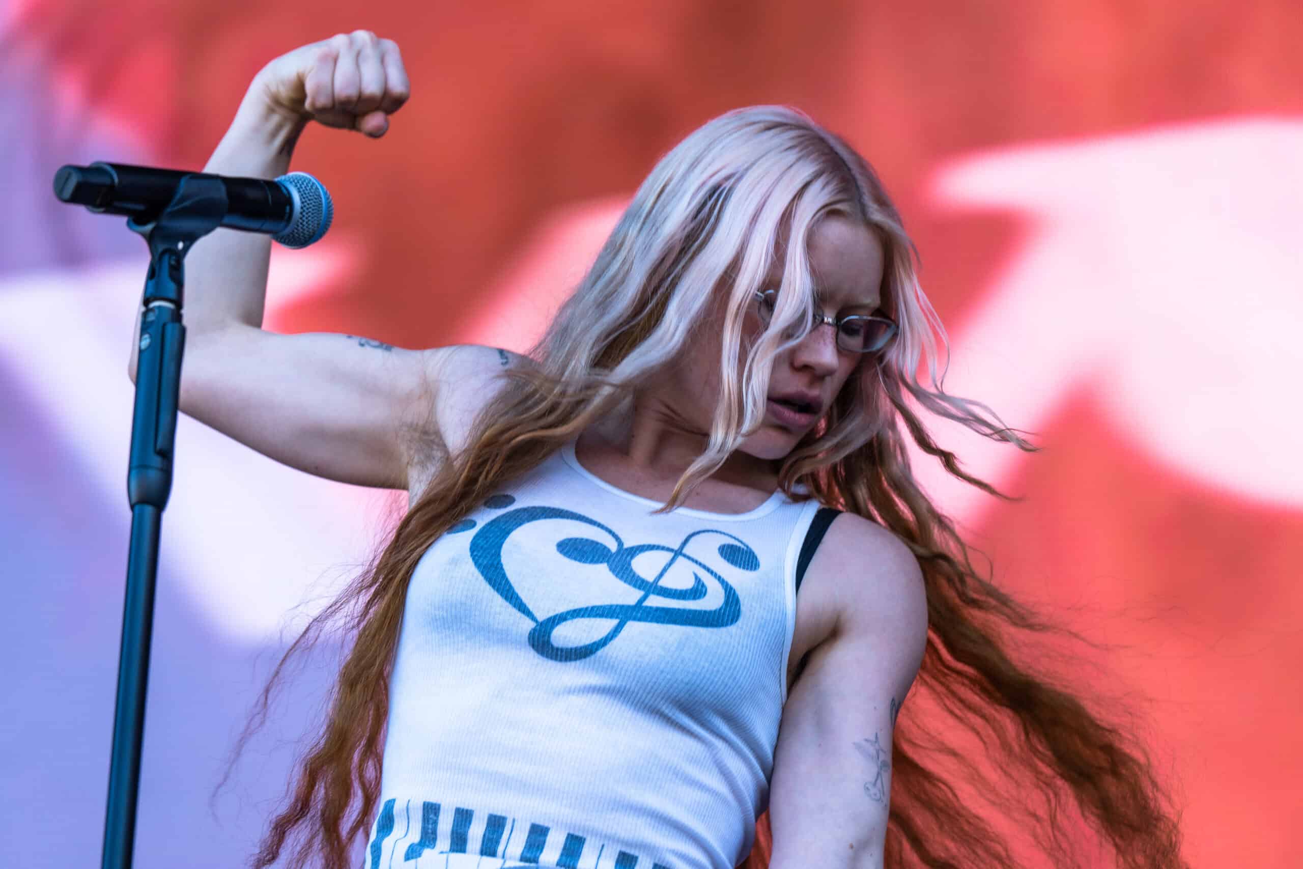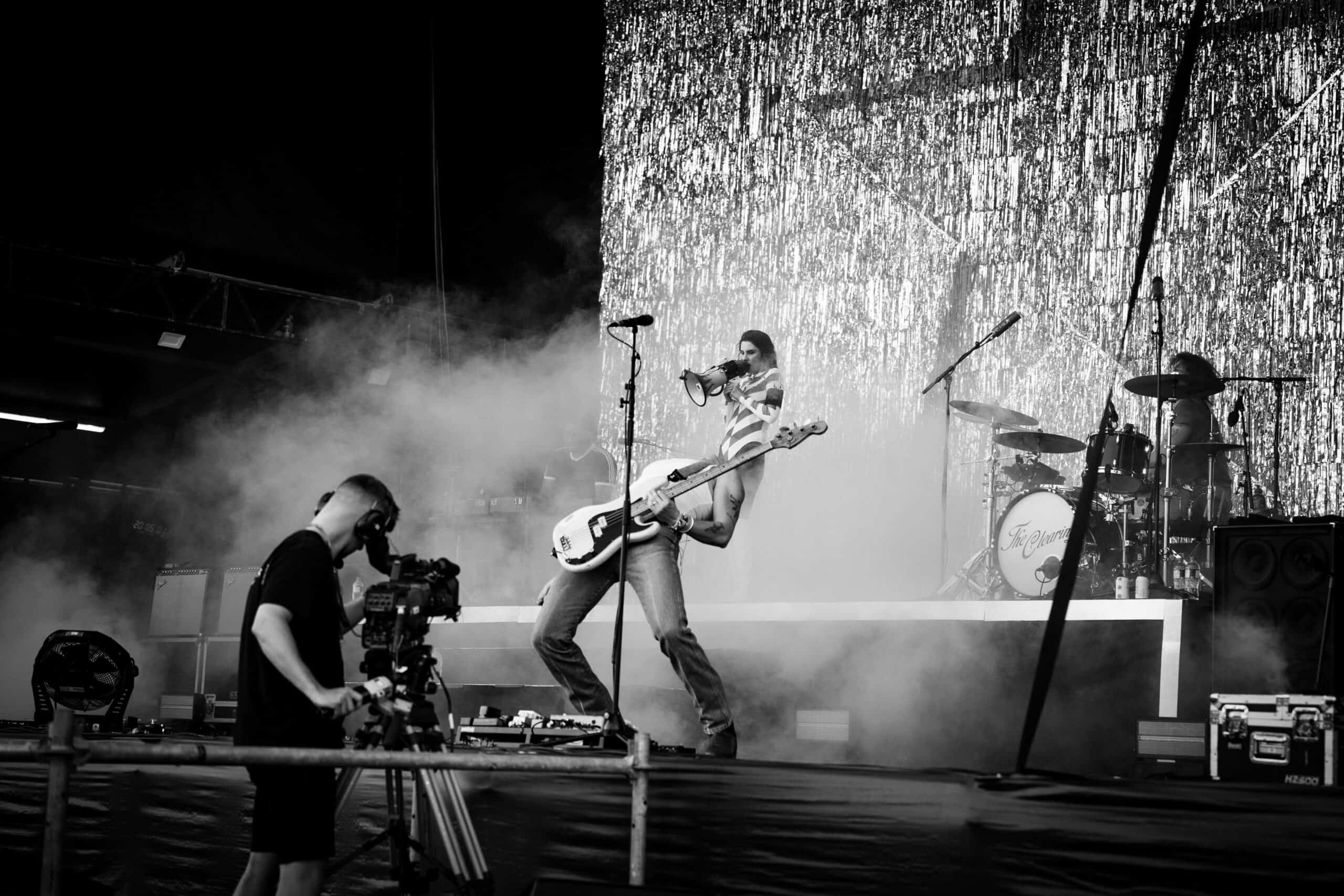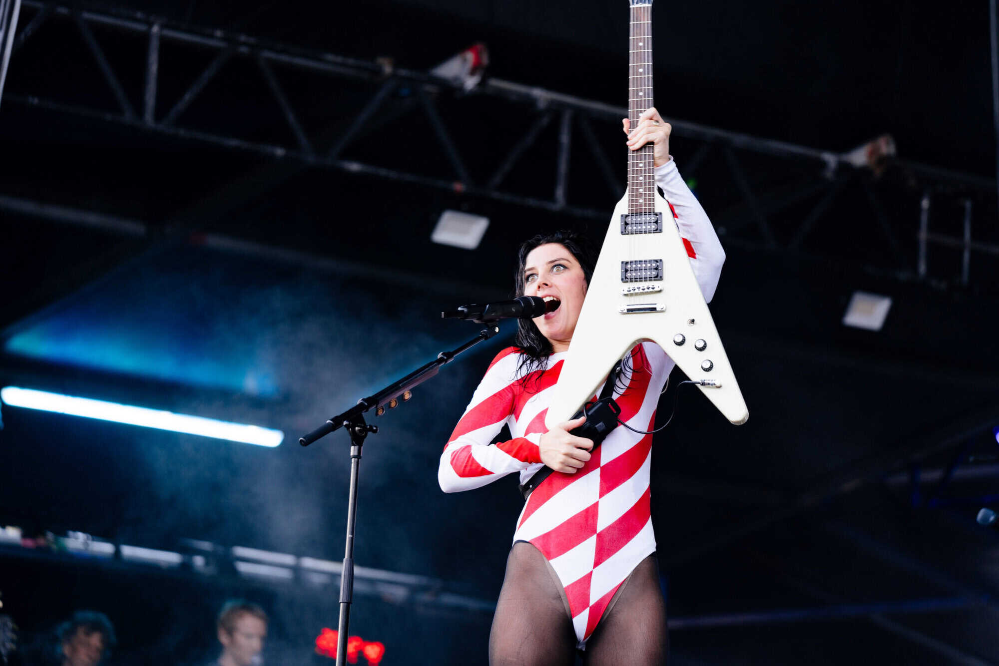 Frontwoman Rhian Teasdale, armed with a transparent neon green guitar, shredded on her knees, strutted the stage’s catwalk, and briefly lost her prescription glasses amongst the chaos. Her outfit — with a bass and treble clef intertwined into a love heart on her chest and “Hardcore For Life” scrawled across the back of her shorts — matched the band’s quirky, overdriven sound. I didn’t know any of the songs, yet I was invested in every single one.