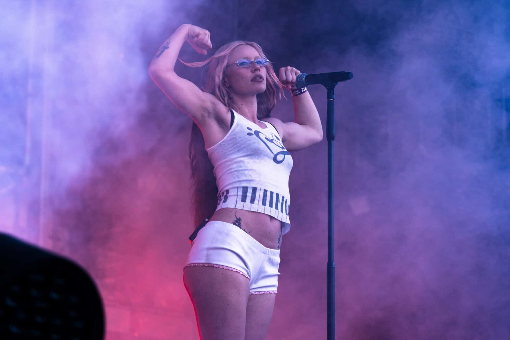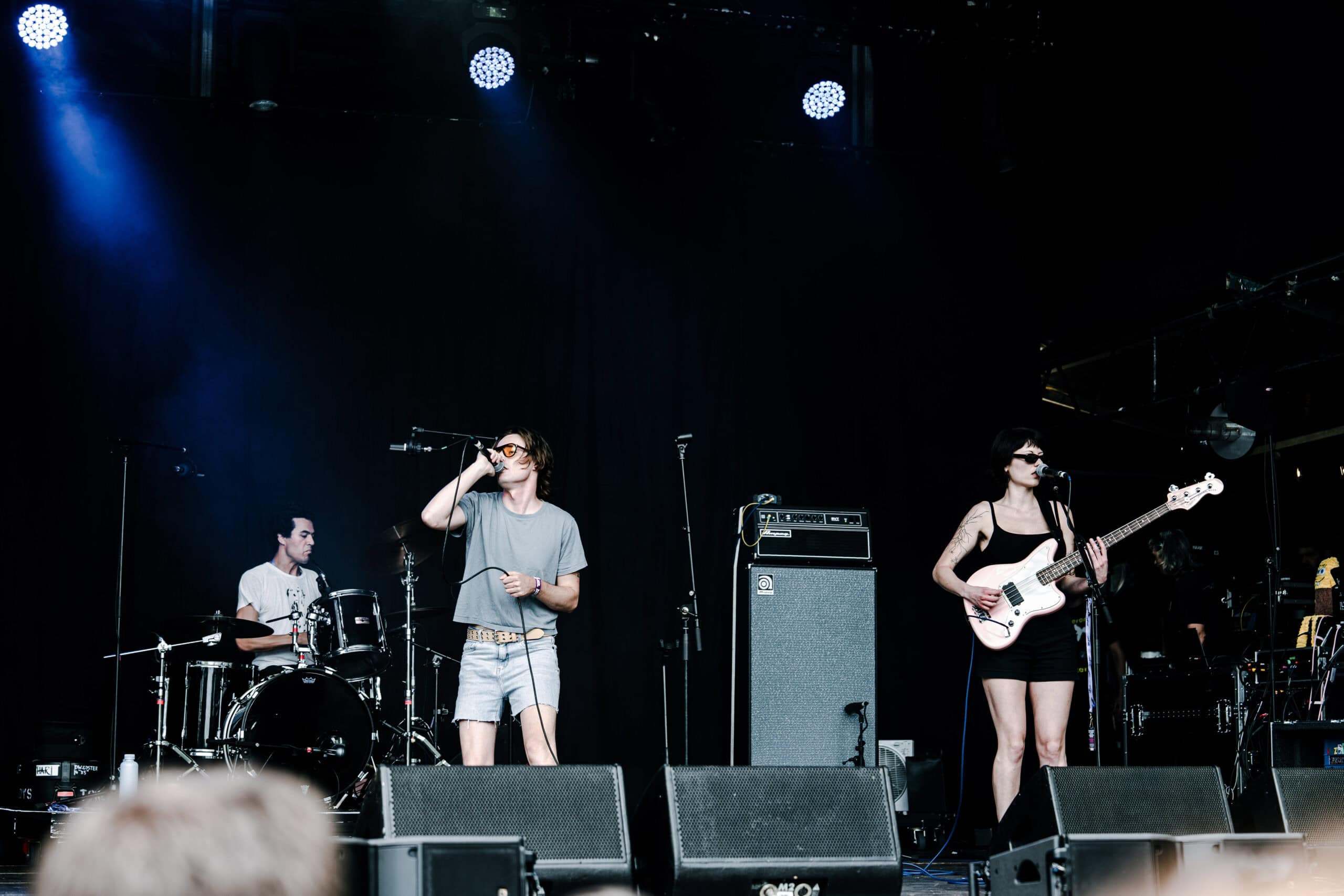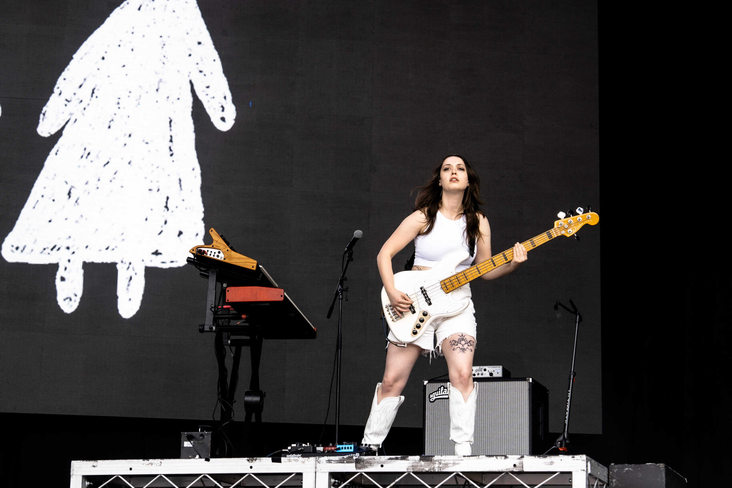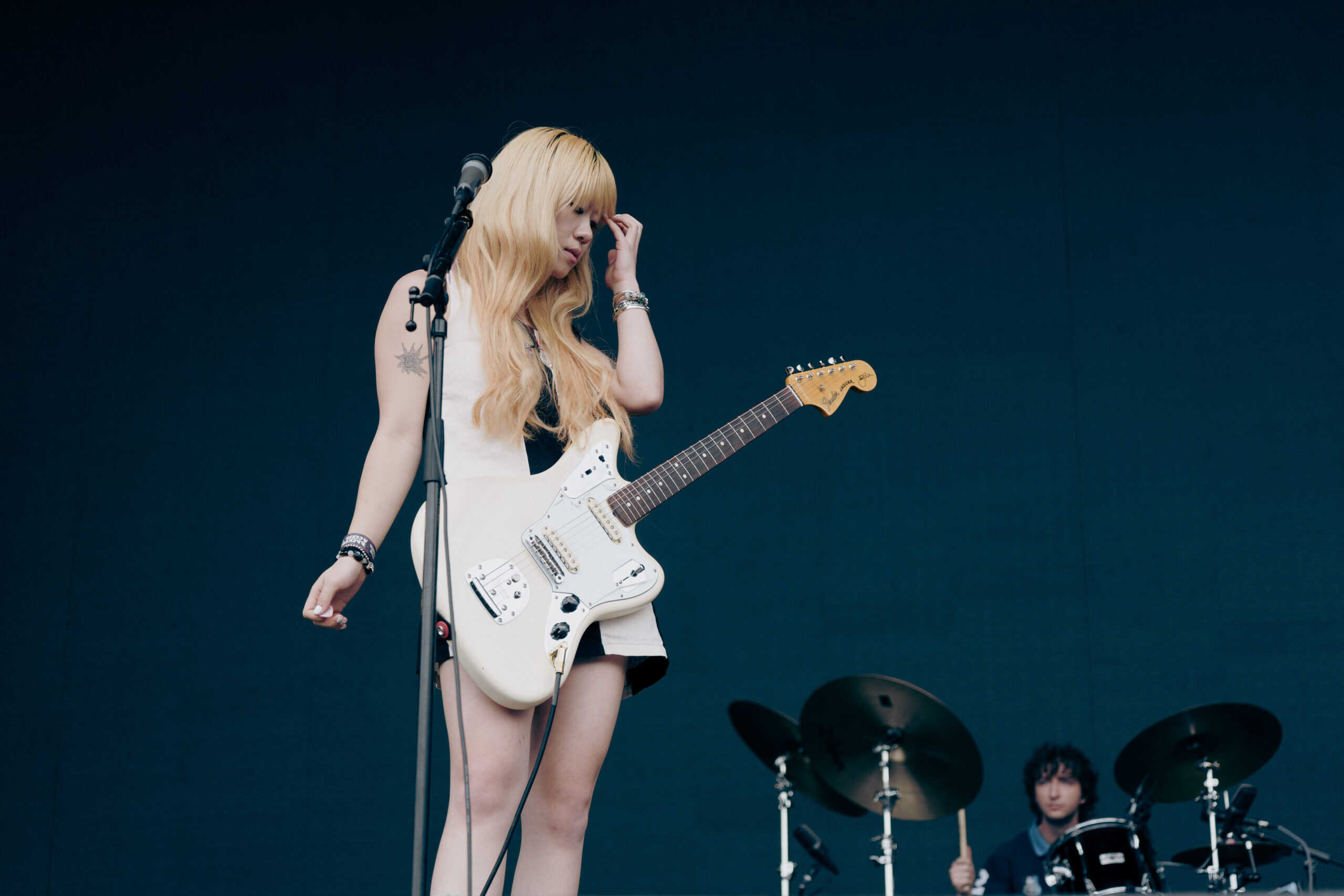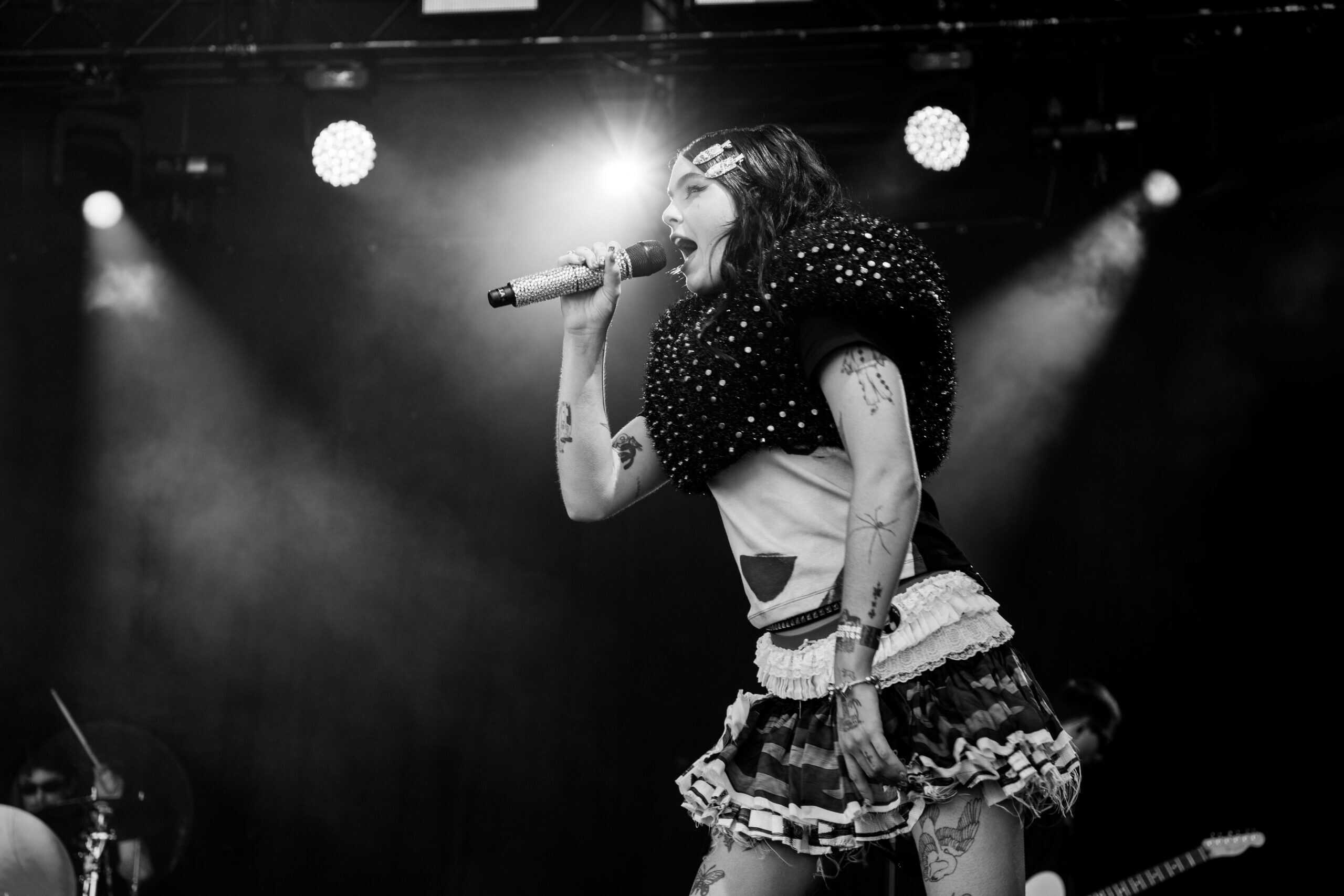 Frontwoman Rhian Teasdale, armed with a transparent neon green guitar, shredded on her knees, strutted the stage’s catwalk, and briefly lost her prescription glasses amongst the chaos. Her outfit — with a bass and treble clef intertwined into a love heart on her chest and “Hardcore For Life” scrawled across the back of her shorts — matched the band’s quirky, overdriven sound. I didn’t know any of the songs, yet I was invested in every single one.