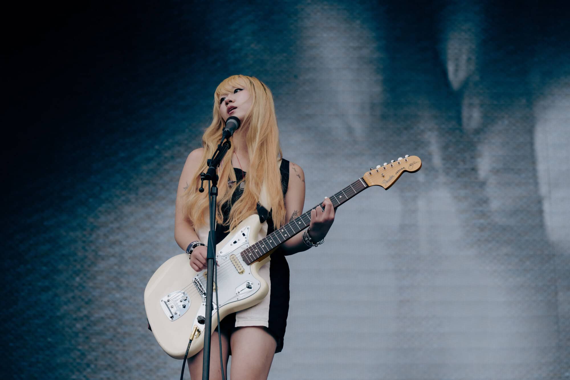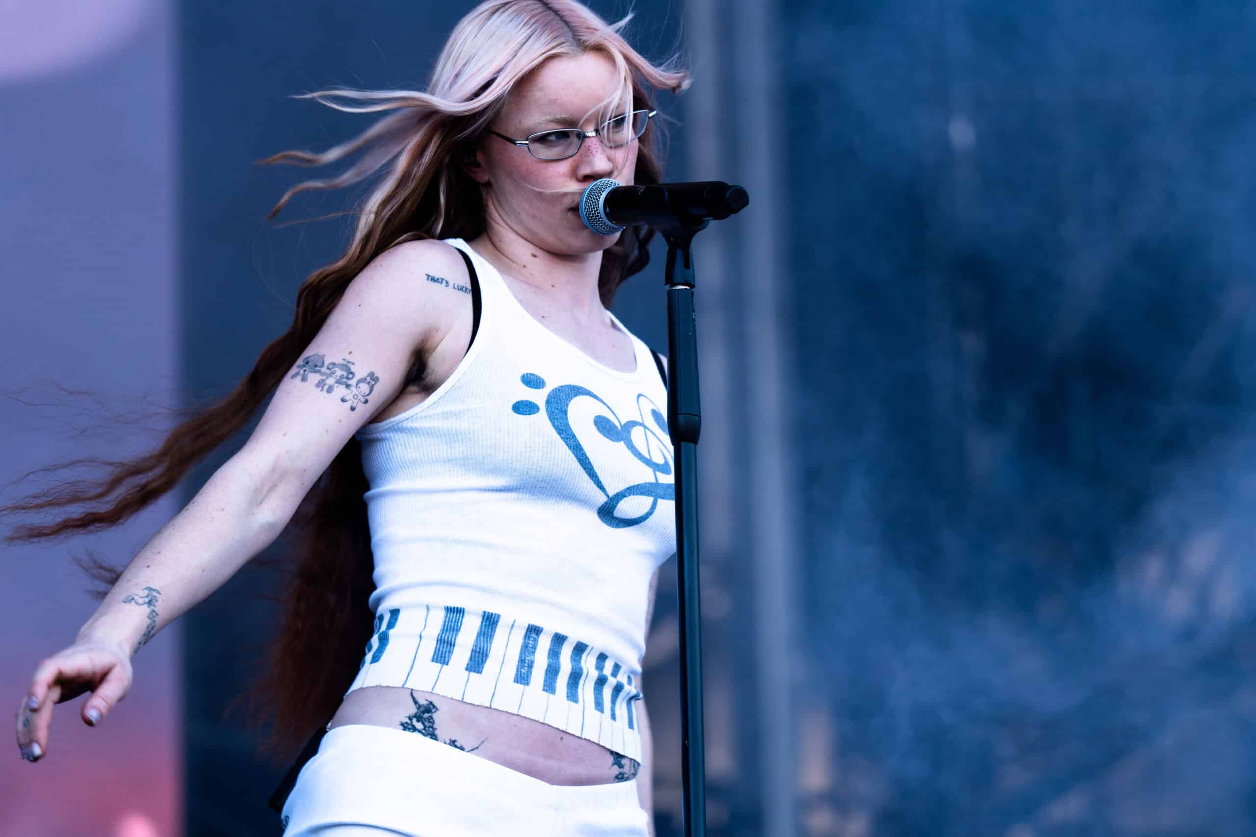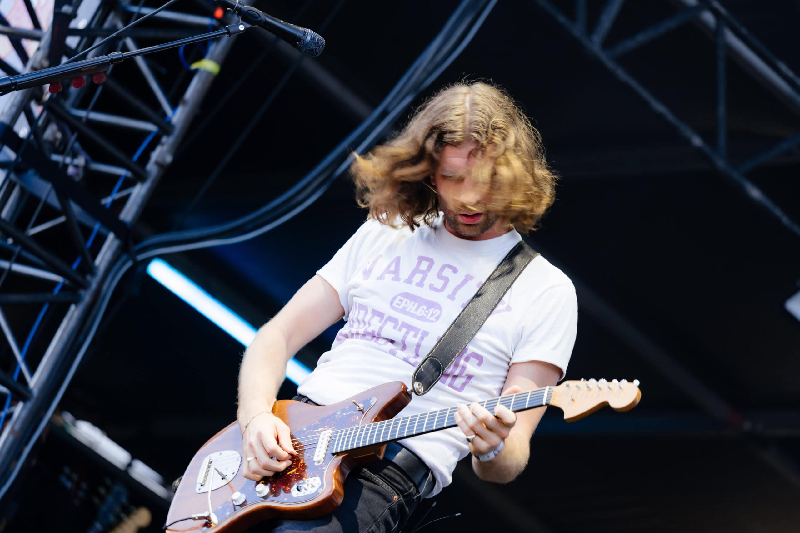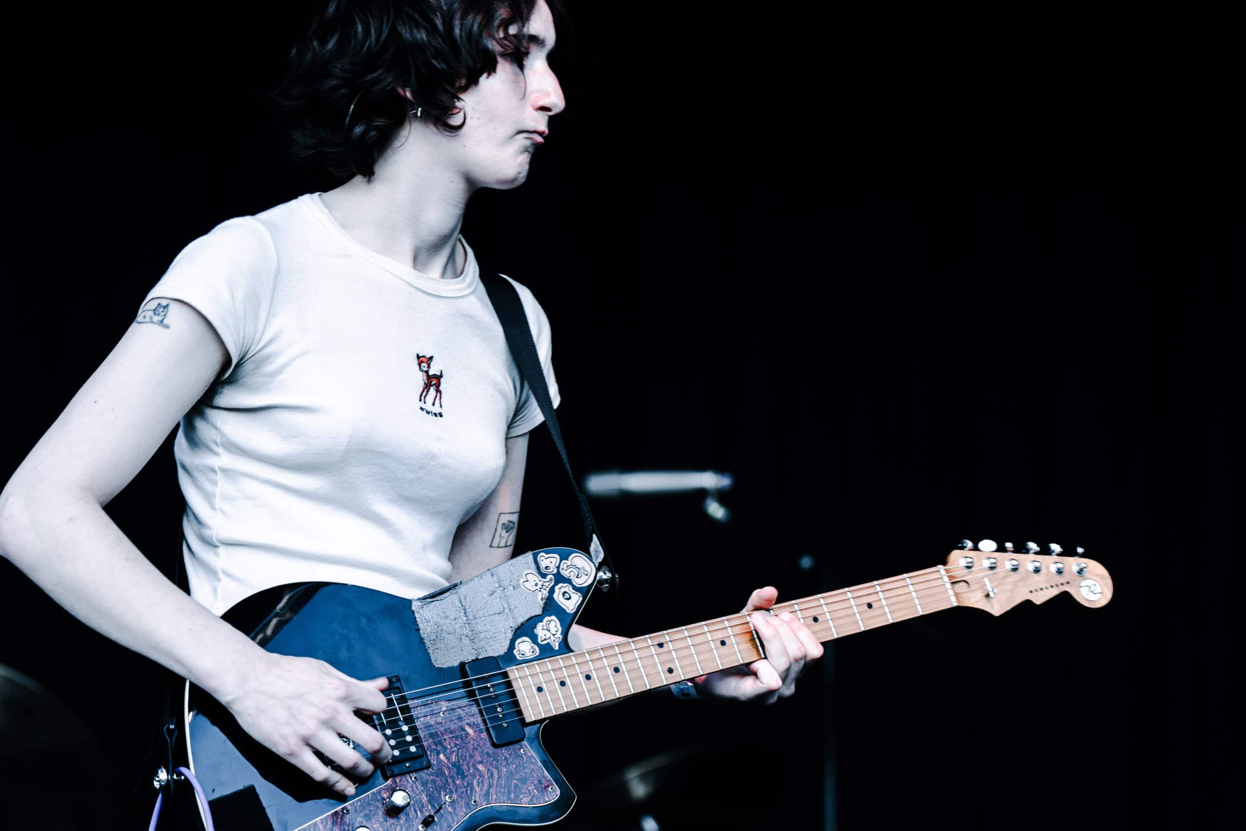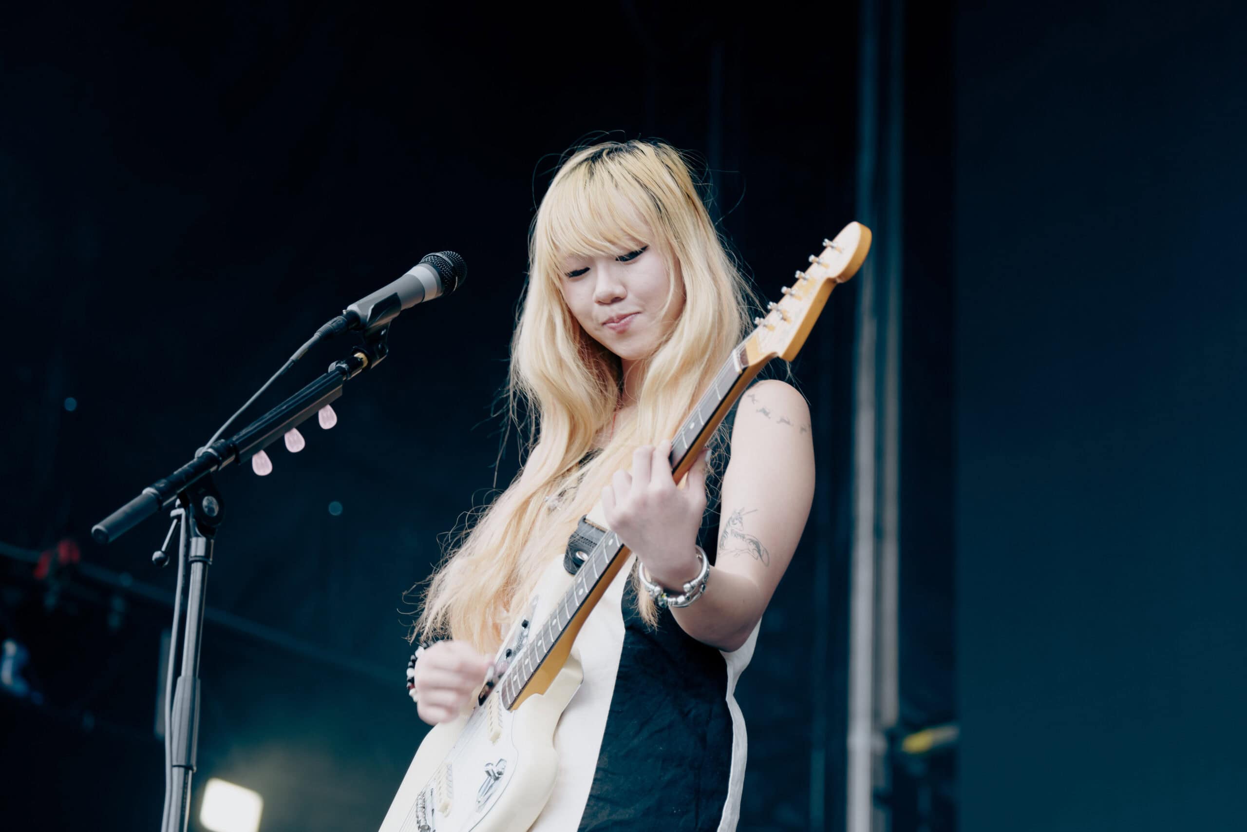 Frontwoman Rhian Teasdale, armed with a transparent neon green guitar, shredded on her knees, strutted the stage’s catwalk, and briefly lost her prescription glasses amongst the chaos. Her outfit — with a bass and treble clef intertwined into a love heart on her chest and “Hardcore For Life” scrawled across the back of her shorts — matched the band’s quirky, overdriven sound. I didn’t know any of the songs, yet I was invested in every single one.
