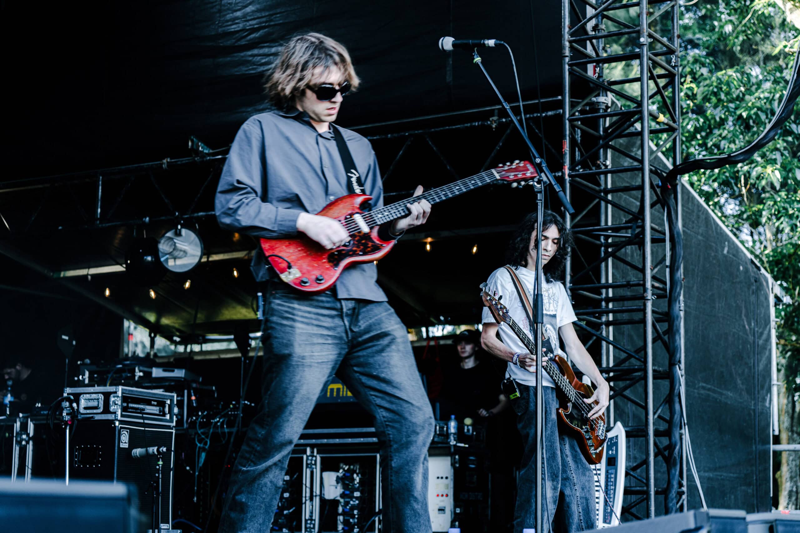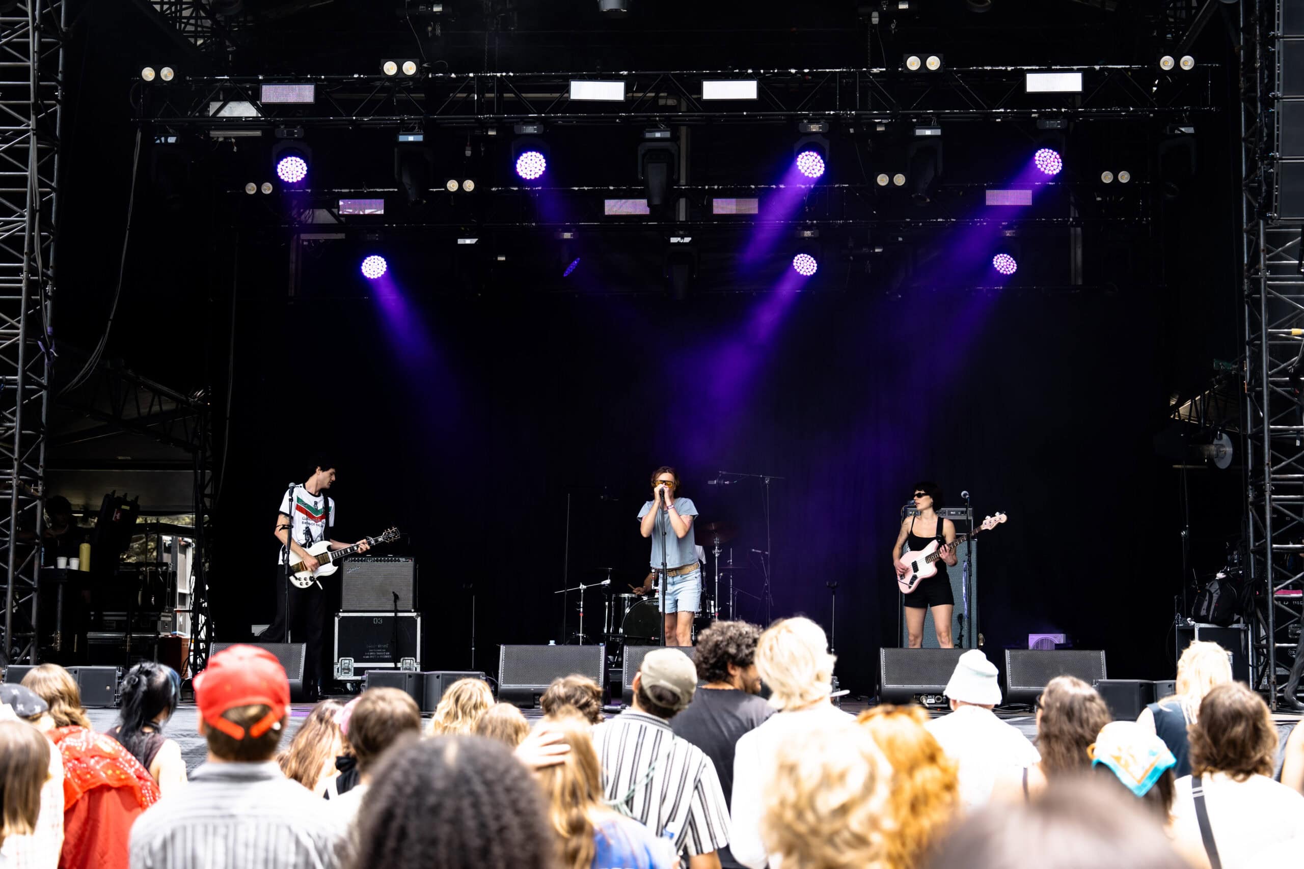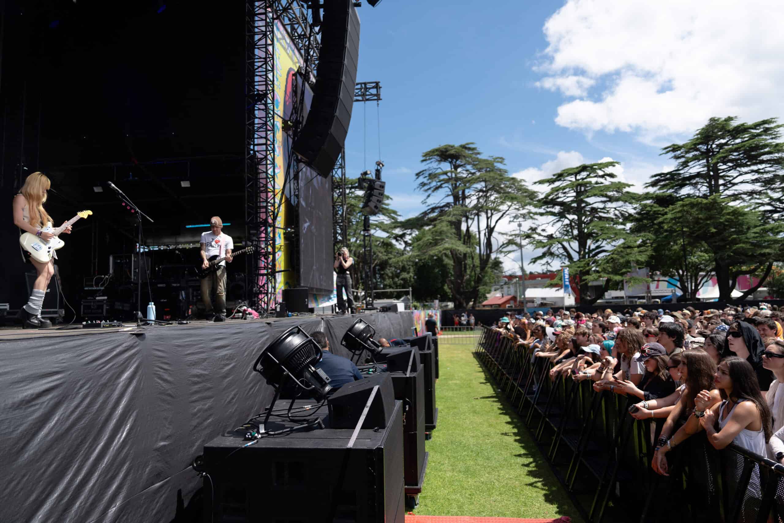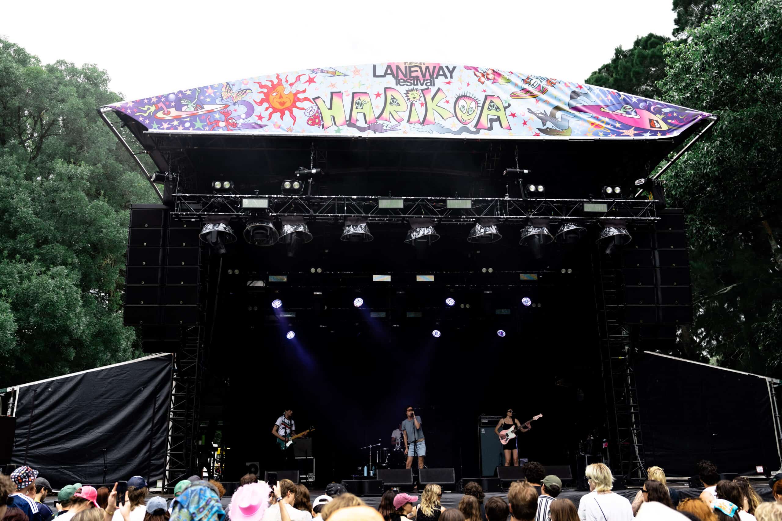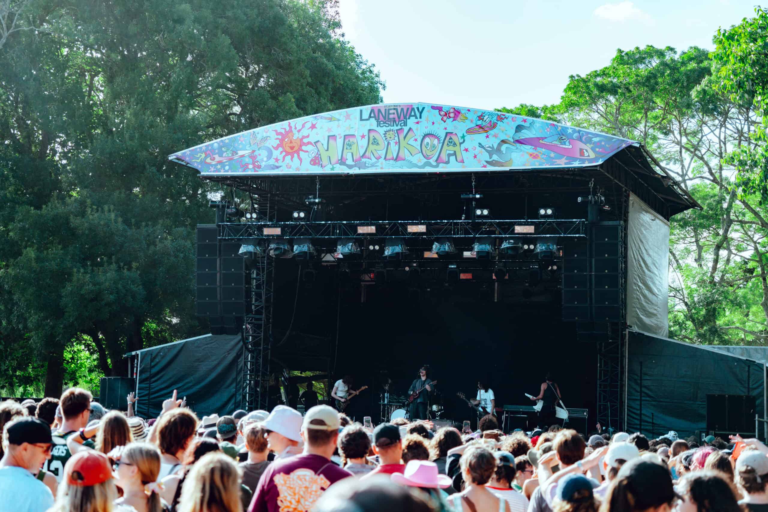 Once inside, I skipped the merch booth and headed down the tree-lined path to the Harikoa stage to catch what was left of Tāmaki Makaurau post-punkers Ringlets. I arrived to a sparse audience and a near-empty stage. Turns out the band had to leave for several minutes while a sound issue was resolved.