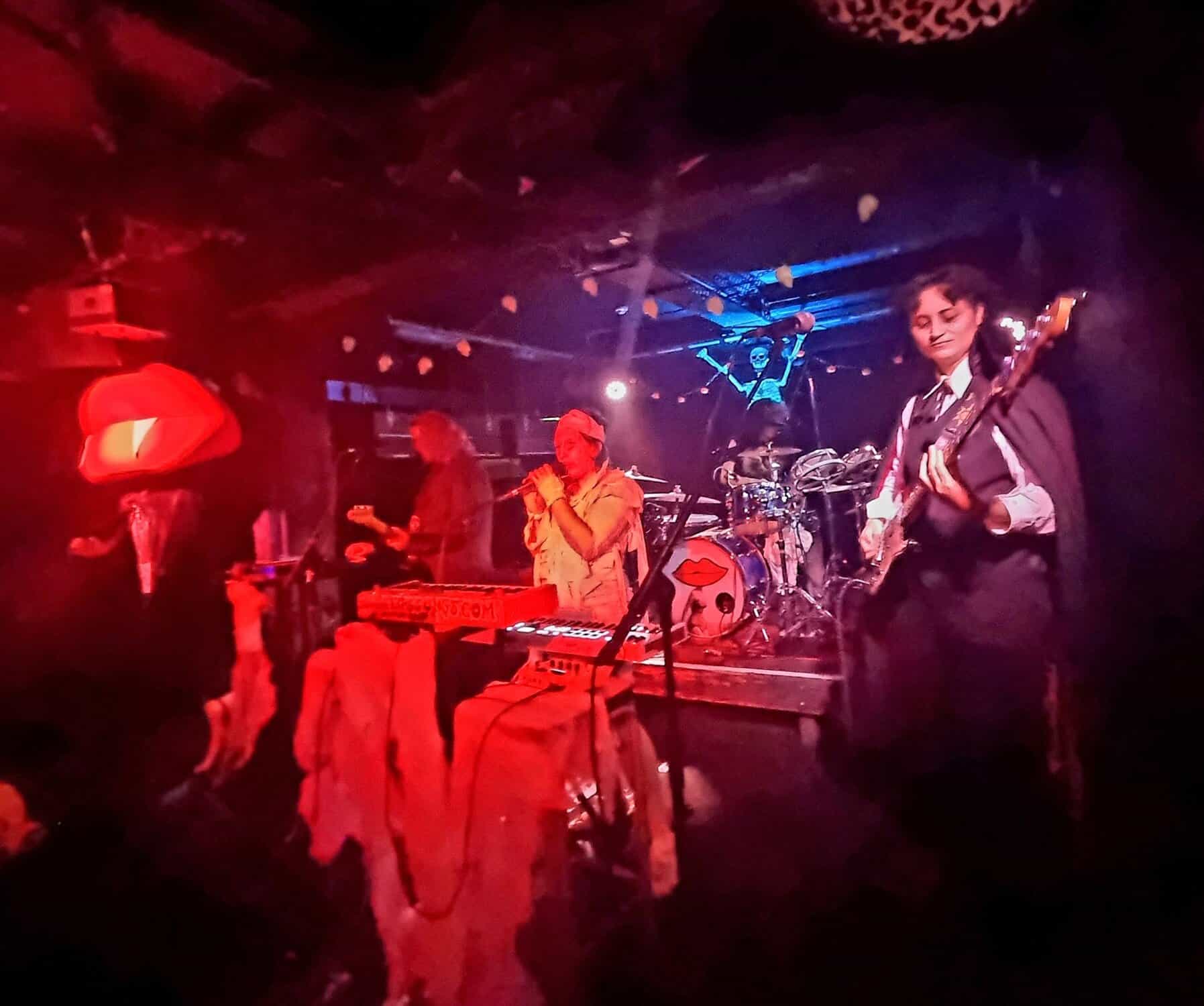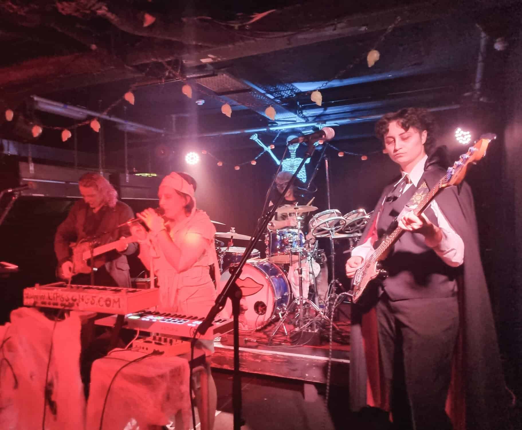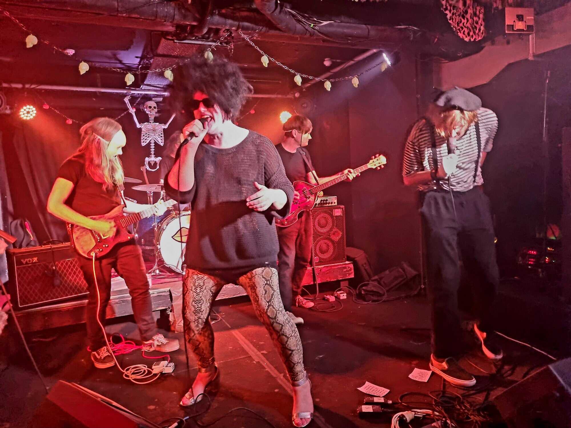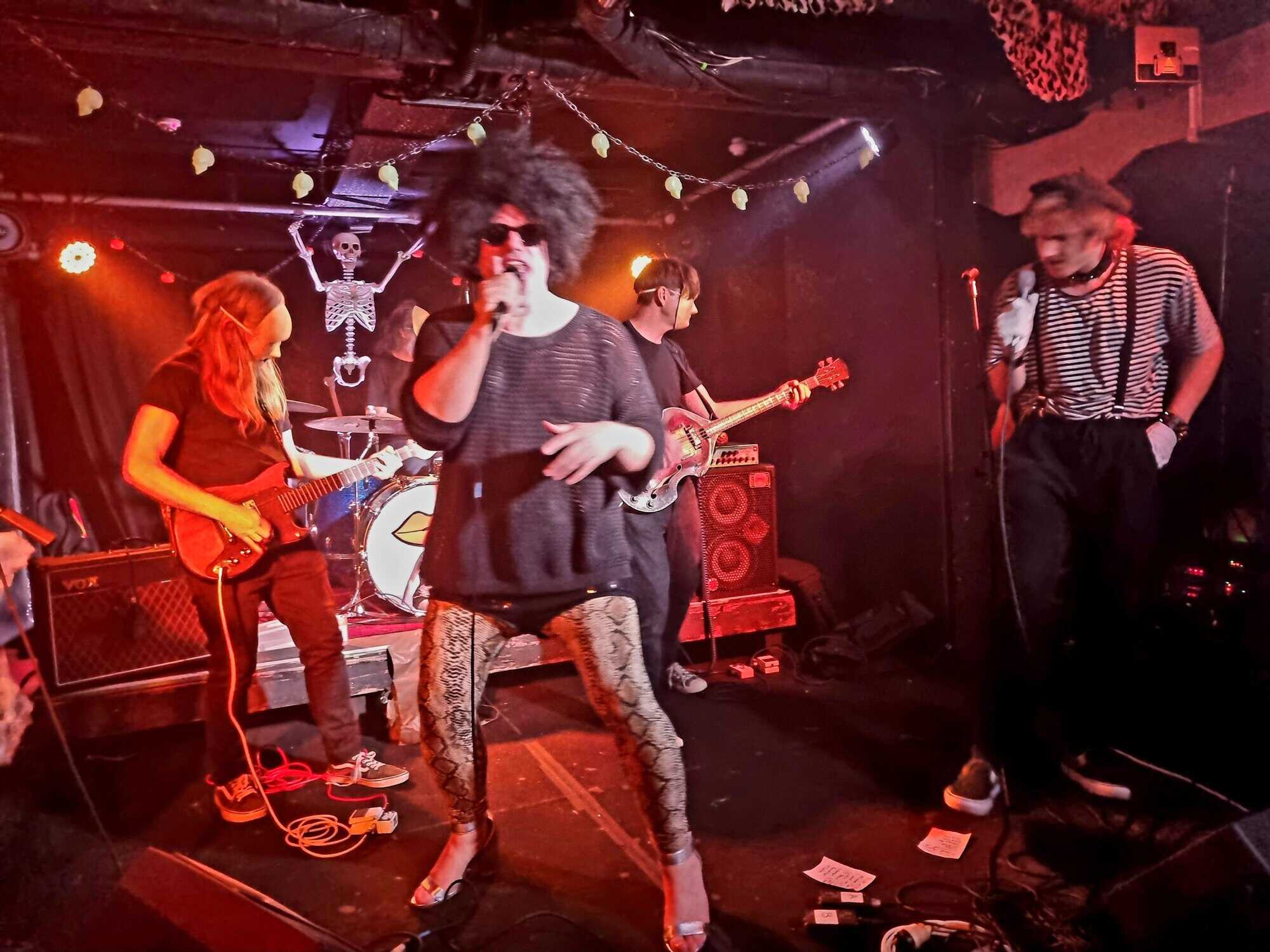 Are plagued by tech issues, somewhat befitting the po/night’s theme inadvertently. An extra Fugazi beer later, and Steph Brown, Fen Ikner, Ruby Walsh and Maude Morris are ready onstage, perhaps even more lavishly adorned than the members of The Golden Geese, immediately rampaging their way through a version of a classic – Monster Mash.