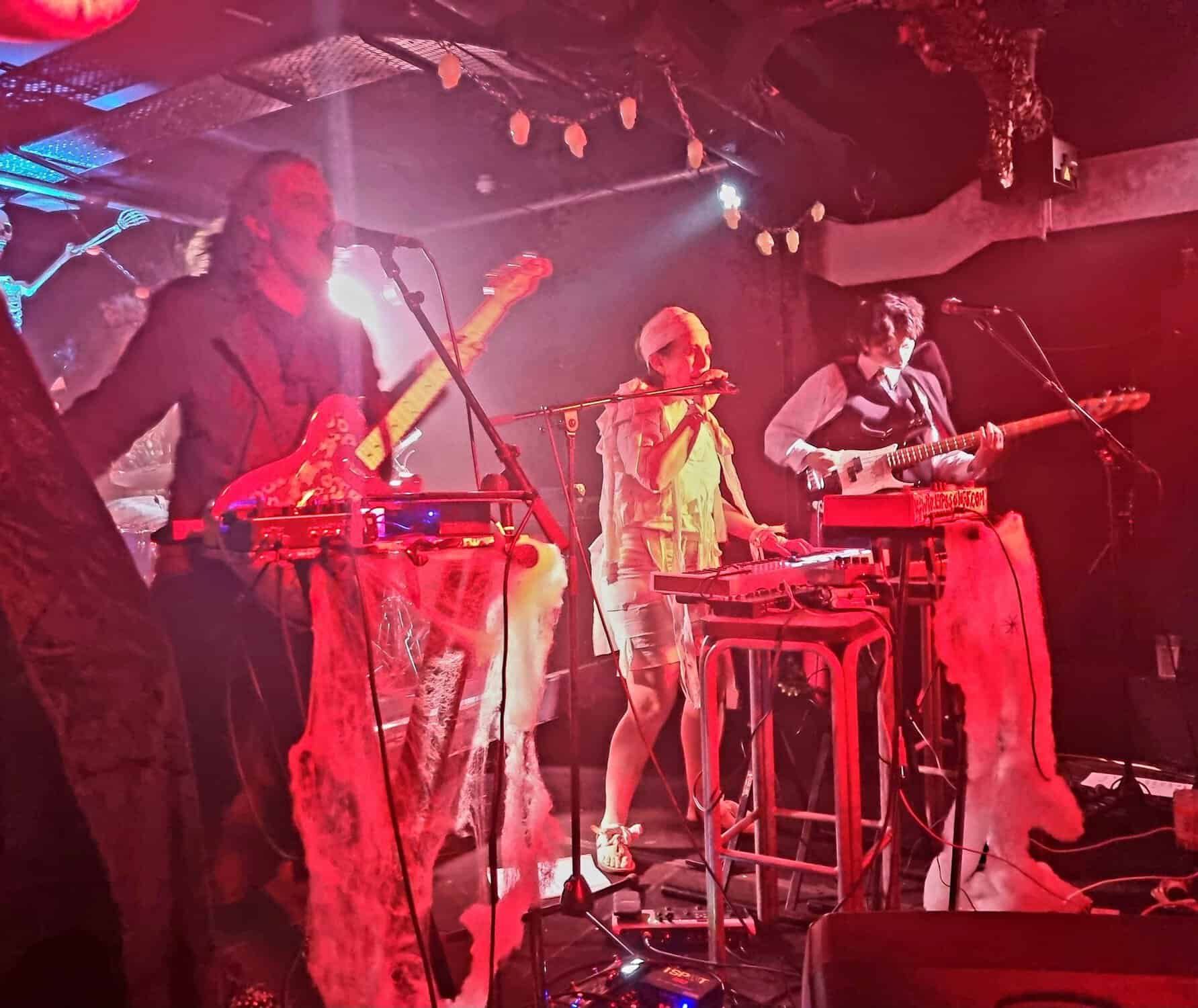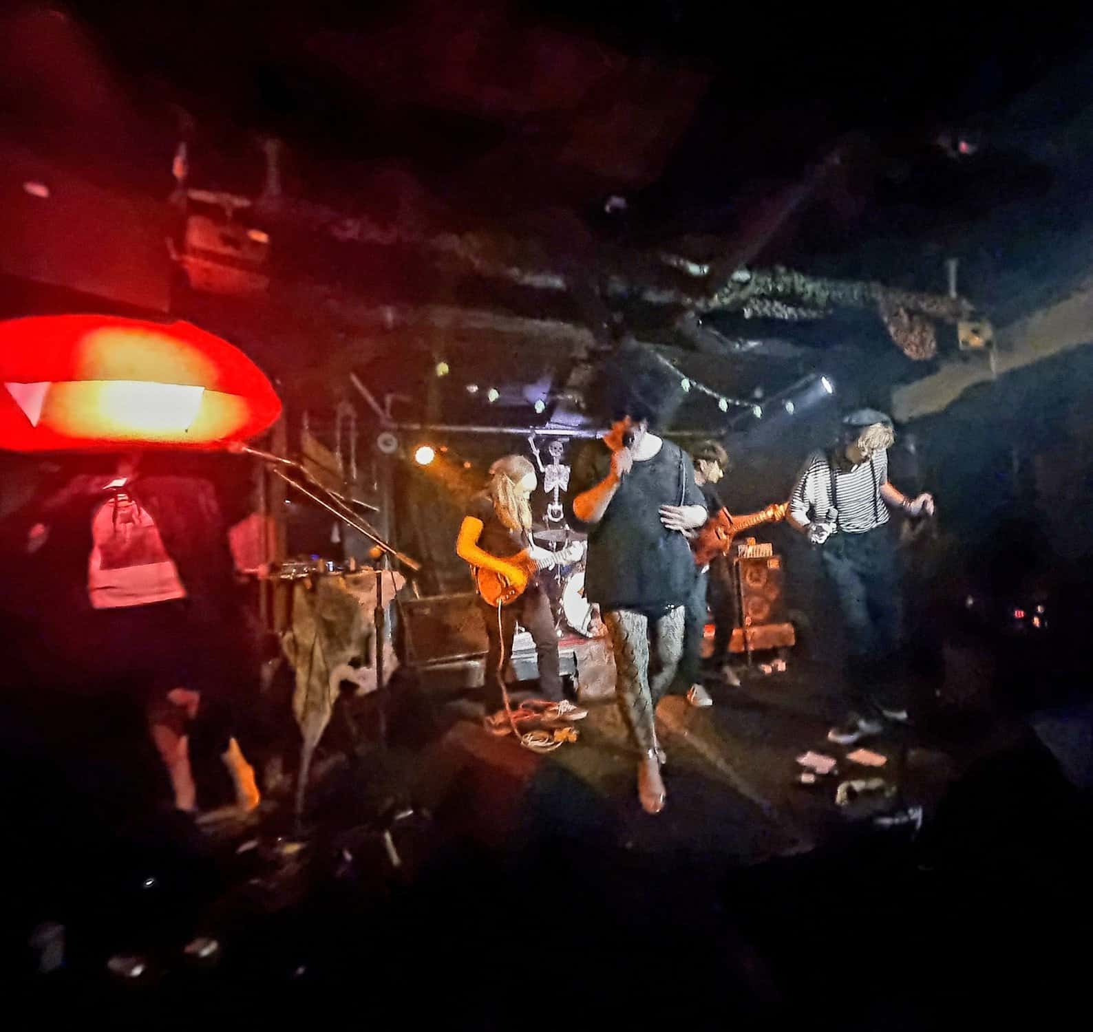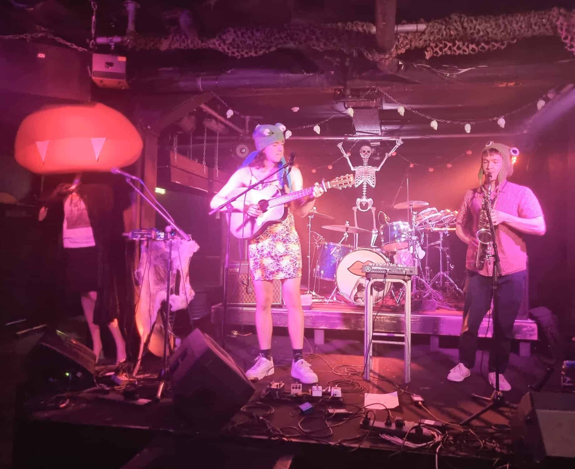 Are plagued by tech issues, somewhat befitting the po/night’s theme inadvertently. An extra Fugazi beer later, and Steph Brown, Fen Ikner, Ruby Walsh and Maude Morris are ready onstage, perhaps even more lavishly adorned than the members of The Golden Geese, immediately rampaging their way through a version of a classic – Monster Mash.