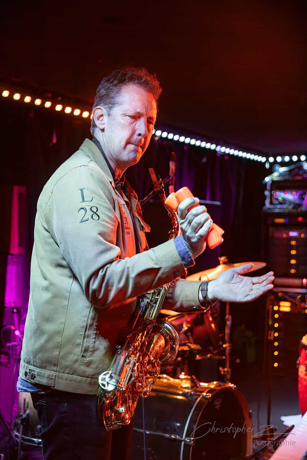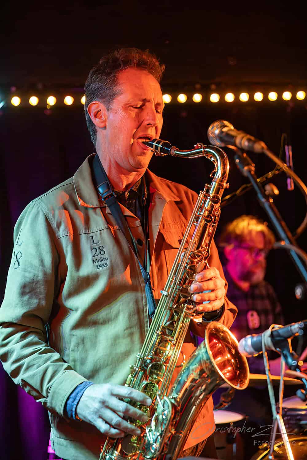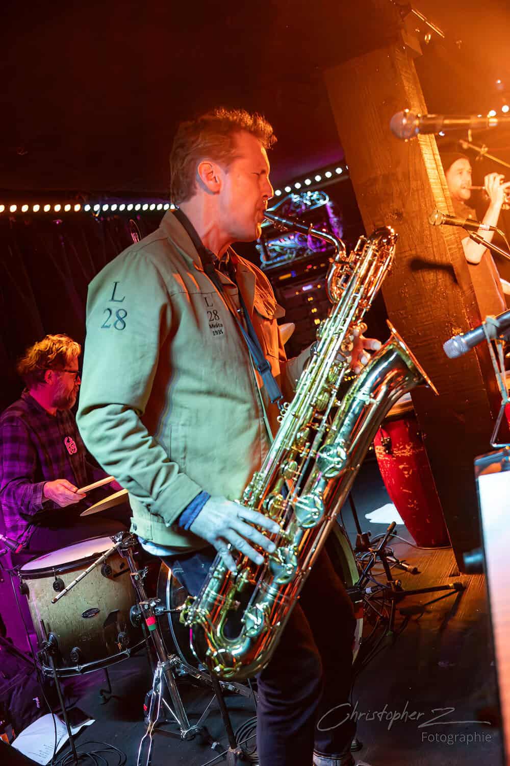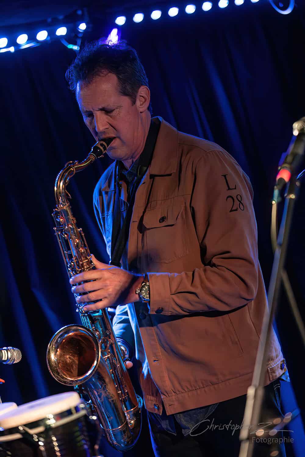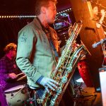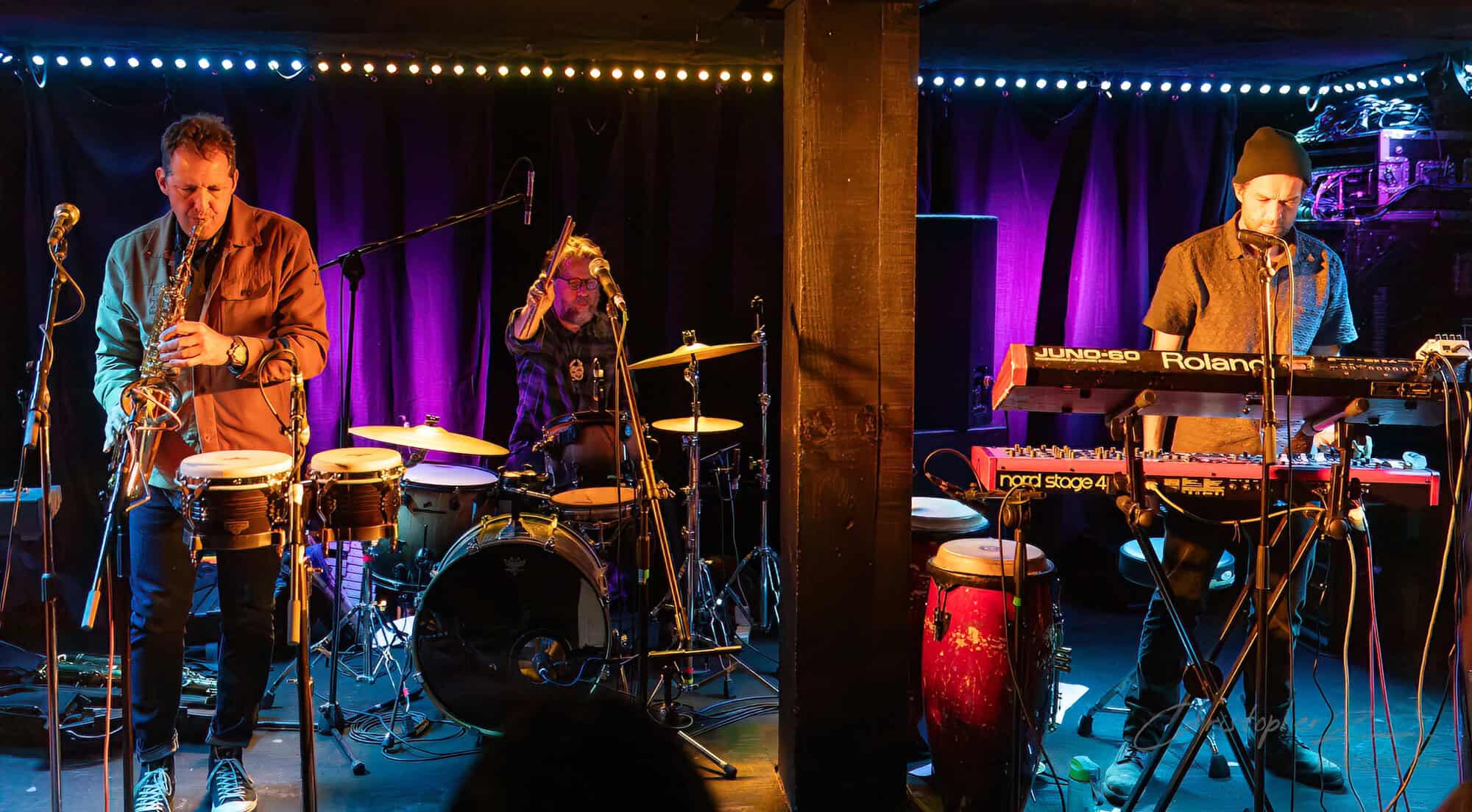 Nick acts as emcee, greets the crowd, introduces Chris O’Connor and takes up his sax and the trio launch into the jazz/funk of The Tunnel, O’Connor opting to shed his coat of many colours and get down to business behind his kit.