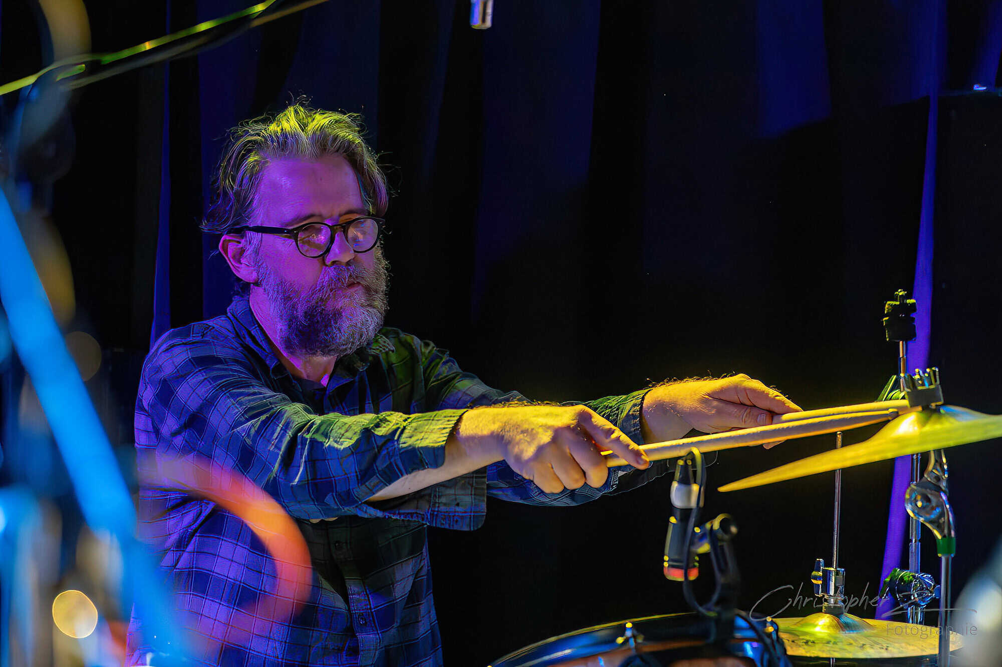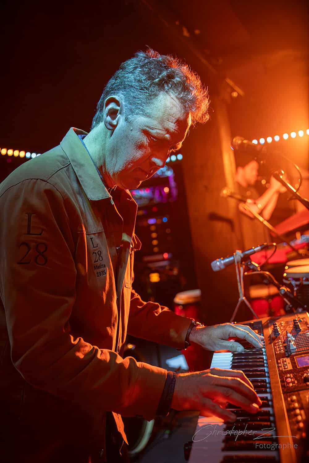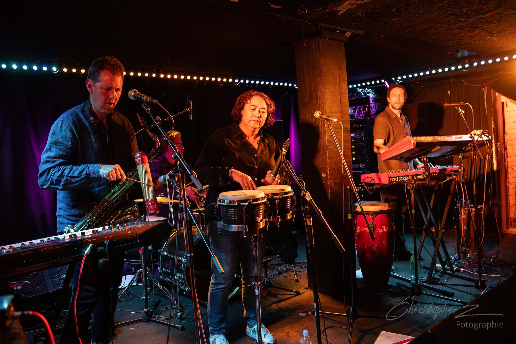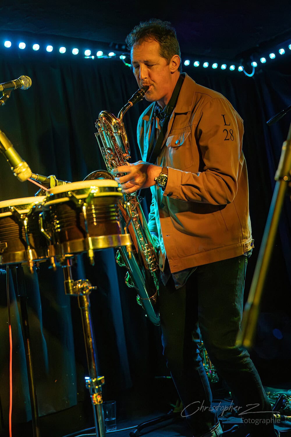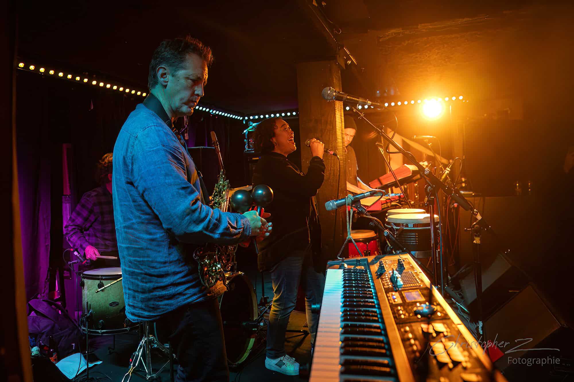 Nick acts as emcee, greets the crowd, introduces Chris O’Connor and takes up his sax and the trio launch into the jazz/funk of The Tunnel, O’Connor opting to shed his coat of many colours and get down to business behind his kit.
