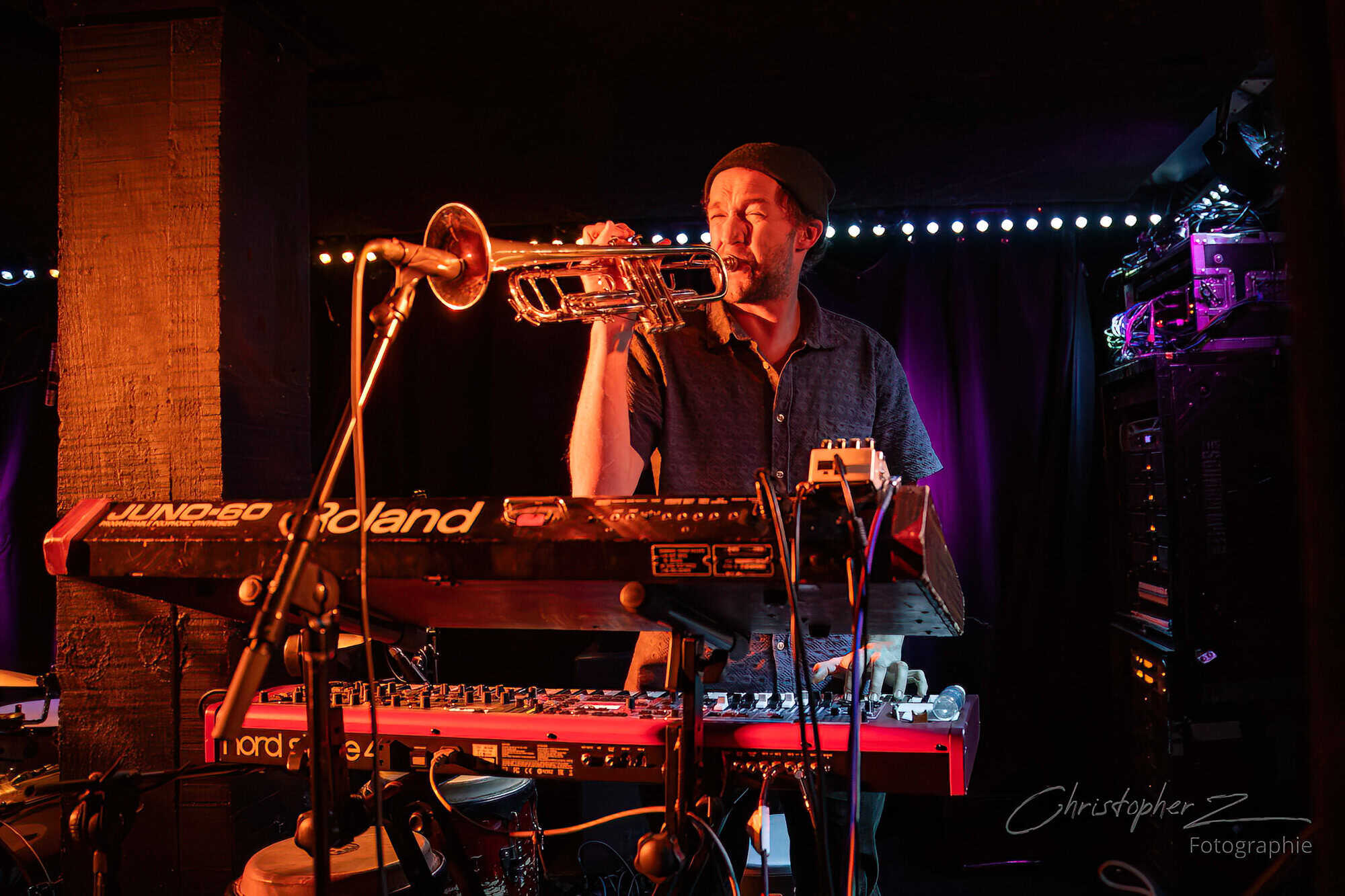 Sure enough, fans begin to accumulate and music begins the fill the air at Whammy shortly after 6:30. It’s the sound of Nick Atkinson (Hopetoun Brown) tickling the electronic ivories, playing something called “Nick’s New Piano Song”…at least that’s what it says on the set list. Soon, Finn Scholes (Carnivorous Plant Society) joins in on trumpet and off we go.