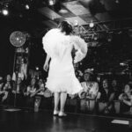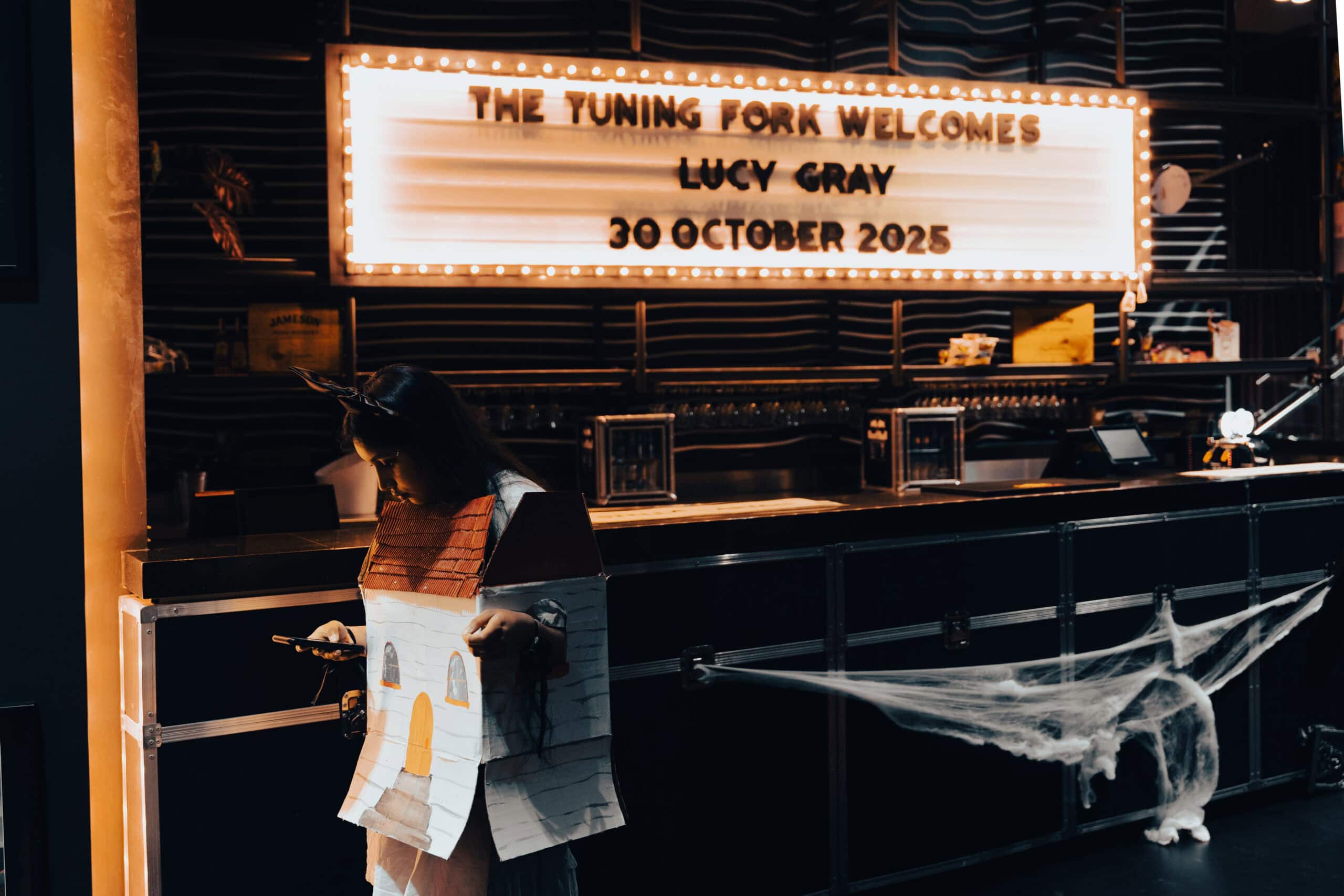 The moment you walk into the venue, you can feel the difference. The bar is covered in white cotton webs, and two massive black curtains block the view toward the stage, leaving only a narrow passage for people to walk through. Two ghost masks hang on each side, giving away the Halloween theme. A month before the show, Lucy announced the idea on her Instagram page, inviting fans to take part and promising a prize for the best costume. The crowd clearly took it seriously, dressed as witches, princesses, a bottle of hot sauce, and even a walking house.