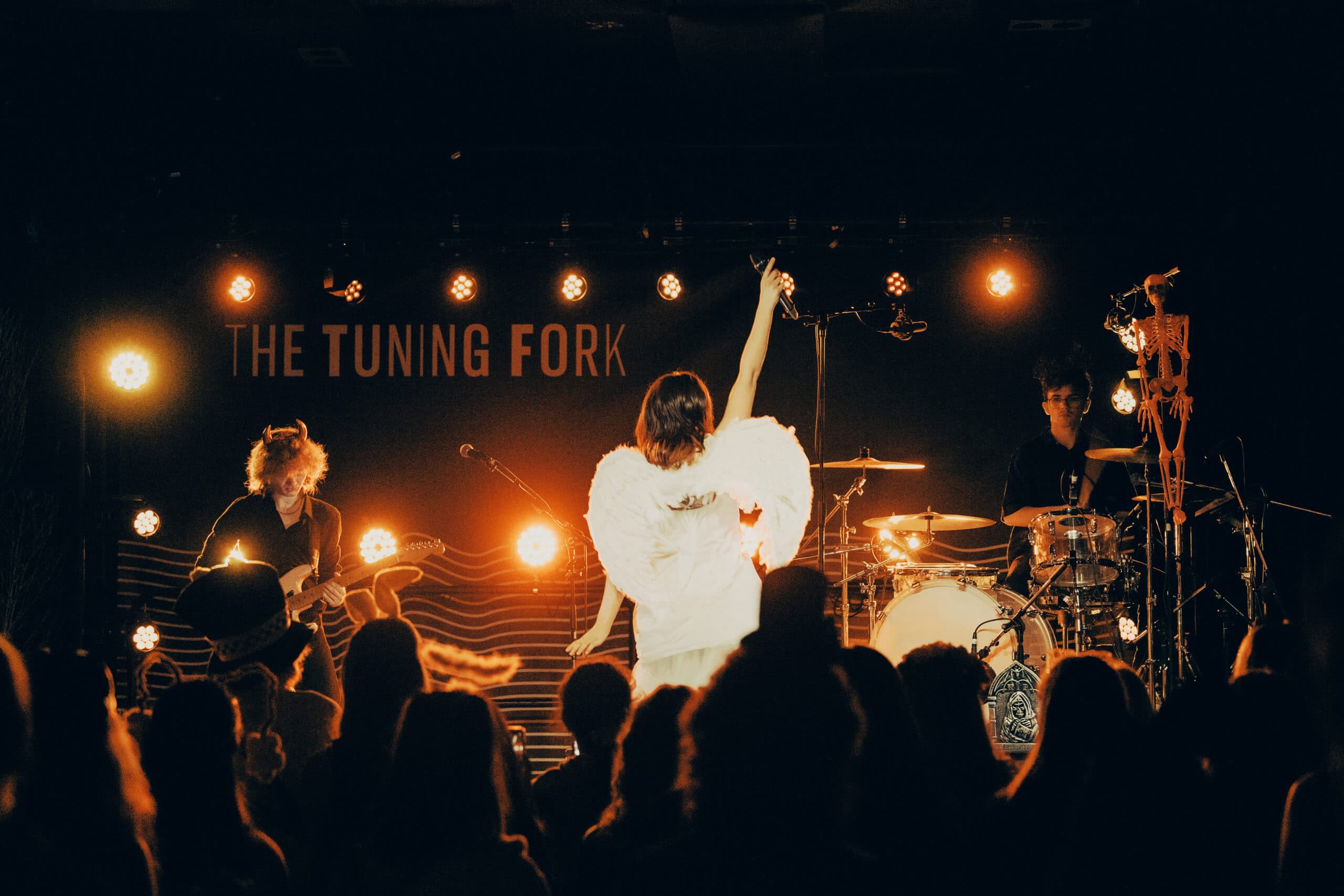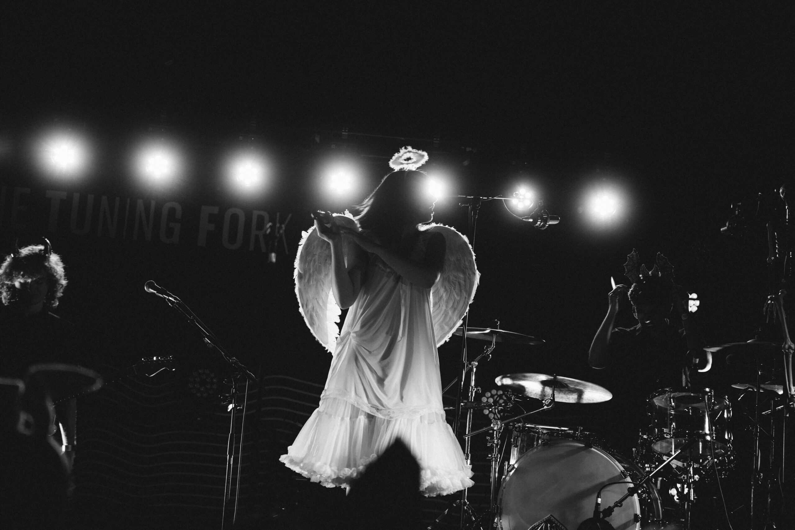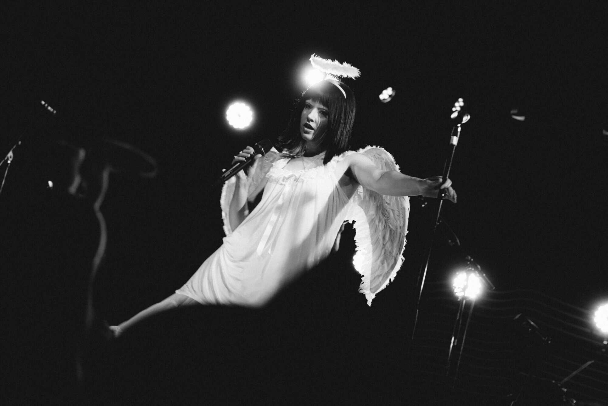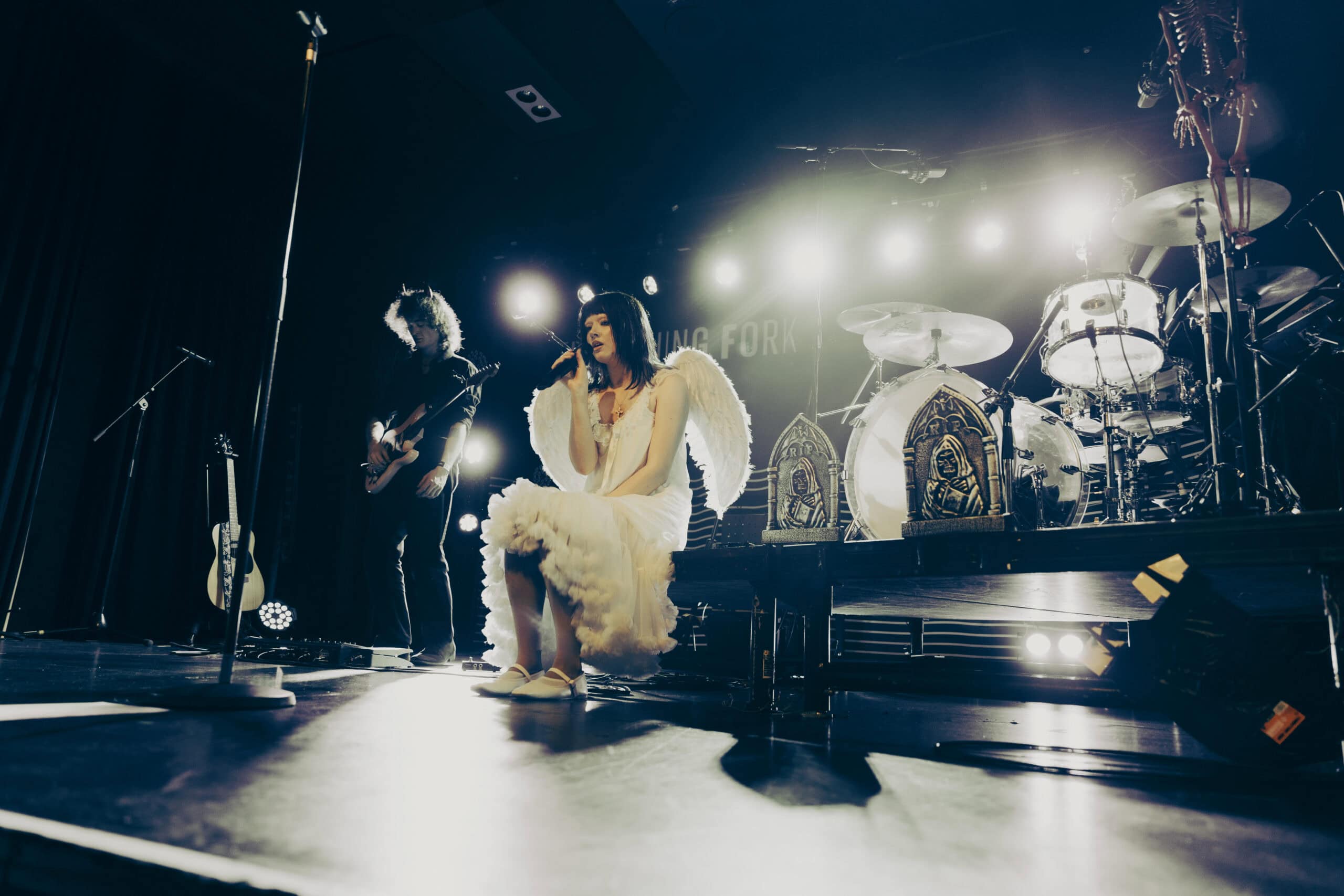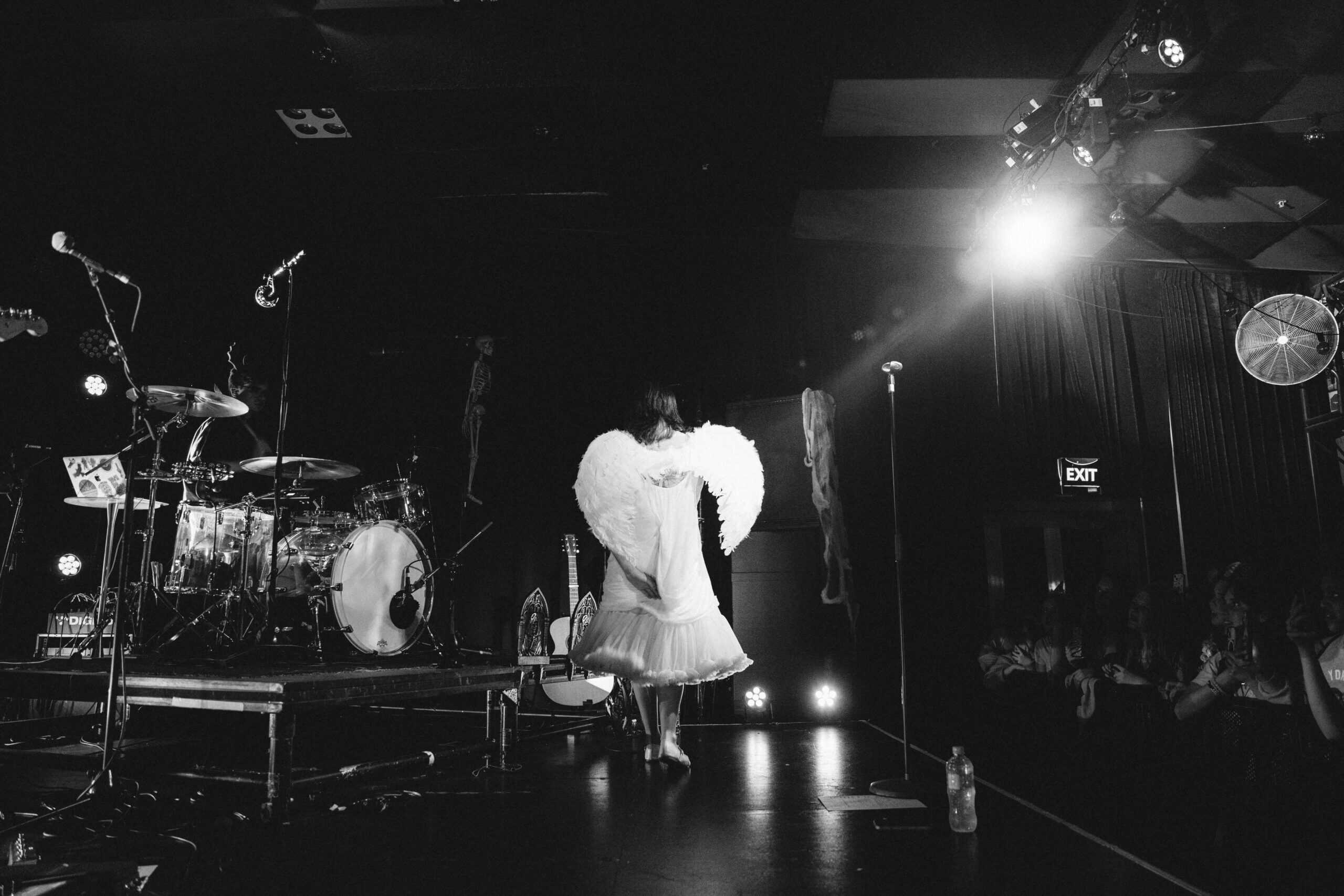After a brief intermission, the stage went completely dark. Amid cheers from the crowd, Lucy ran onstage, dressed entirely in white â white shoes, a flowing white dress, white wings, and a white halo atop her head. Tonight, she was an angel. Behind her, guitarist Liam Beasley wore devil horns, and drummer Elliot Borland in demon wings, creating a visual contrast of angels and demons. With that, the three-piece performance officially began.