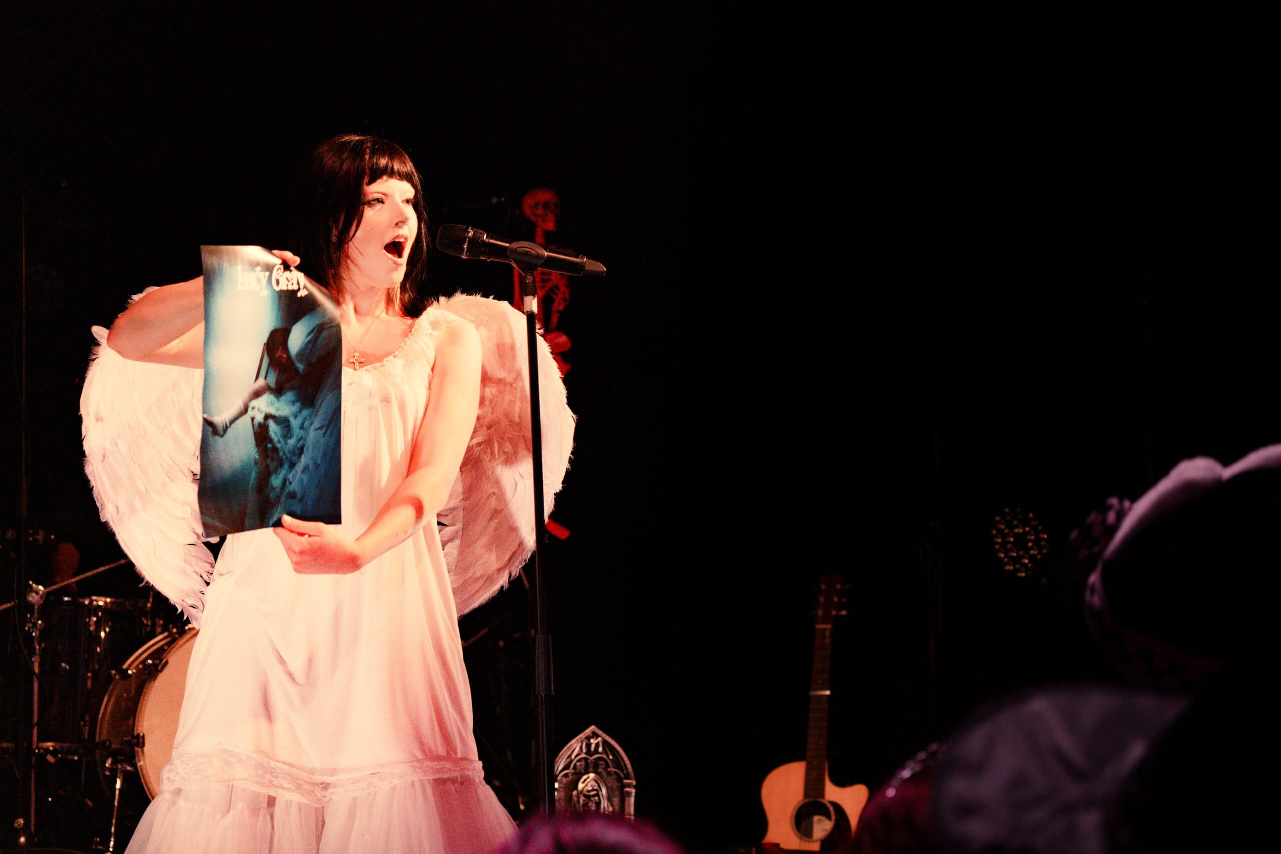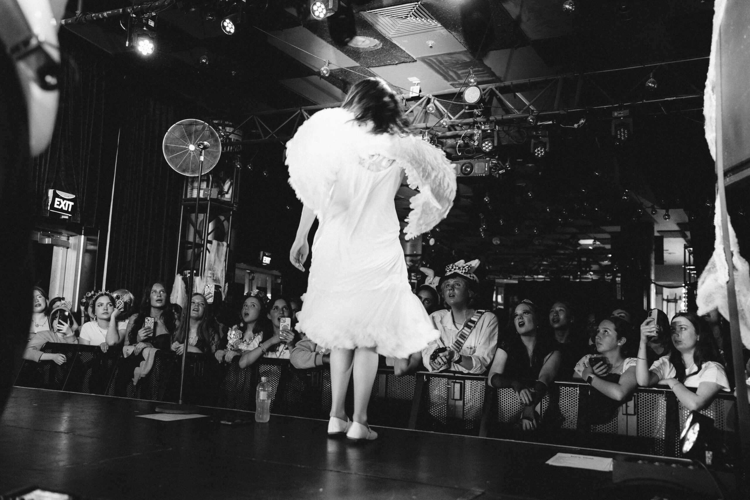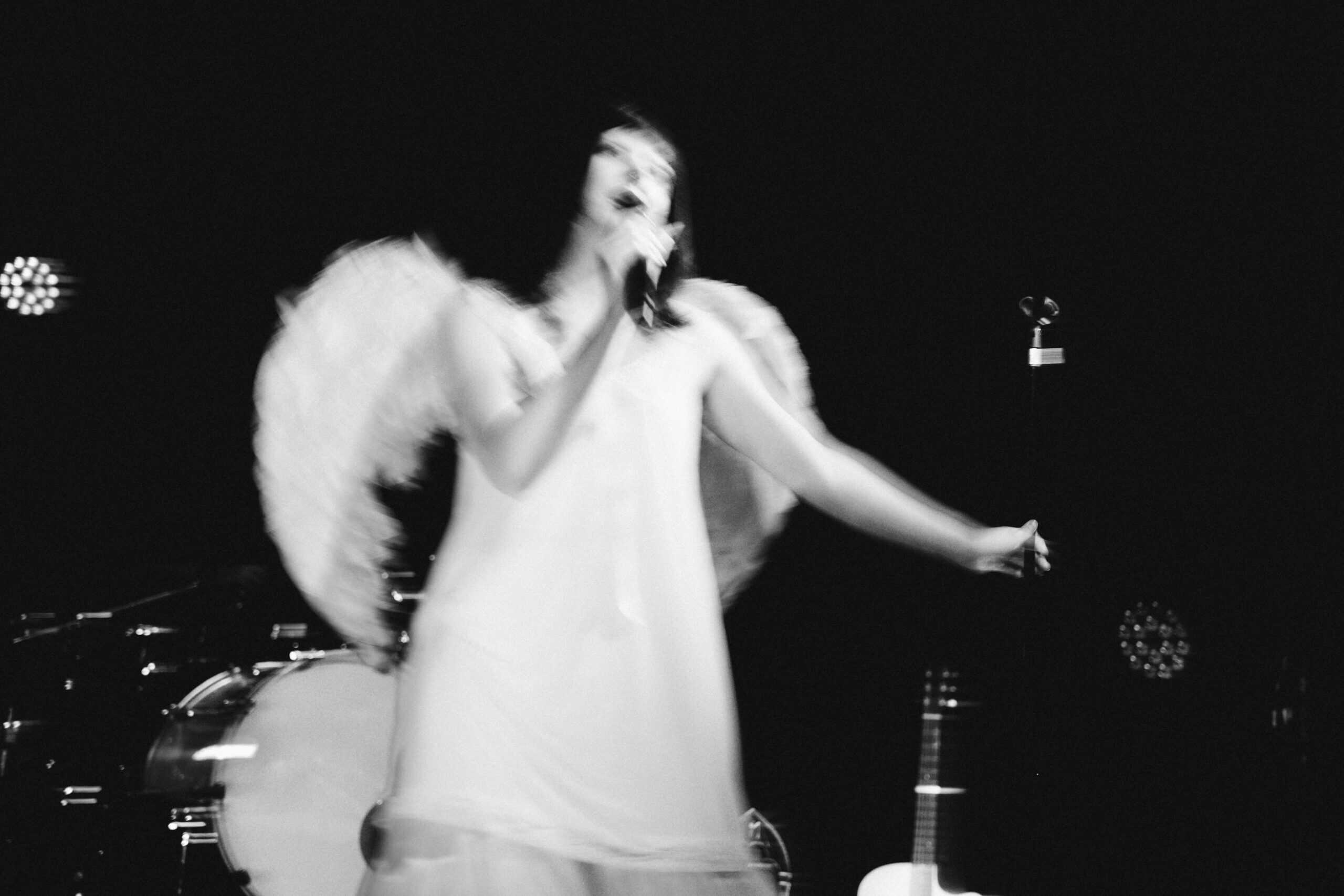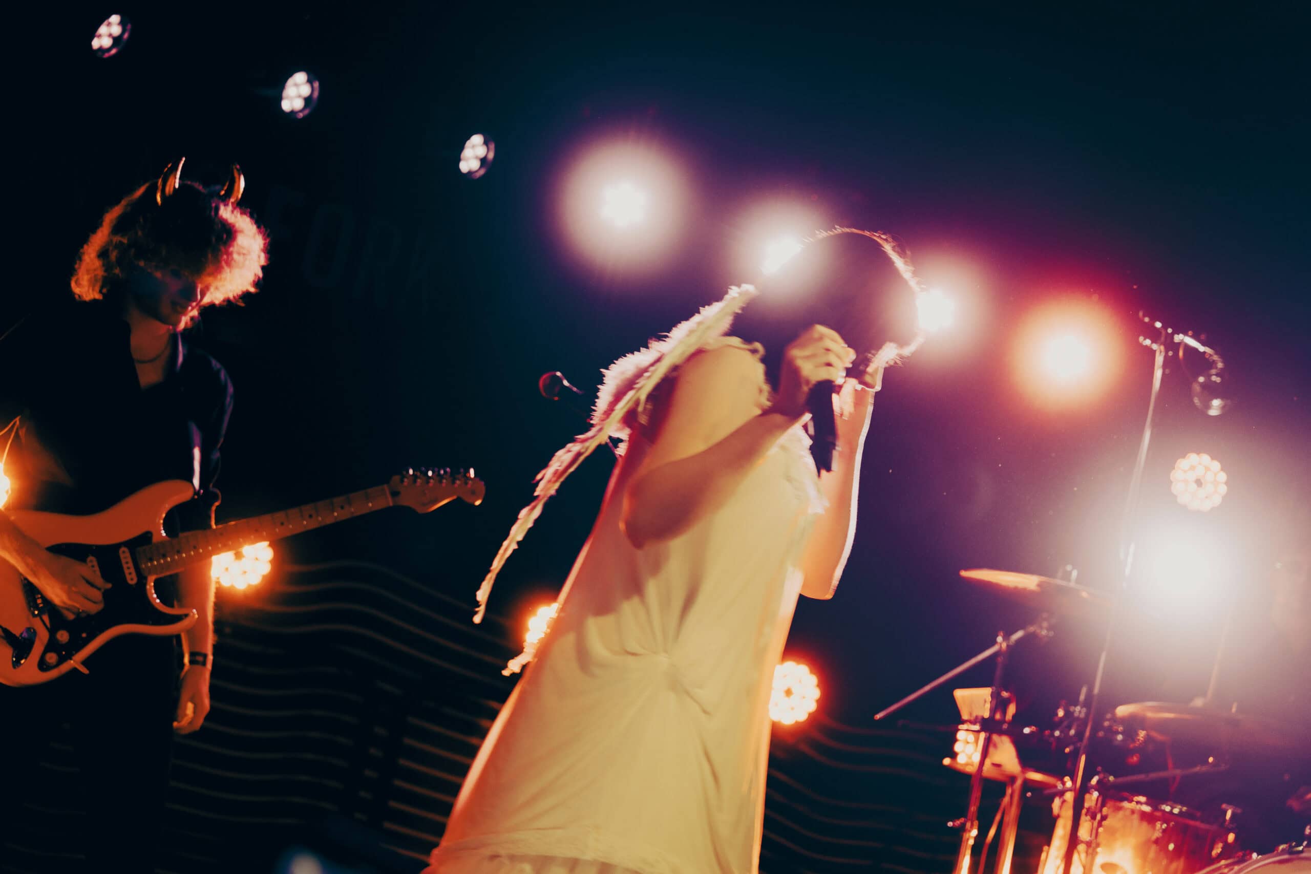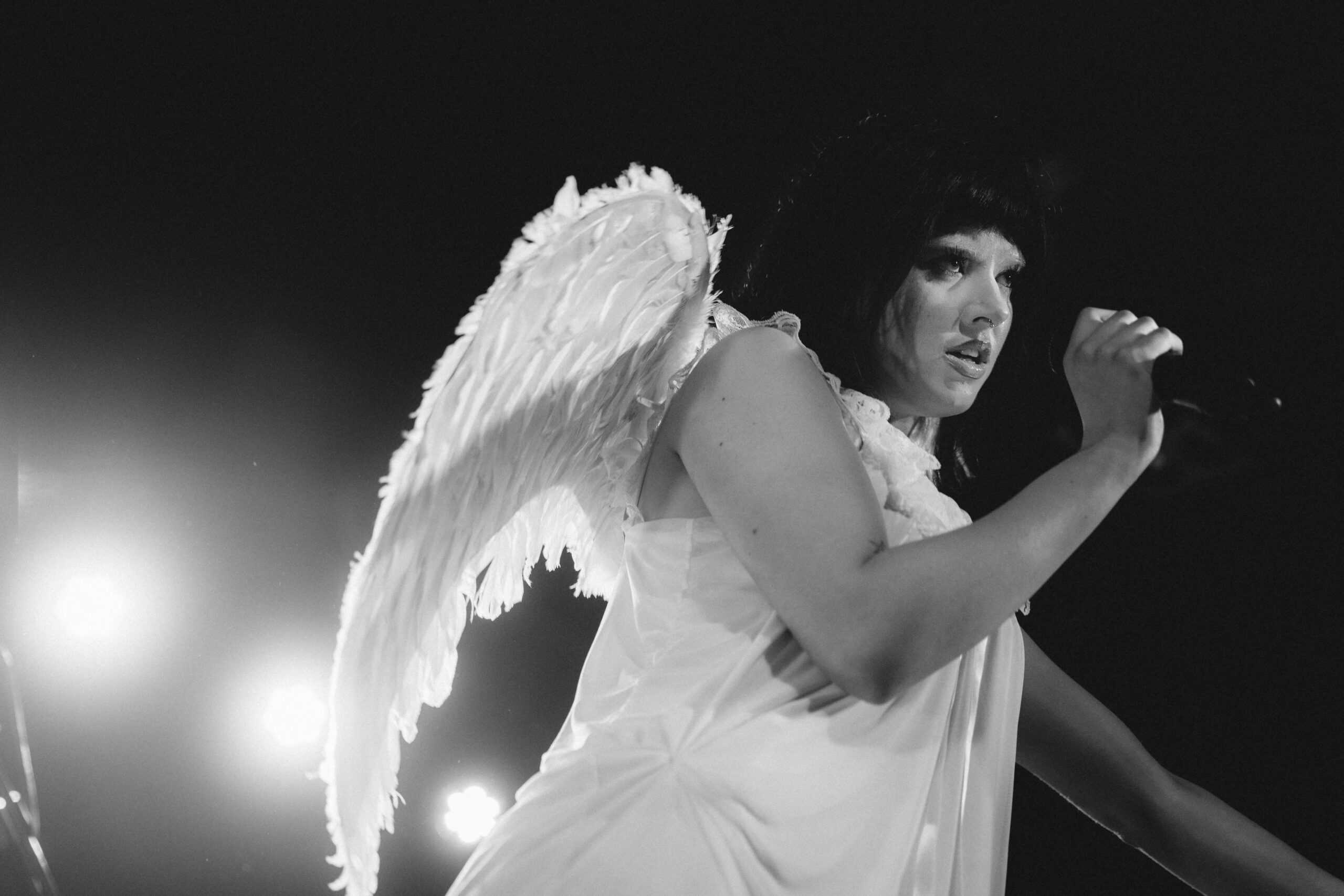 After a brief intermission, the stage went completely dark. Amid cheers from the crowd, Lucy ran onstage, dressed entirely in white â white shoes, a flowing white dress, white wings, and a white halo atop her head. Tonight, she was an angel. Behind her, guitarist Liam Beasley wore devil horns, and drummer Elliot Borland in demon wings, creating a visual contrast of angels and demons. With that, the three-piece performance officially began.