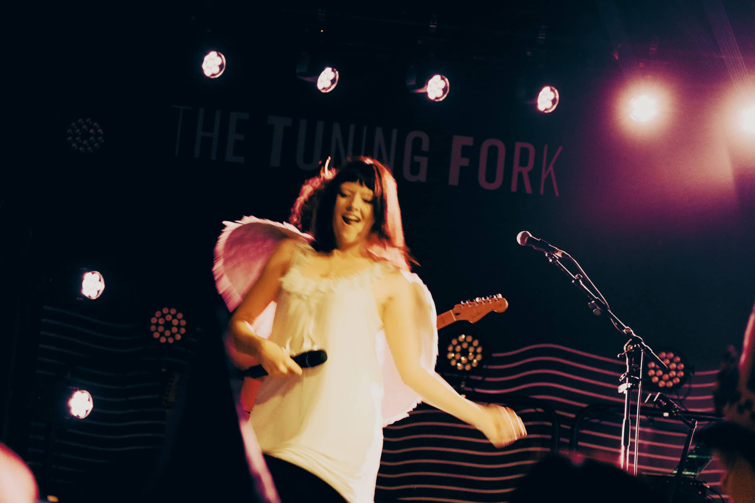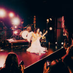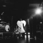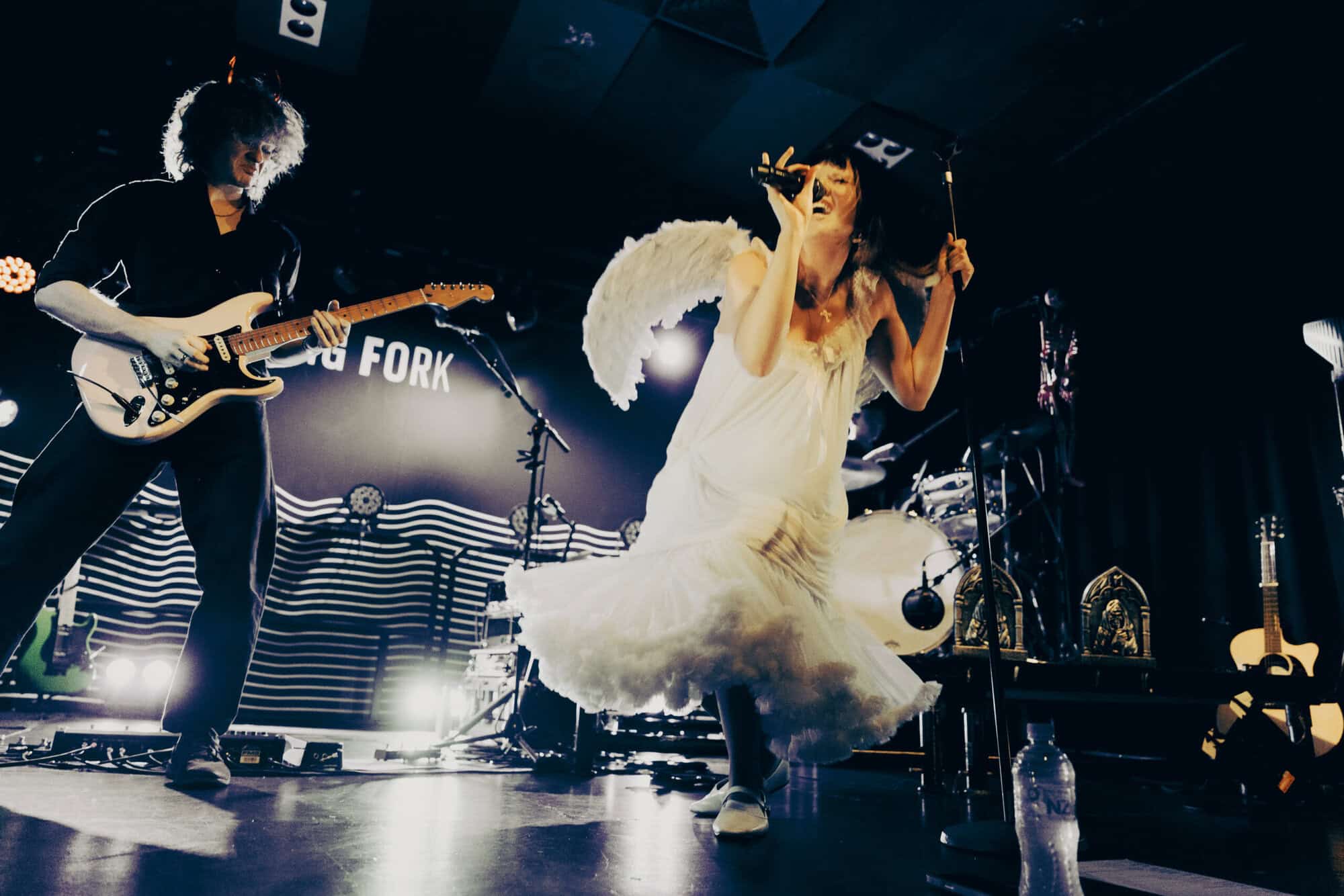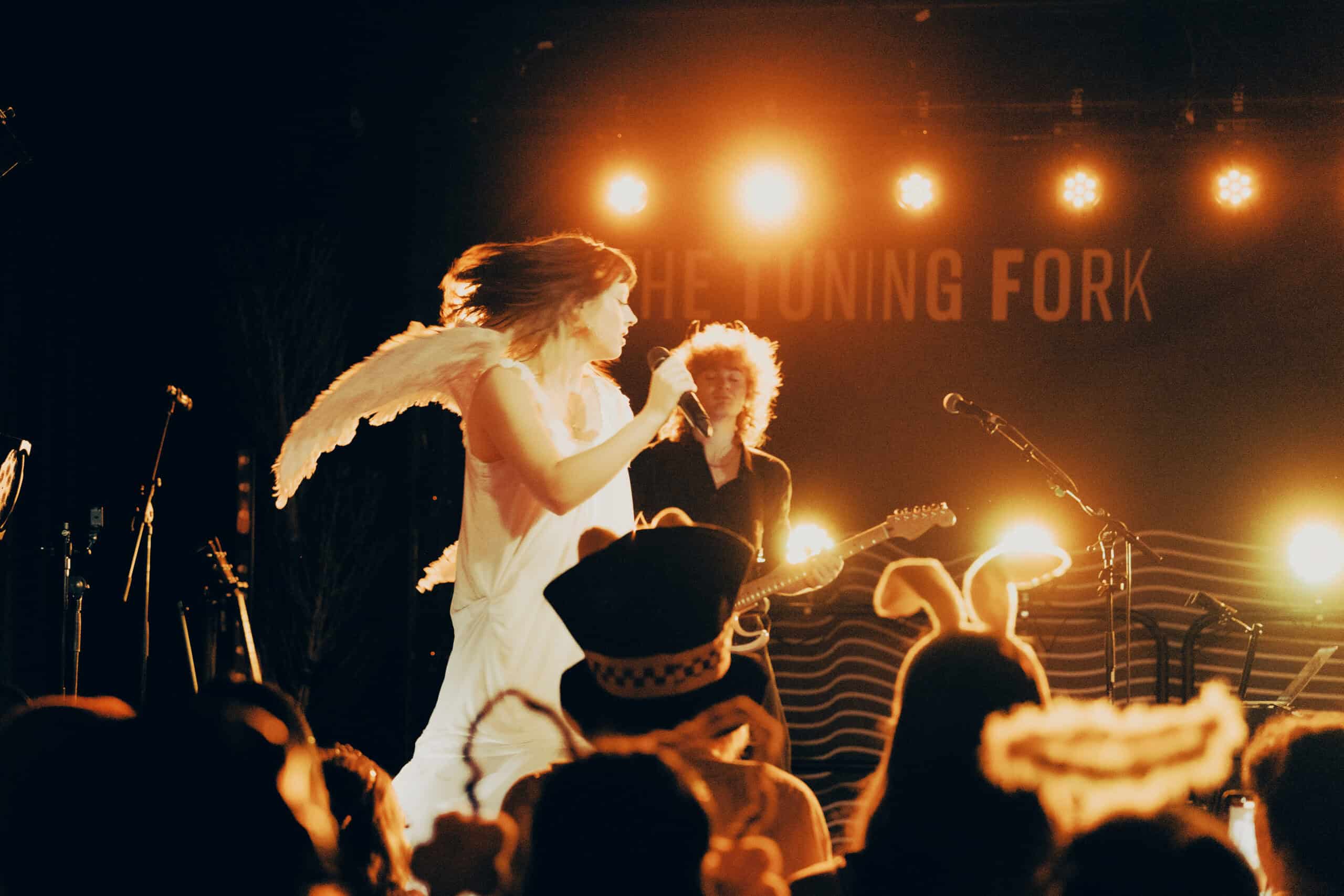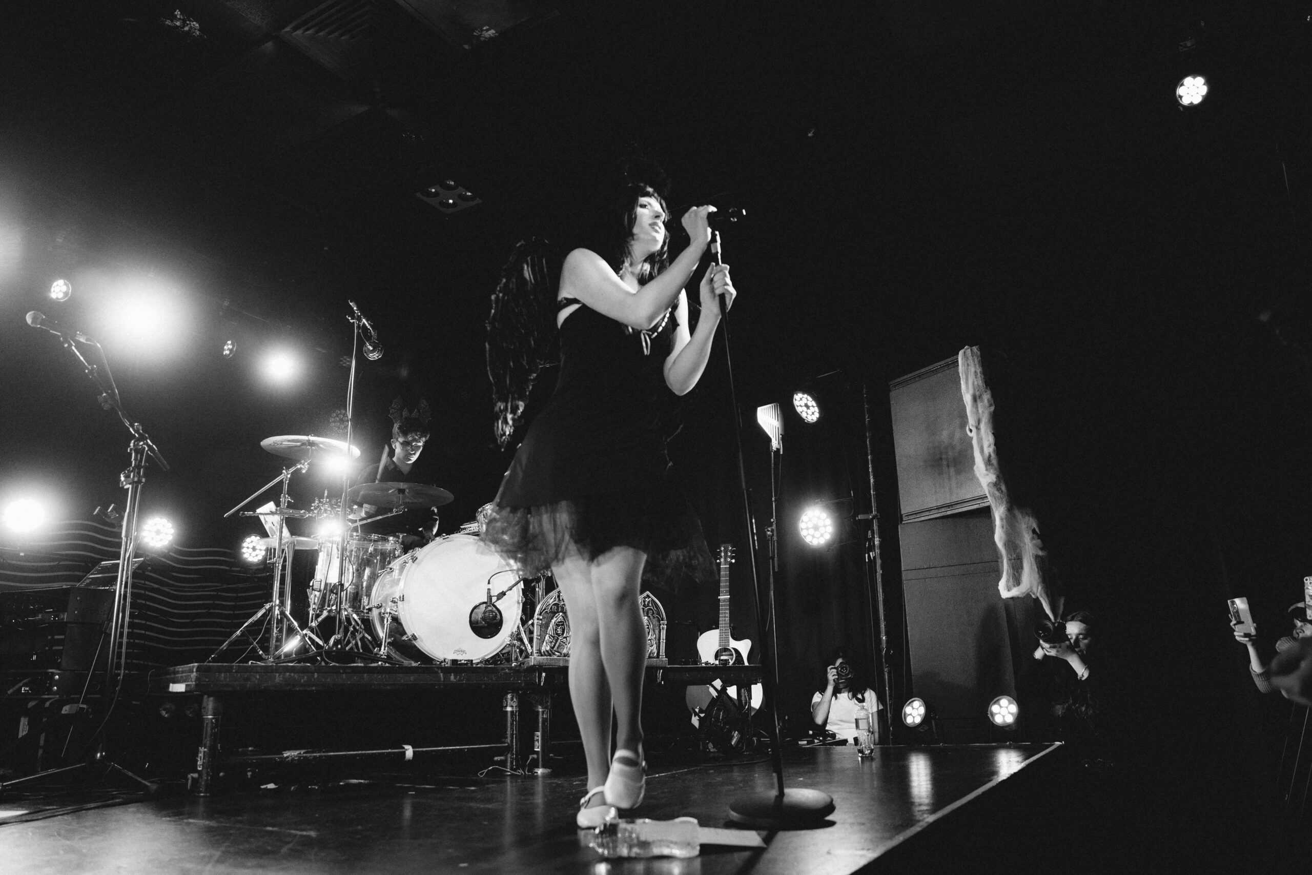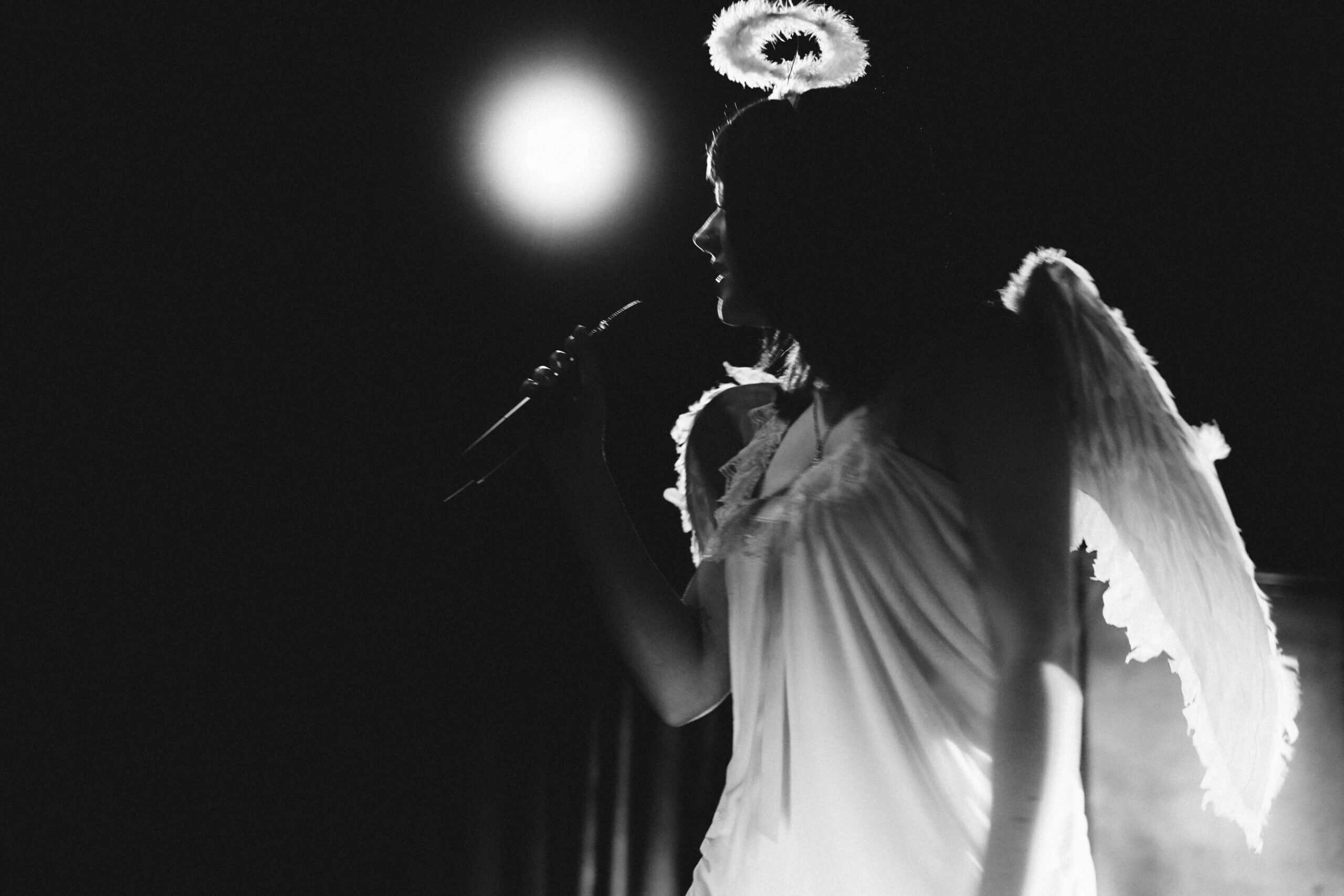 After a brief intermission, the stage went completely dark. Amid cheers from the crowd, Lucy ran onstage, dressed entirely in white â white shoes, a flowing white dress, white wings, and a white halo atop her head. Tonight, she was an angel. Behind her, guitarist Liam Beasley wore devil horns, and drummer Elliot Borland in demon wings, creating a visual contrast of angels and demons. With that, the three-piece performance officially began.
