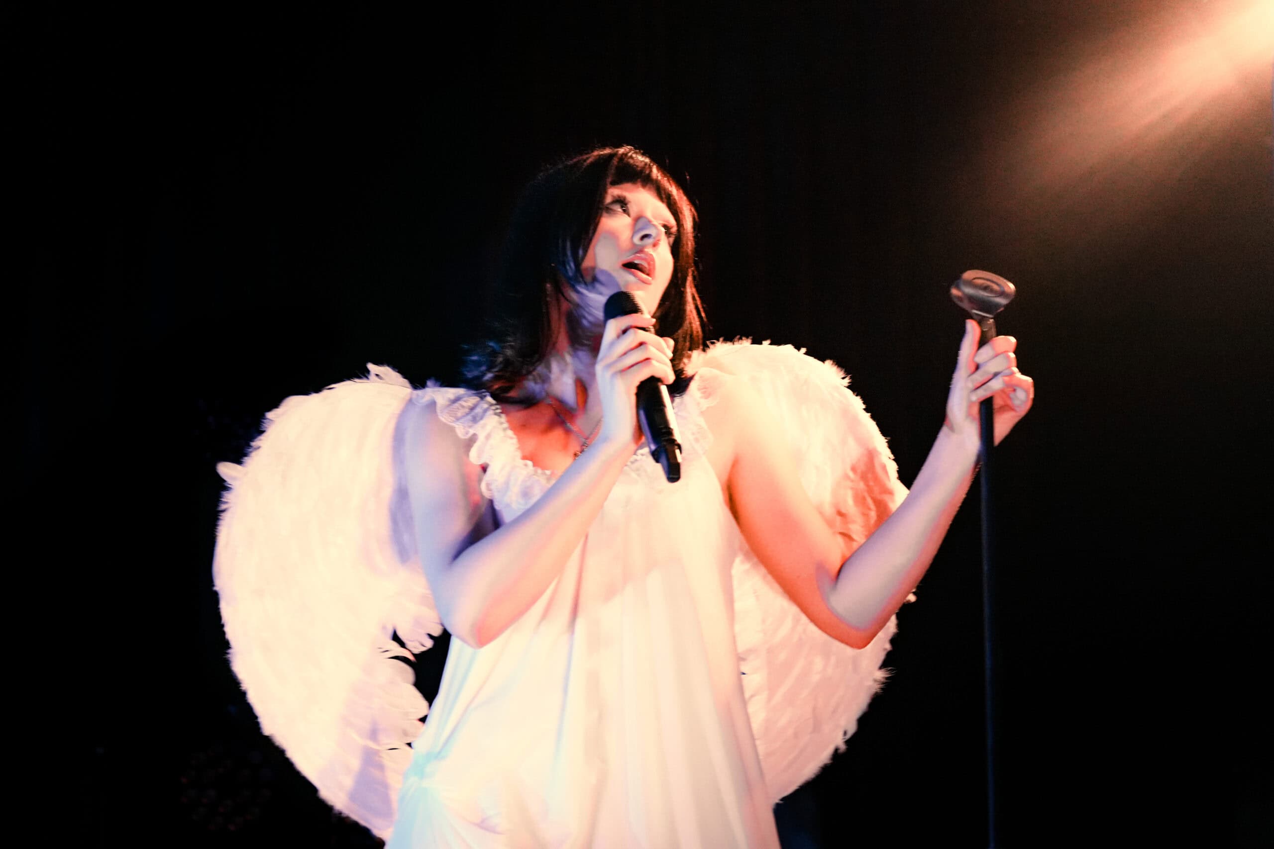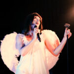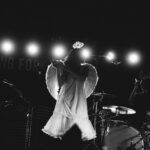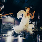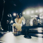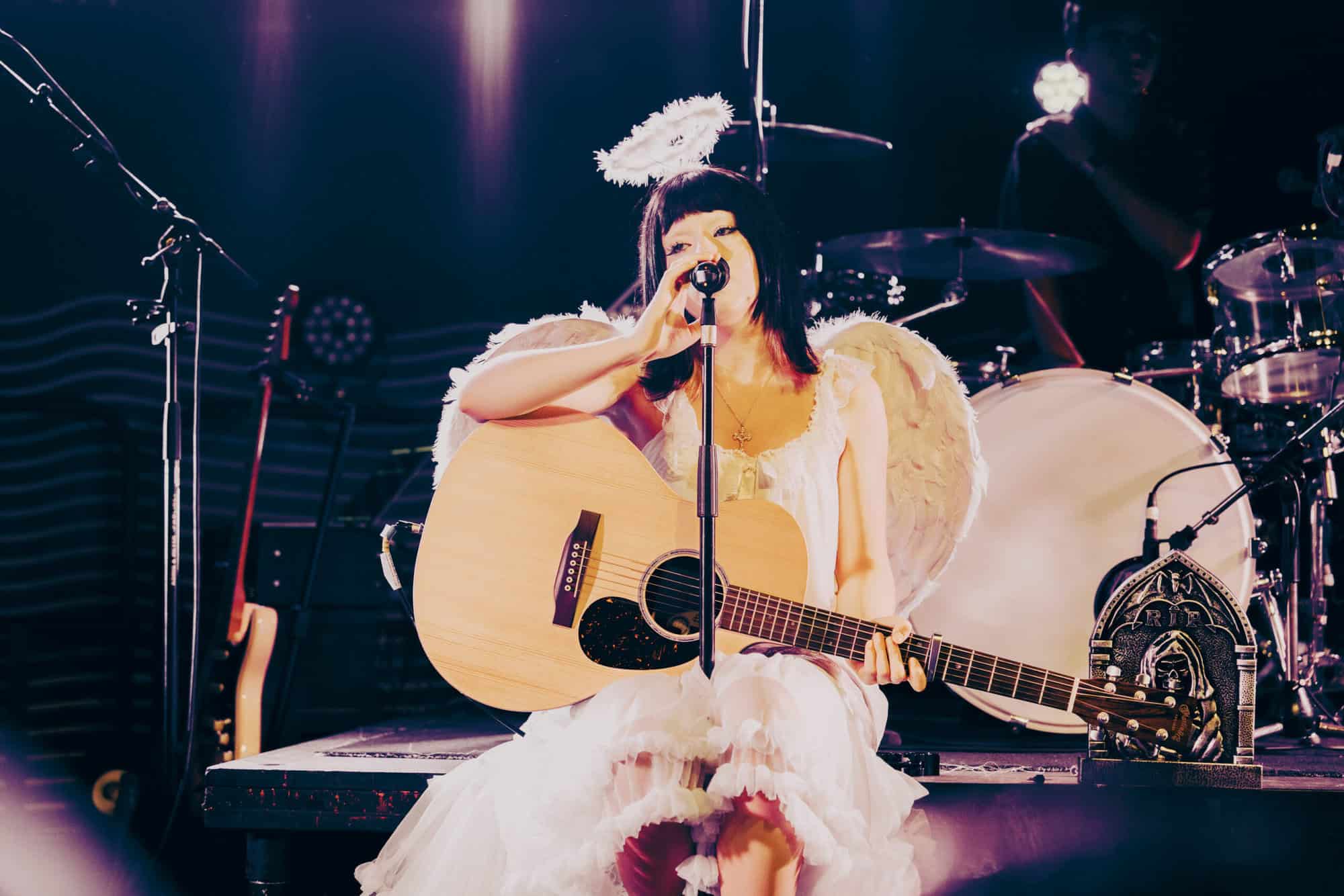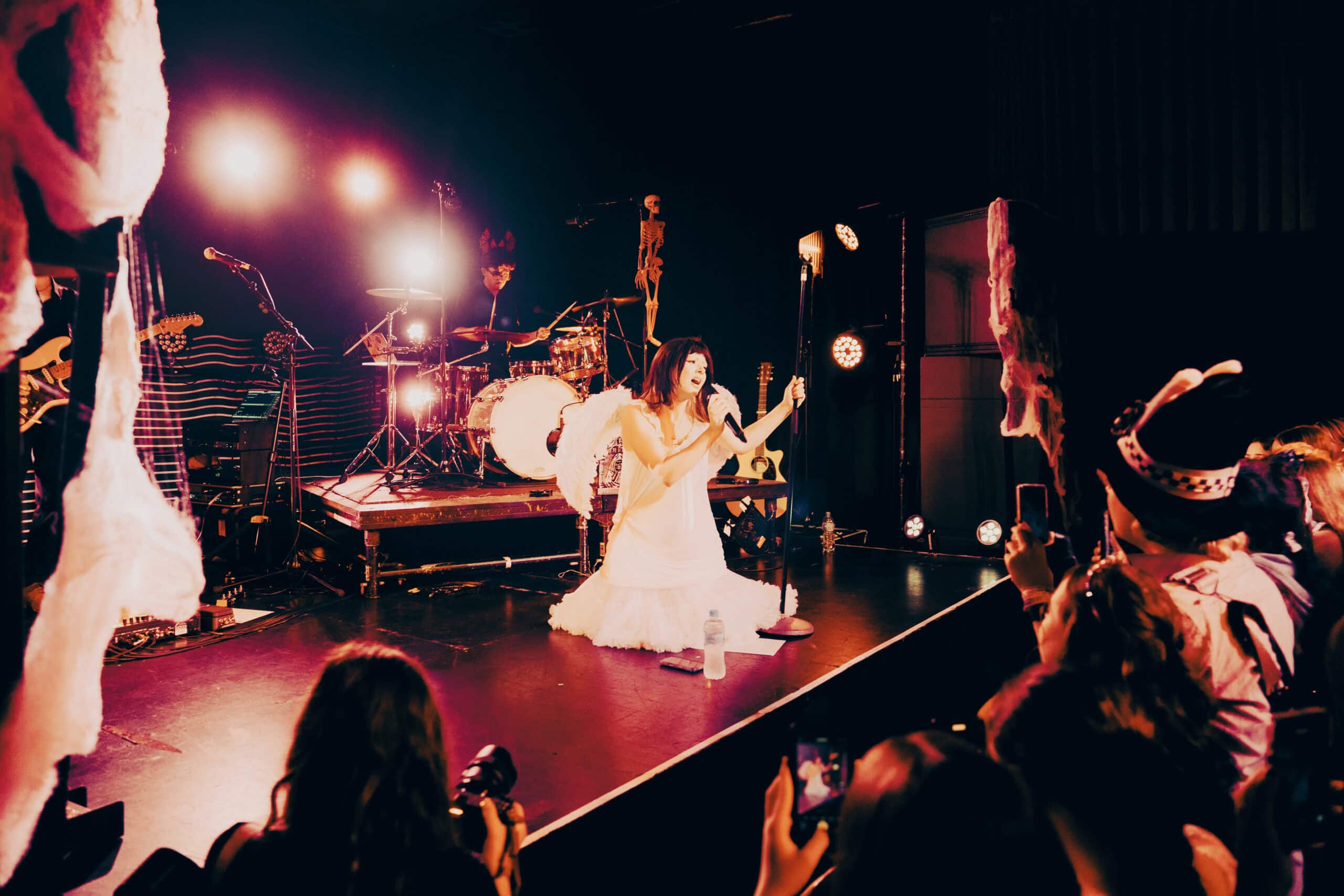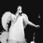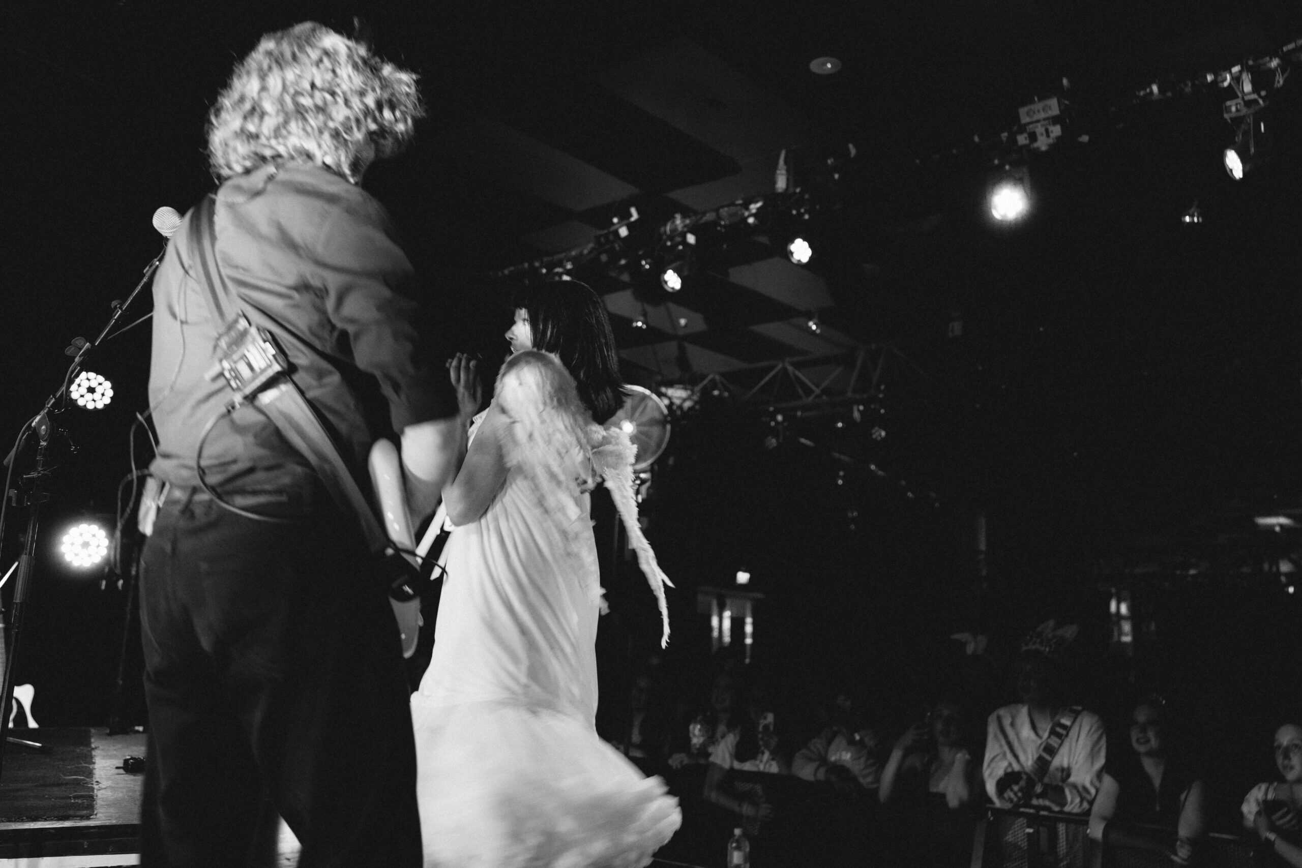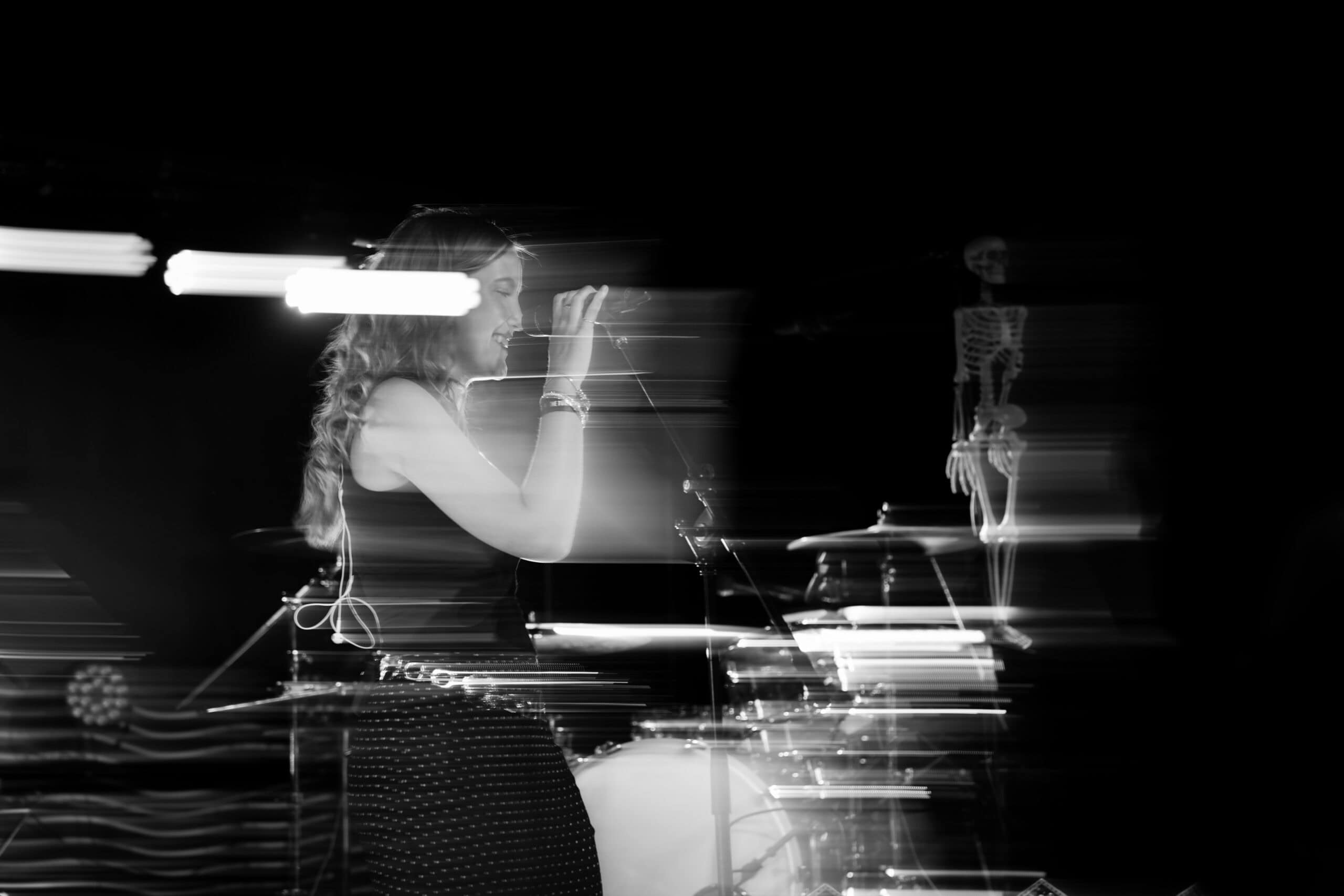 After a brief intermission, the stage went completely dark. Amid cheers from the crowd, Lucy ran onstage, dressed entirely in white â white shoes, a flowing white dress, white wings, and a white halo atop her head. Tonight, she was an angel. Behind her, guitarist Liam Beasley wore devil horns, and drummer Elliot Borland in demon wings, creating a visual contrast of angels and demons. With that, the three-piece performance officially began.