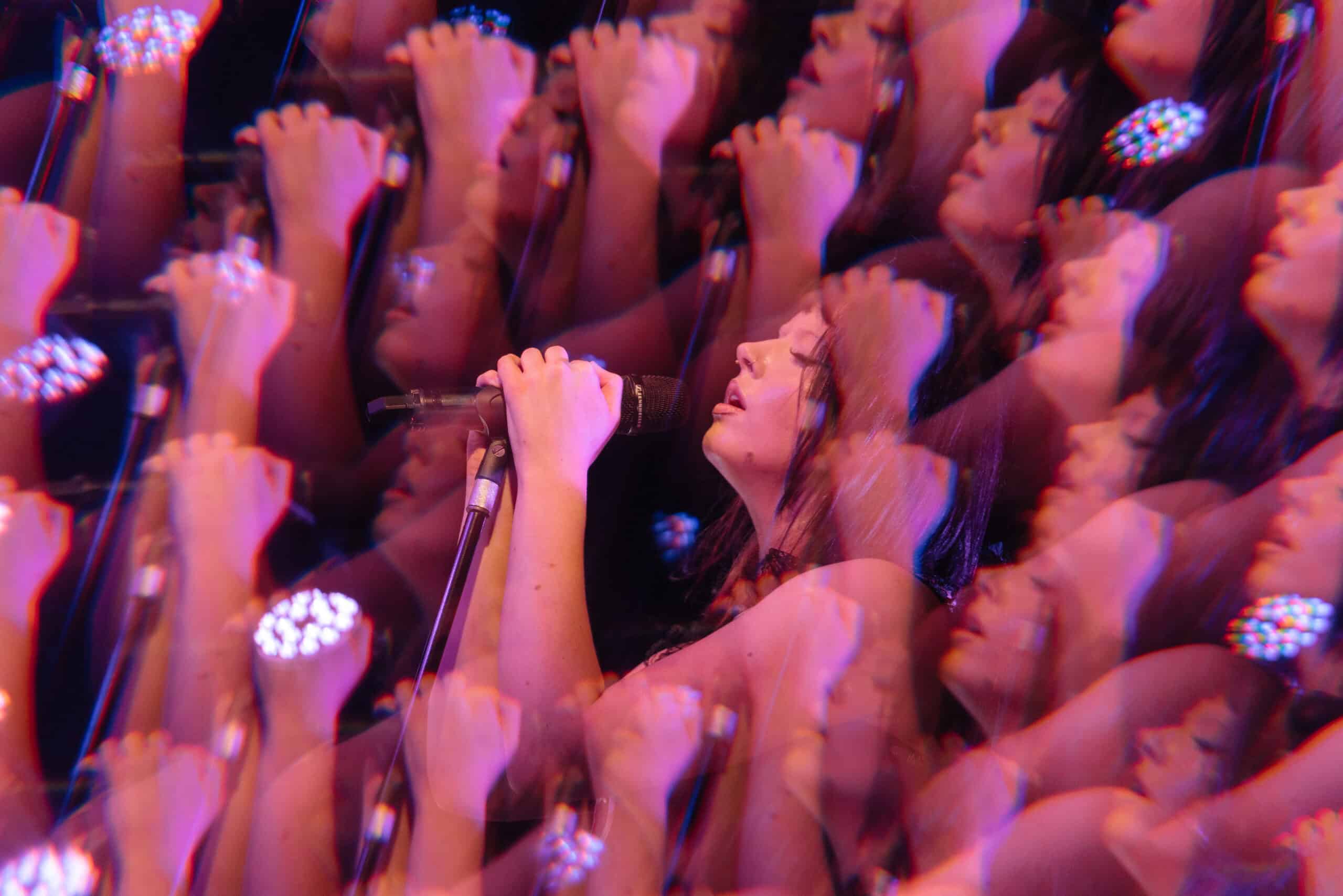 She began with Overdue, stripped back to an acoustic version. Without the studio polish or electronic effects, the song felt entirely reborn â fragile, raw, and intimate. Sitting on a clear plastic stool, she sang with a poise that was almost cinematic, offering her stories to the crowd in hushed honesty.