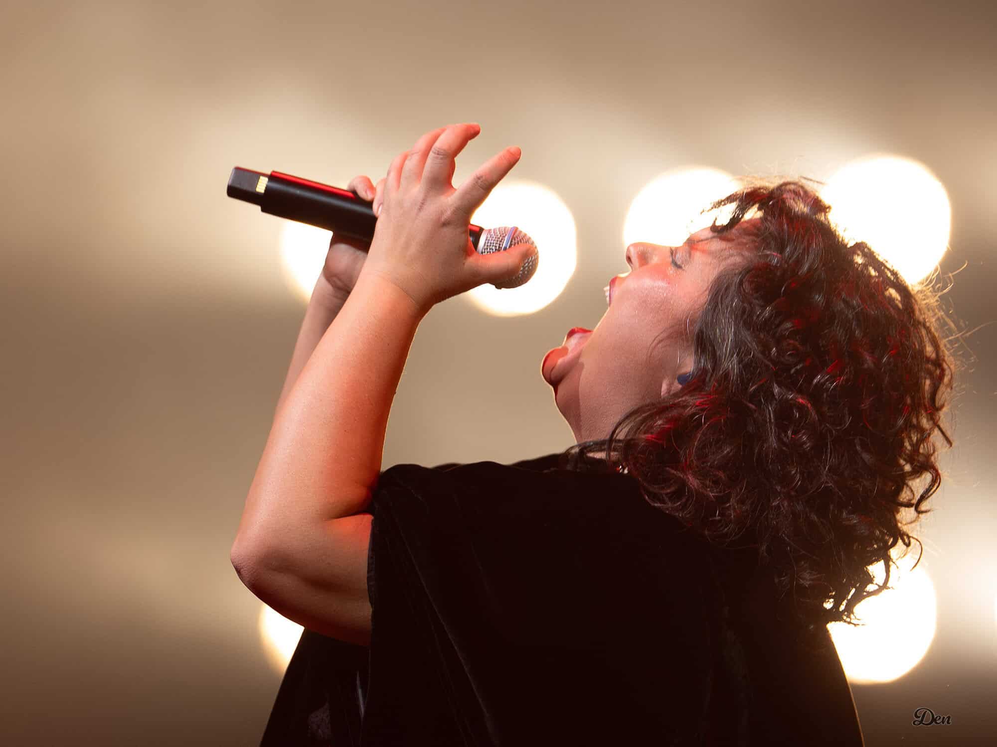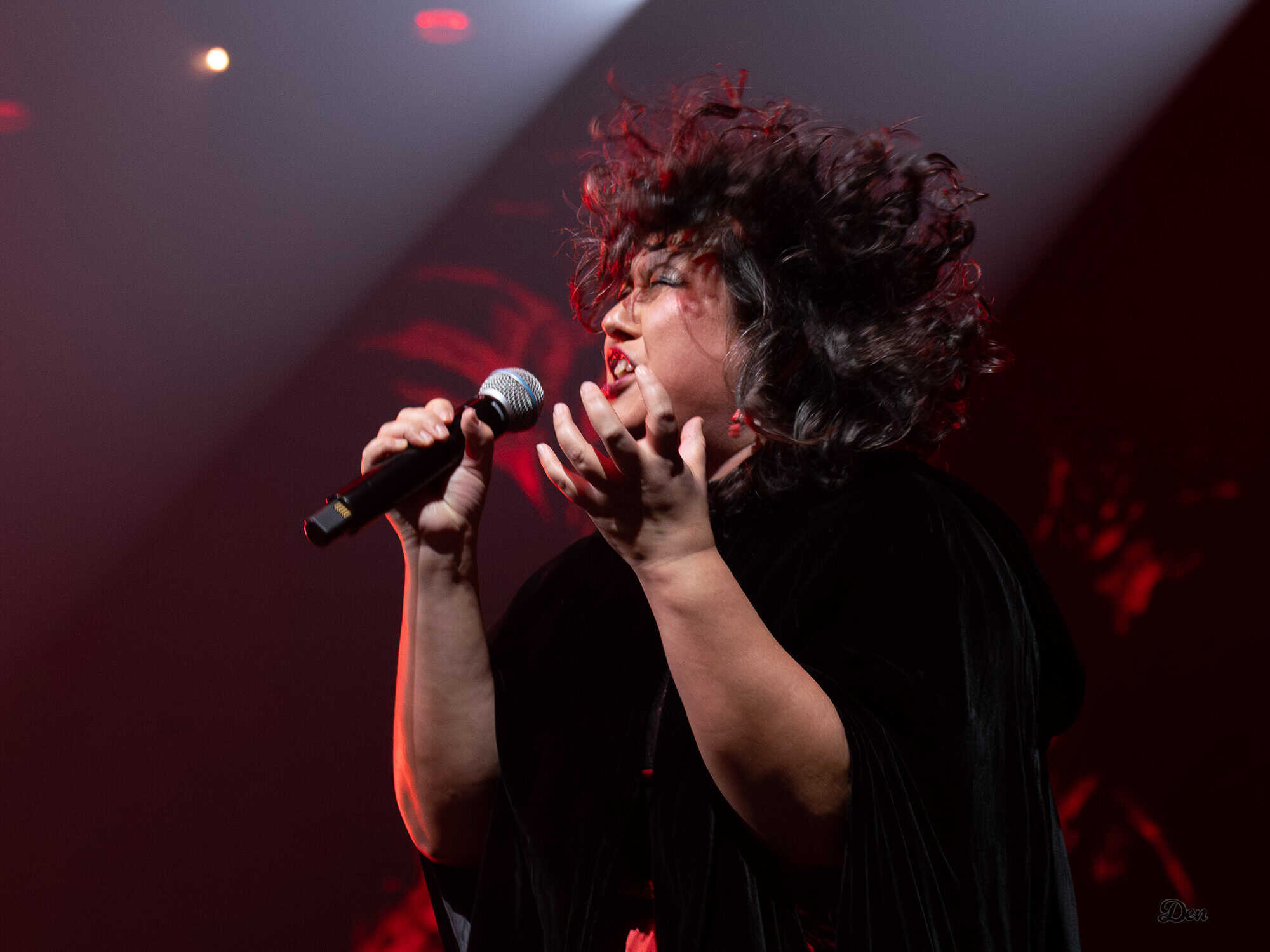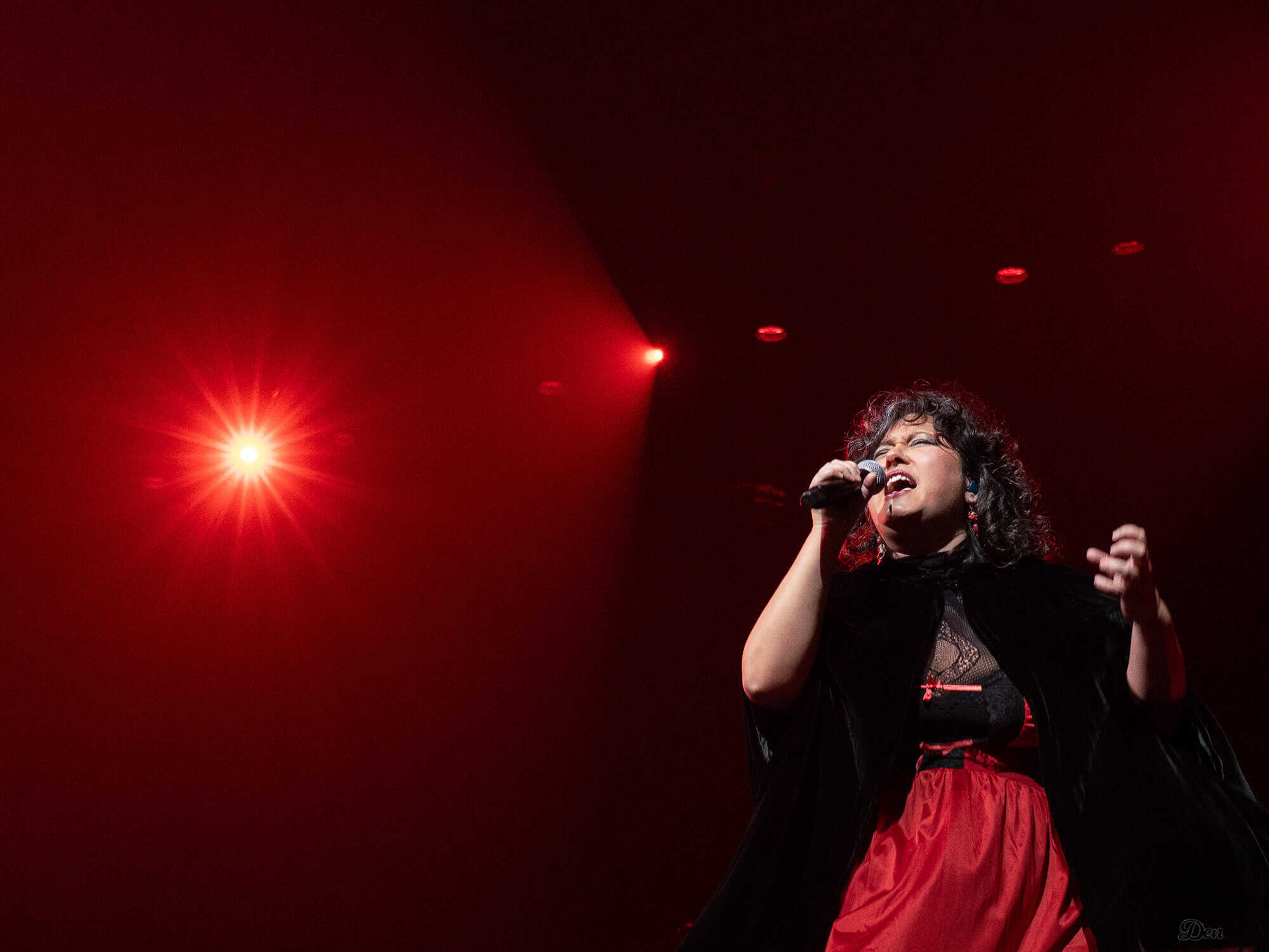 Then came EJ Barnes in a black cloak, theatrical with the first signs of pyro. She performed Enter Sandman and the crowd grew louder. I’m familiar with EJ’s vocals from the Come Together shows and it was electric as always.