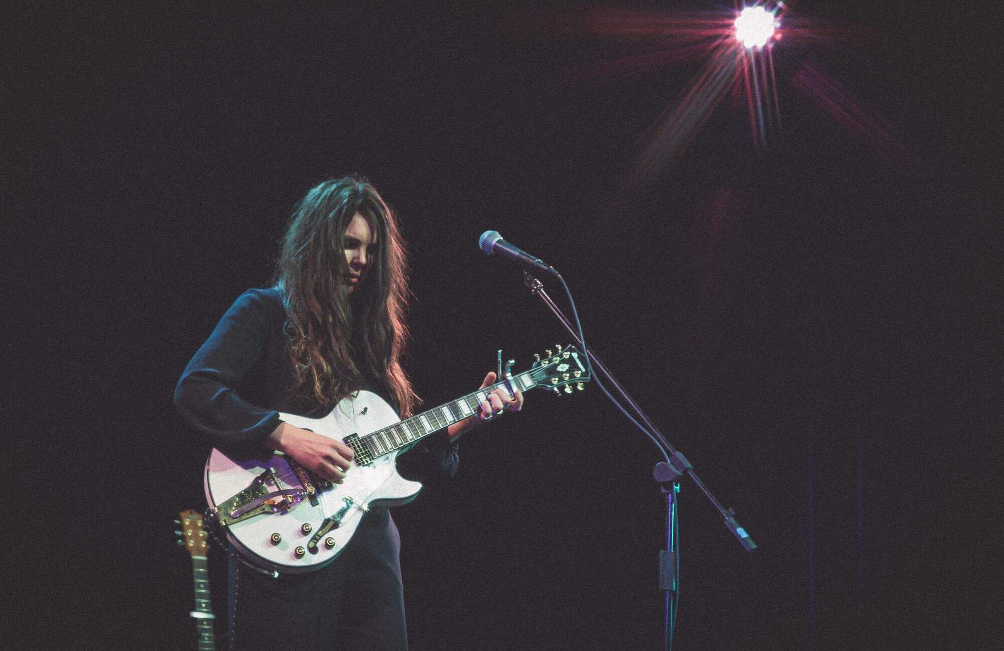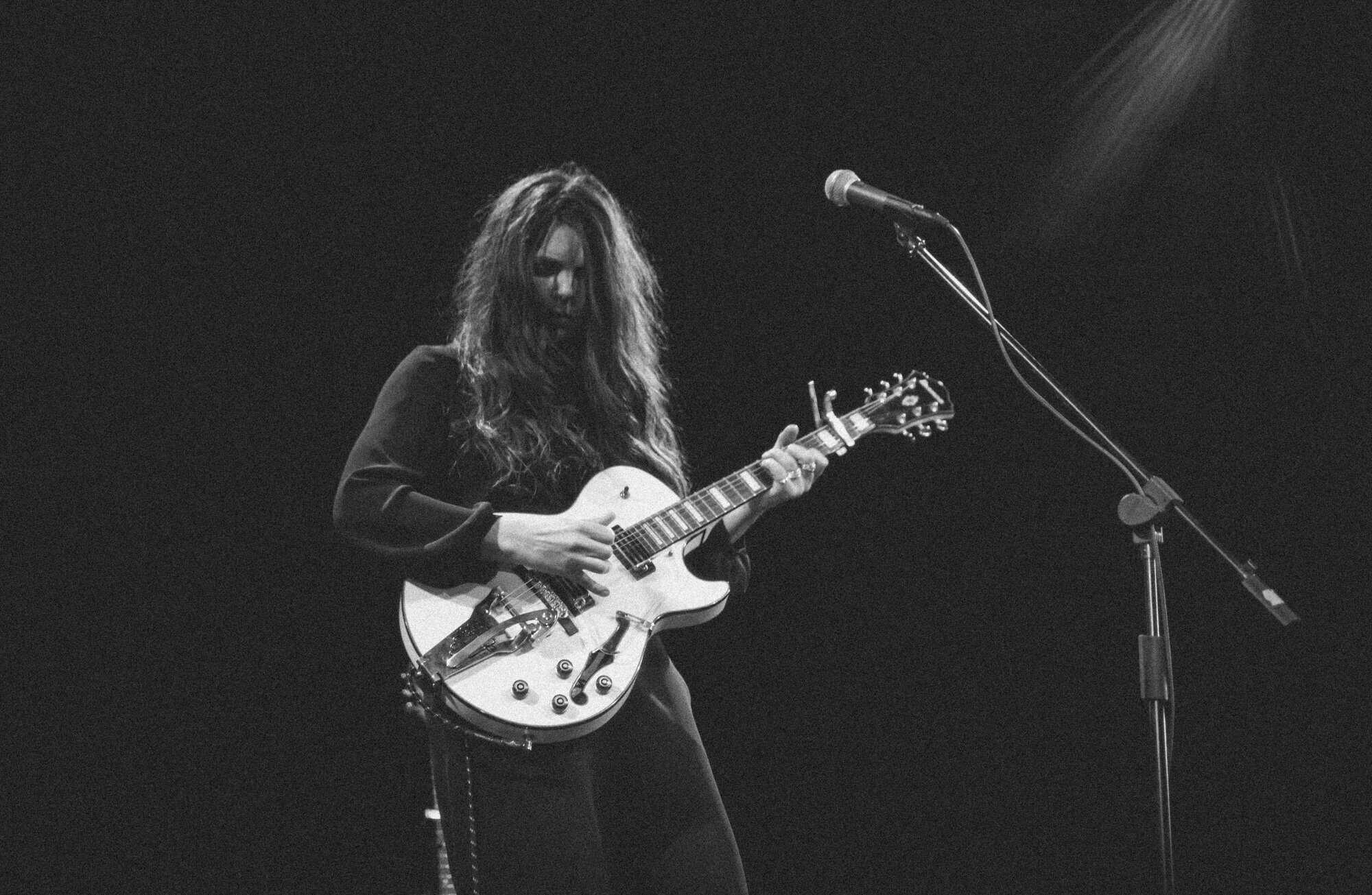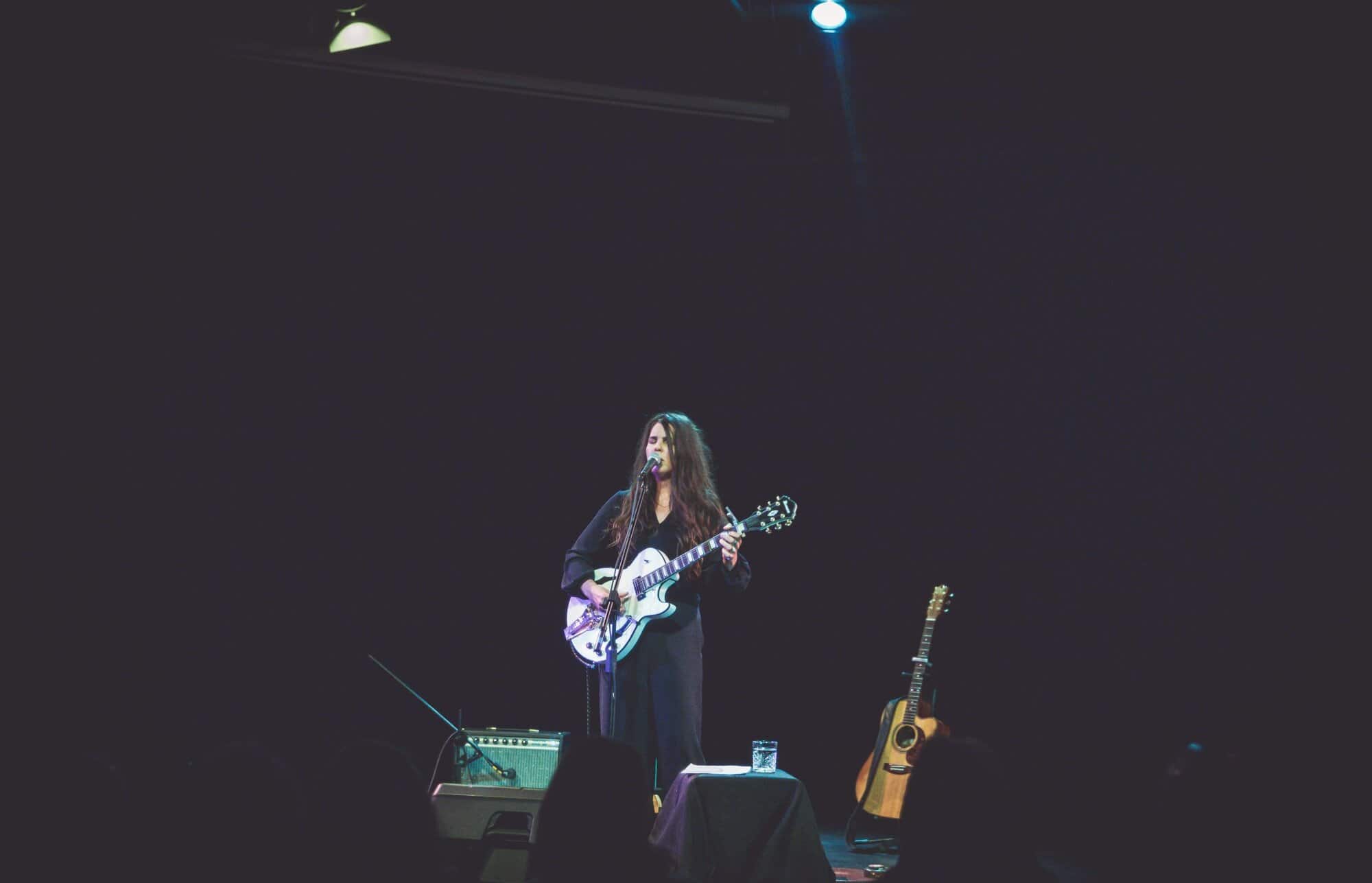 It’s not often that tour itineraries go offshore, so no surprise Artworks Theatre is sold out. Mel walks on in black, her electric guitar a striking white.