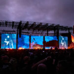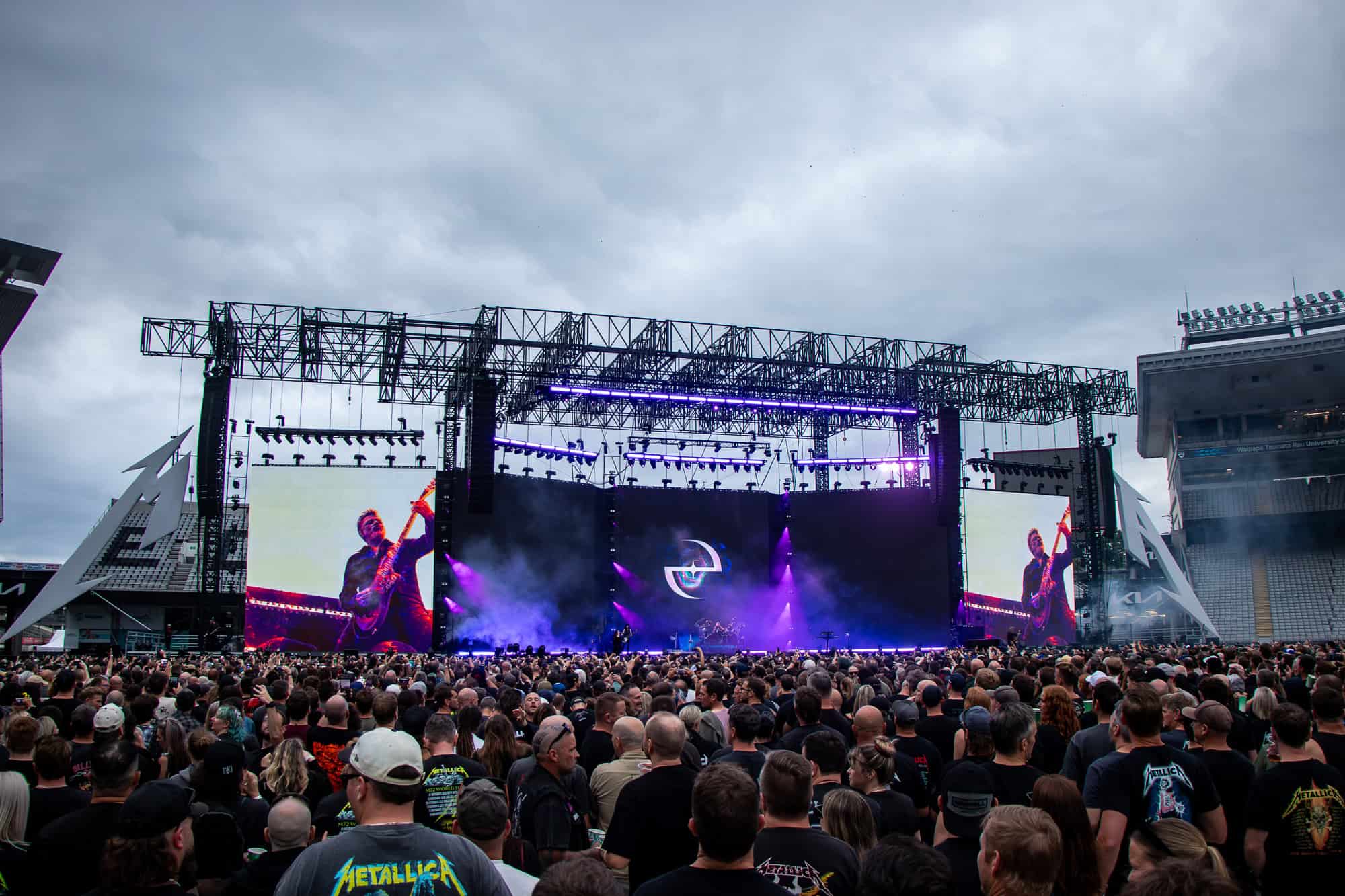 Inside, Eden Park looked like it had been converted into some enormous breathing organism. Thousands of people poured across the field and into the stands, swarming the concrete bowl like ants around the world’s biggest amp. The stage dominated the eastern end: towering screens, a wall of lighting rigs, and those huge tilted “M” and “A” structures bookending everything so that when the full METALLICA logo appeared at the farewell of the set, it felt like a gargantuan digital monolith. An almost tangible energy rippled through the air, the conversations, and the crowd; this was more a city-sized ritual than a concert.