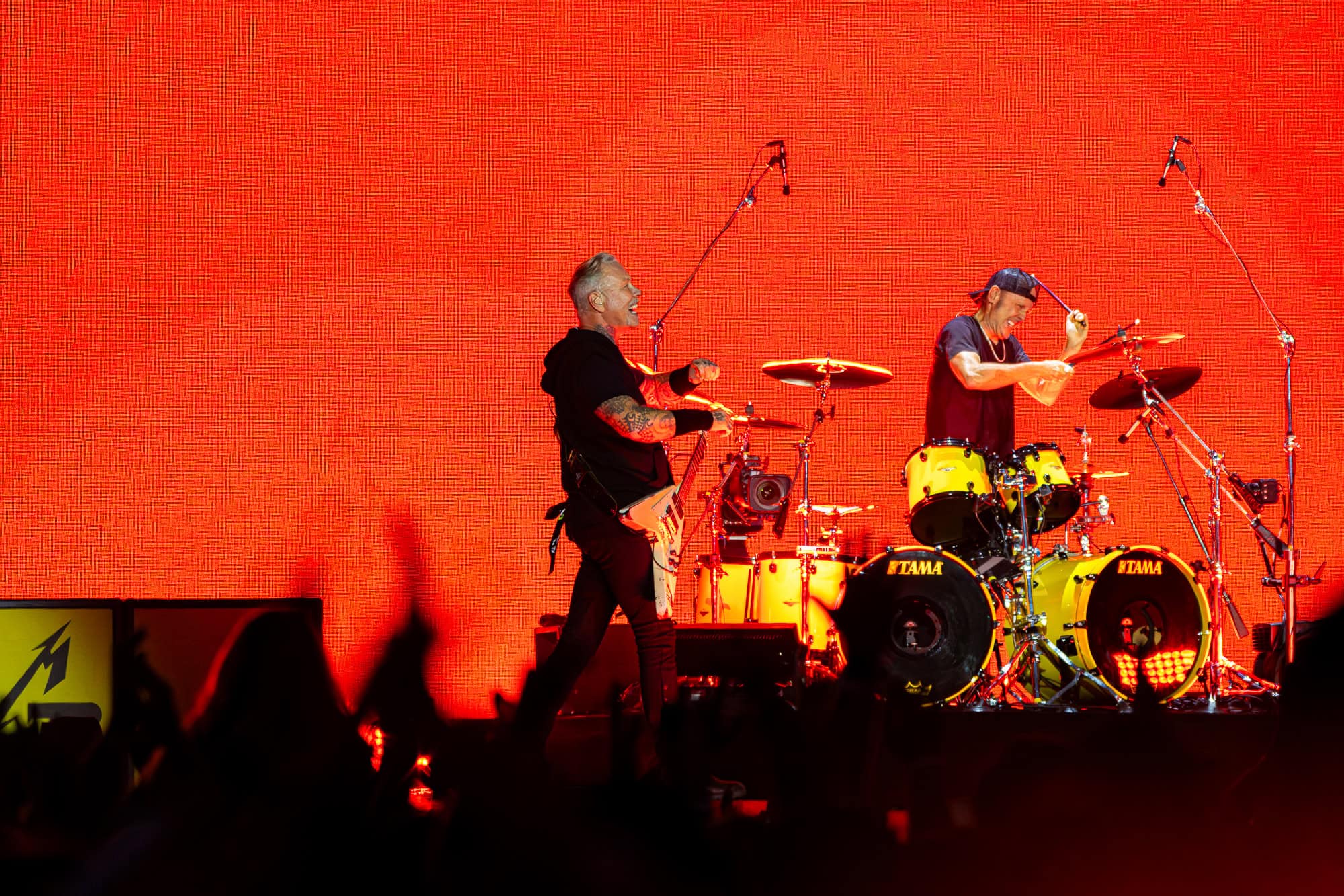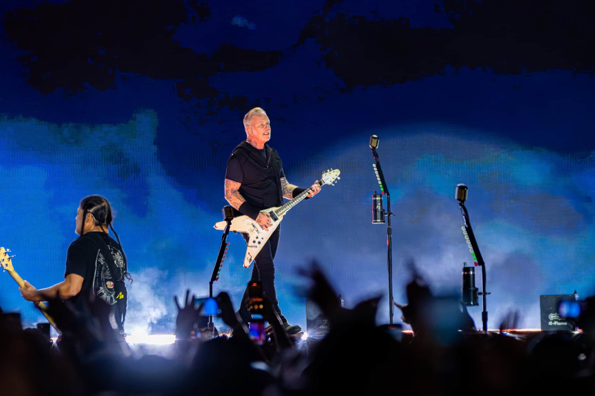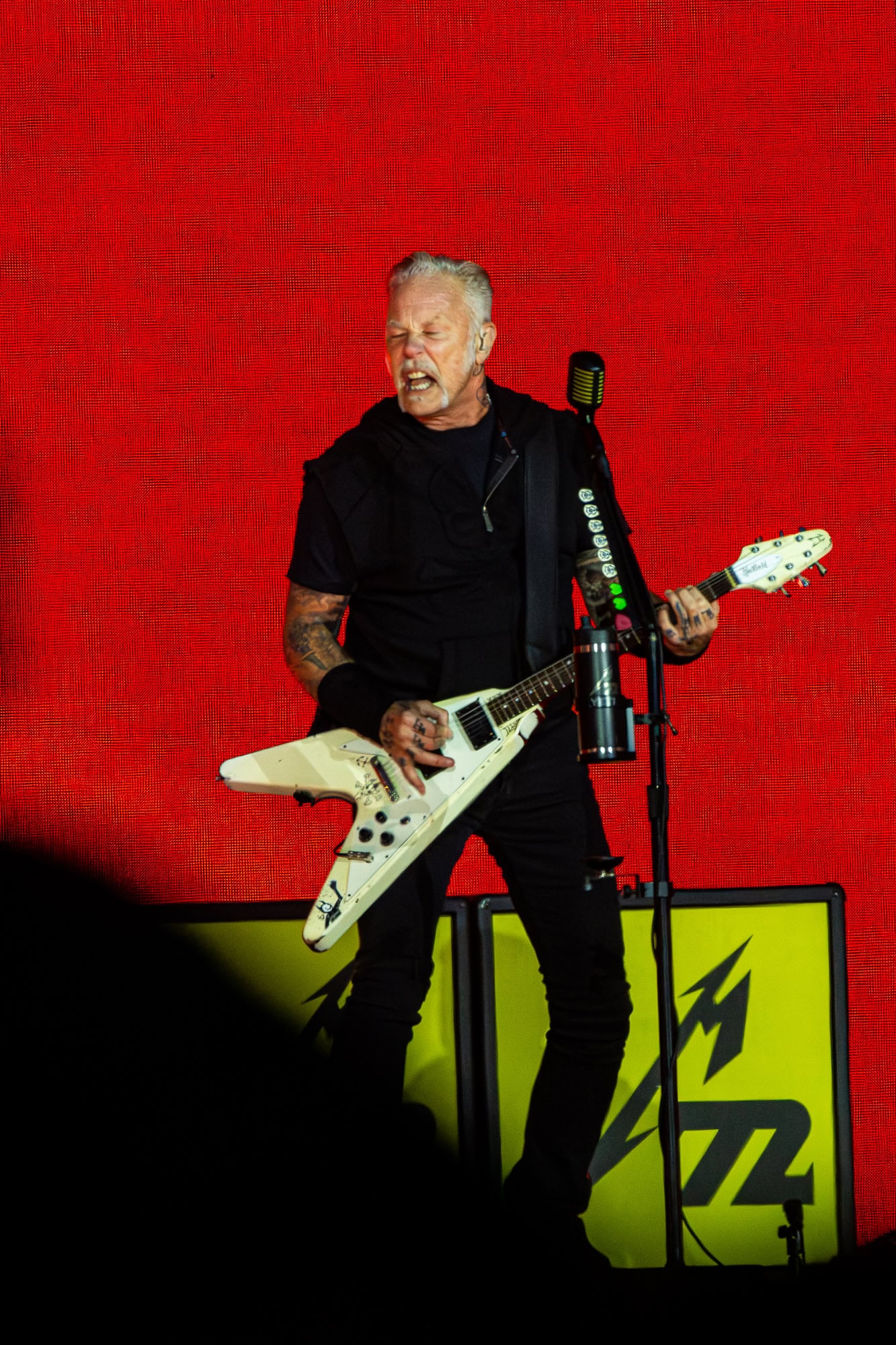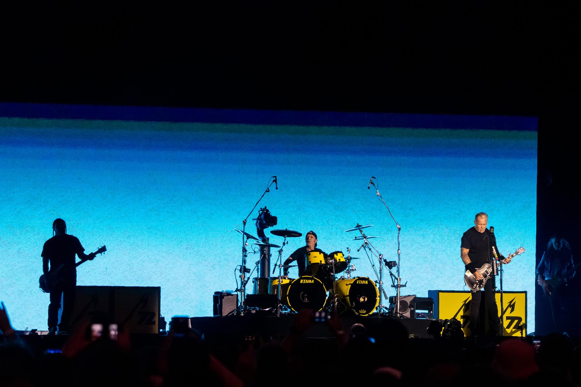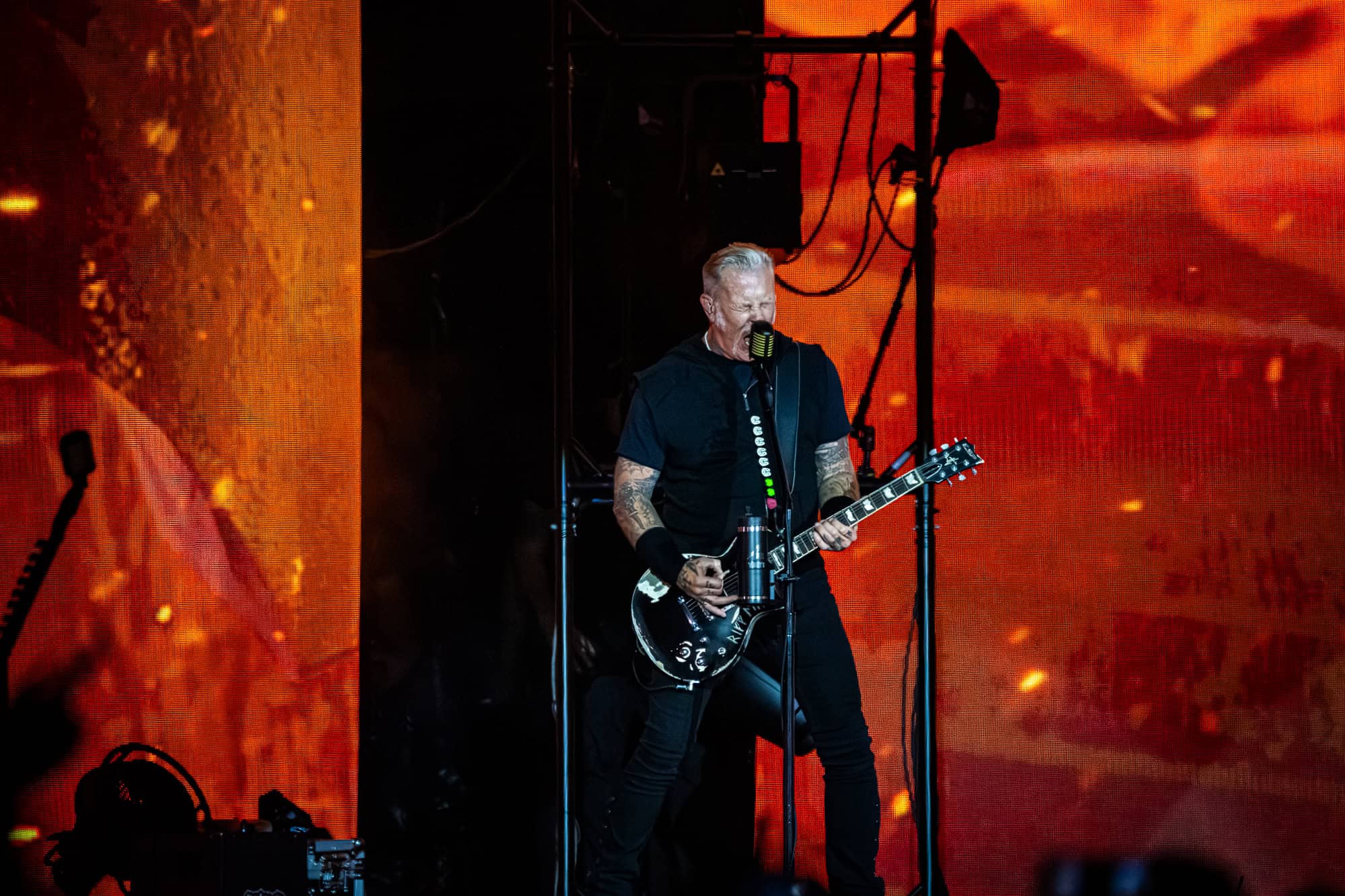 Metallica walked on like men who have been doing this longer than most of the crowd has been alive. James Hetfield stepped up to the chunky, chrome vintage-style microphones with that familiar, controlled swagger; Kirk Hammett grinned like he was already halfway through a solo; Robert Trujillo stalked his corner of the stage with that low, wide stance that makes his bass look like a weapon; and Lars Ulrich climbed up behind the kit, drumsticks prepared for the kind of theatrical confidence only he can get away with.