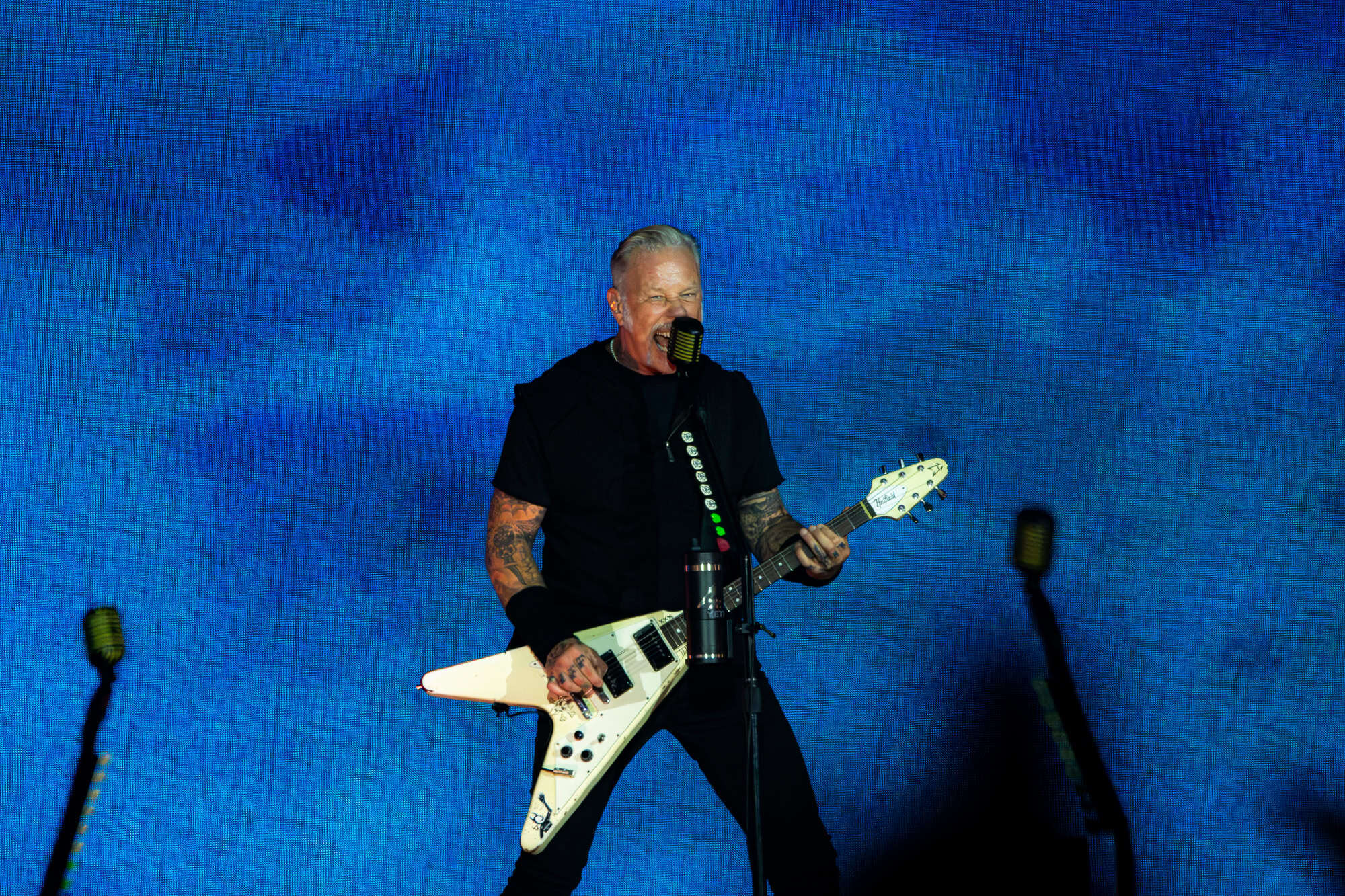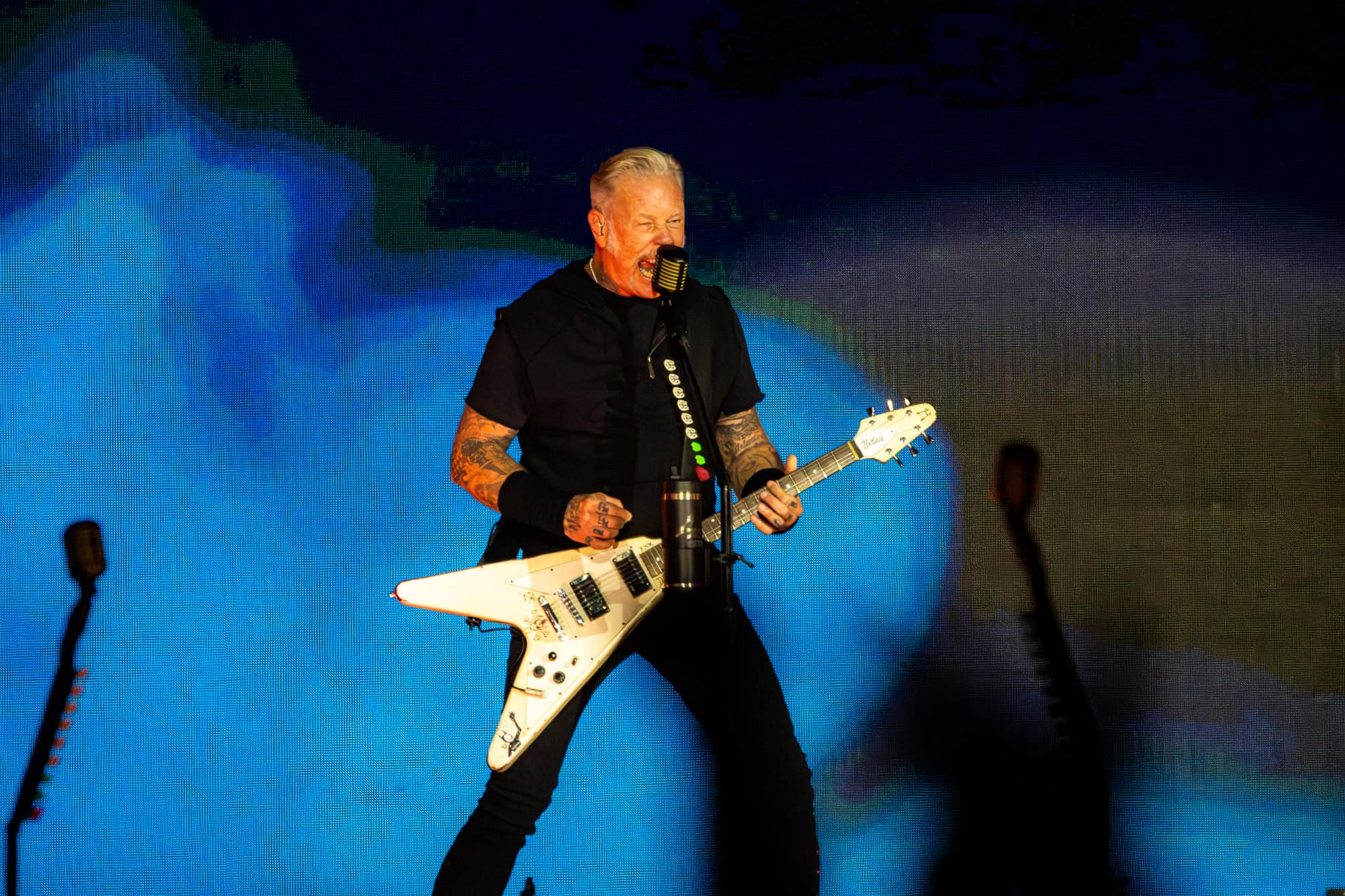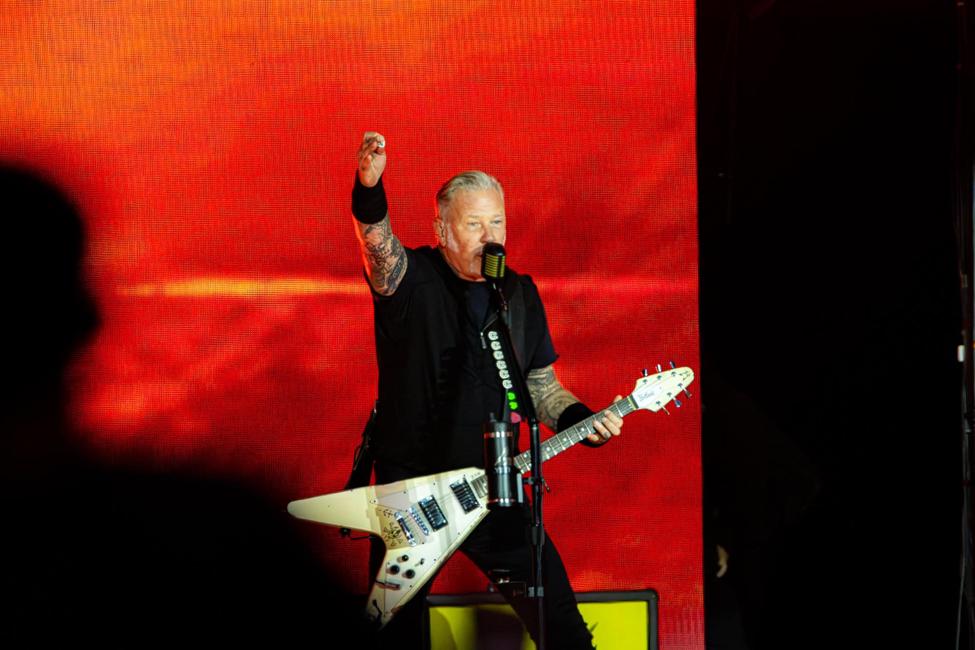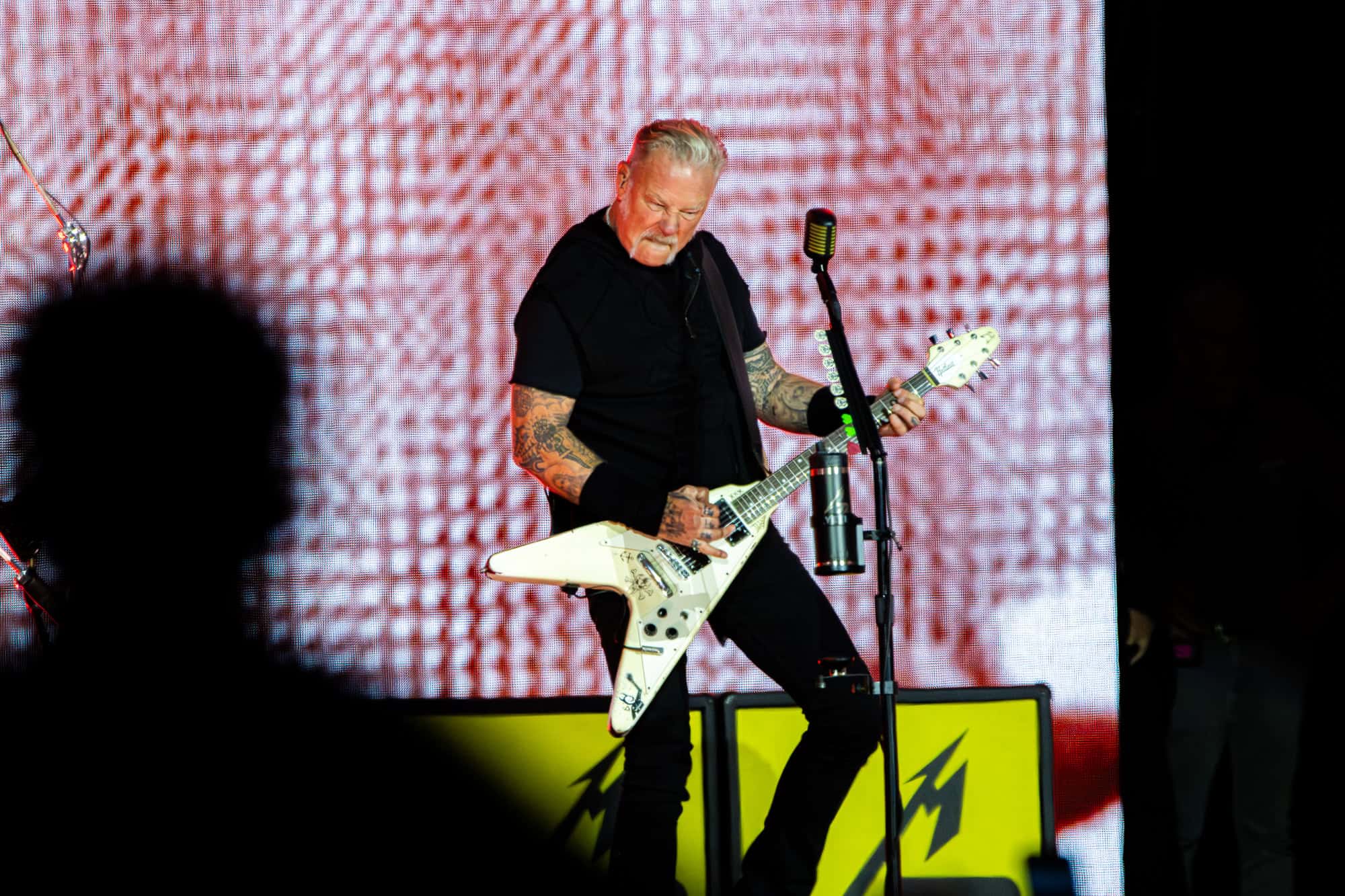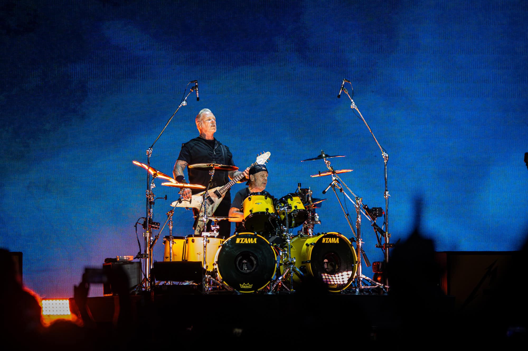 Metallica walked on like men who have been doing this longer than most of the crowd has been alive. James Hetfield stepped up to the chunky, chrome vintage-style microphones with that familiar, controlled swagger; Kirk Hammett grinned like he was already halfway through a solo; Robert Trujillo stalked his corner of the stage with that low, wide stance that makes his bass look like a weapon; and Lars Ulrich climbed up behind the kit, drumsticks prepared for the kind of theatrical confidence only he can get away with.