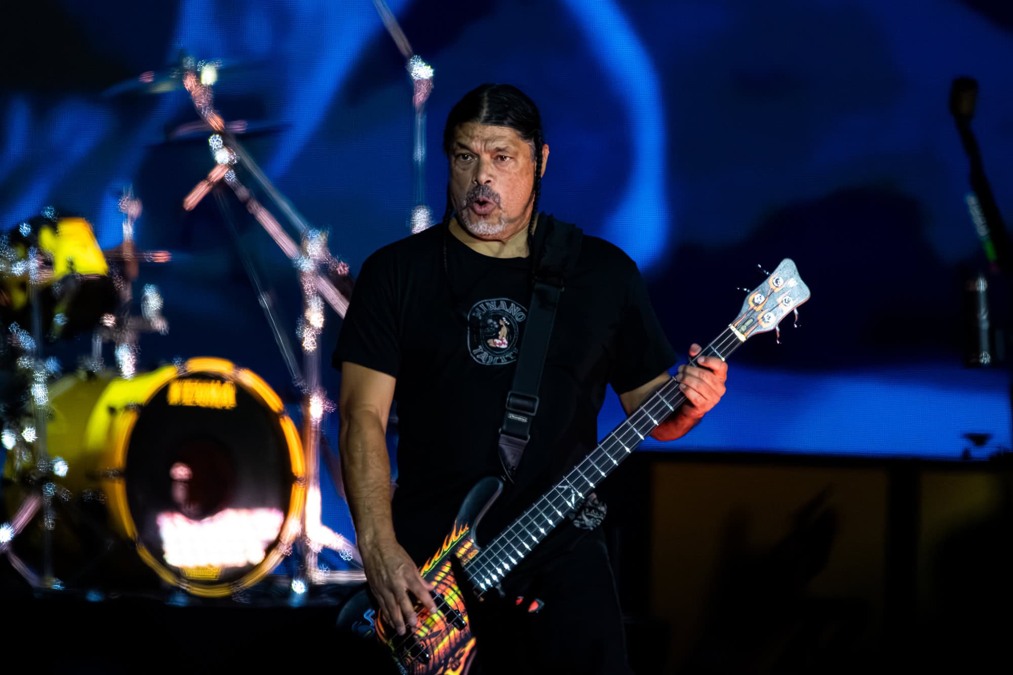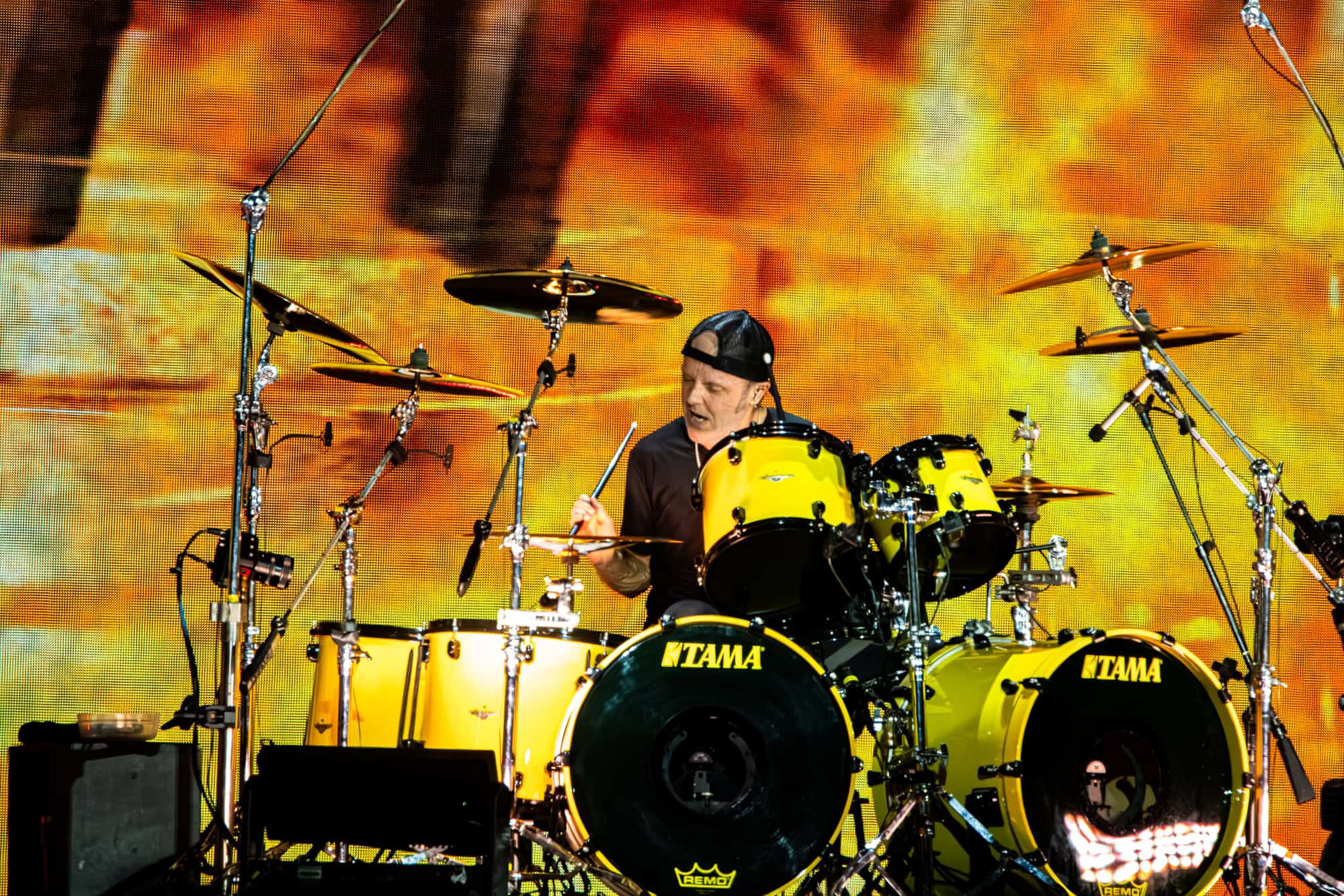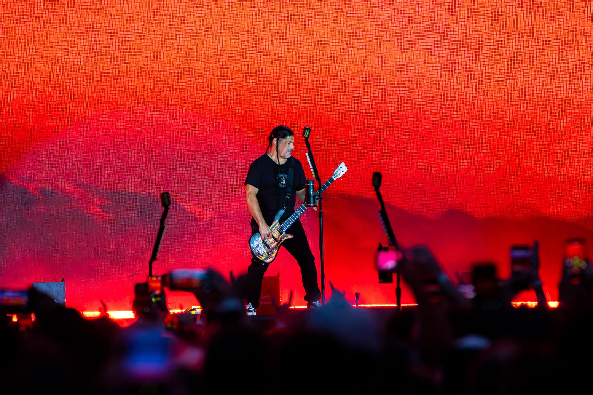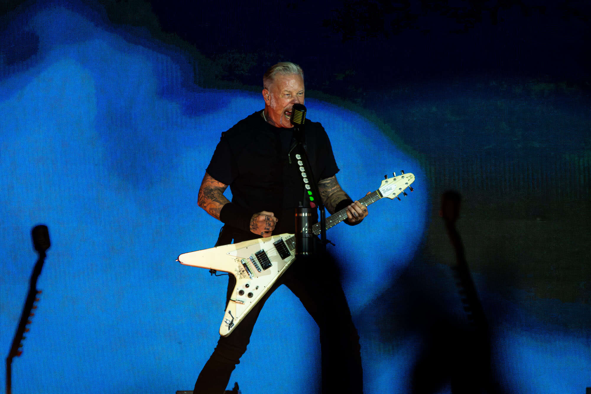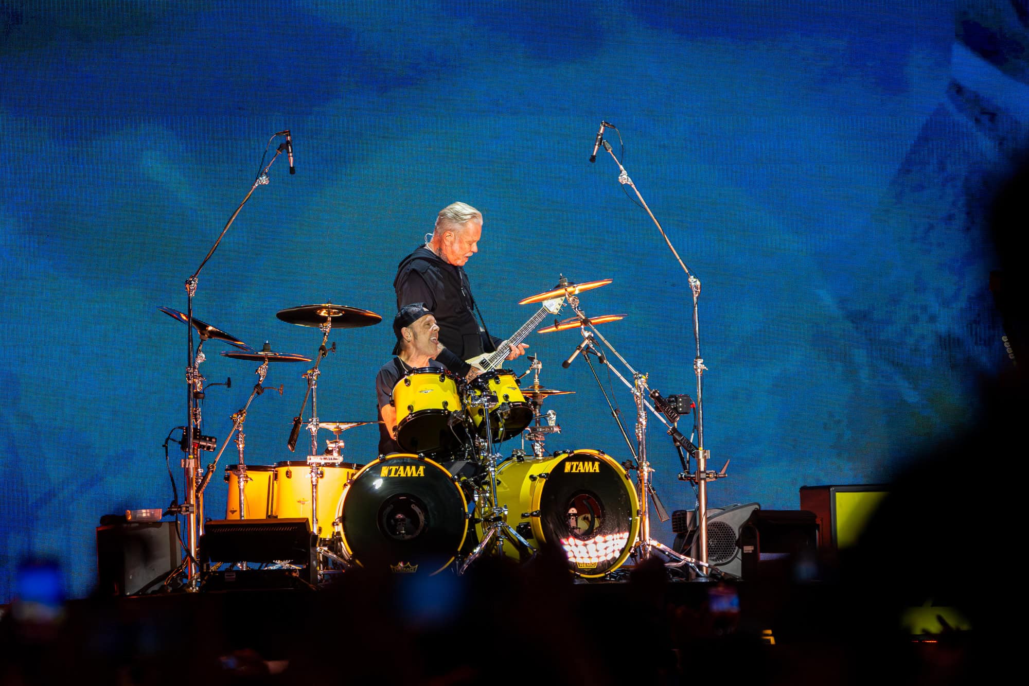Metallica walked on like men who have been doing this longer than most of the crowd has been alive. James Hetfield stepped up to the chunky, chrome vintage-style microphones with that familiar, controlled swagger; Kirk Hammett grinned like he was already halfway through a solo; Robert Trujillo stalked his corner of the stage with that low, wide stance that makes his bass look like a weapon; and Lars Ulrich climbed up behind the kit, drumsticks prepared for the kind of theatrical confidence only he can get away with.