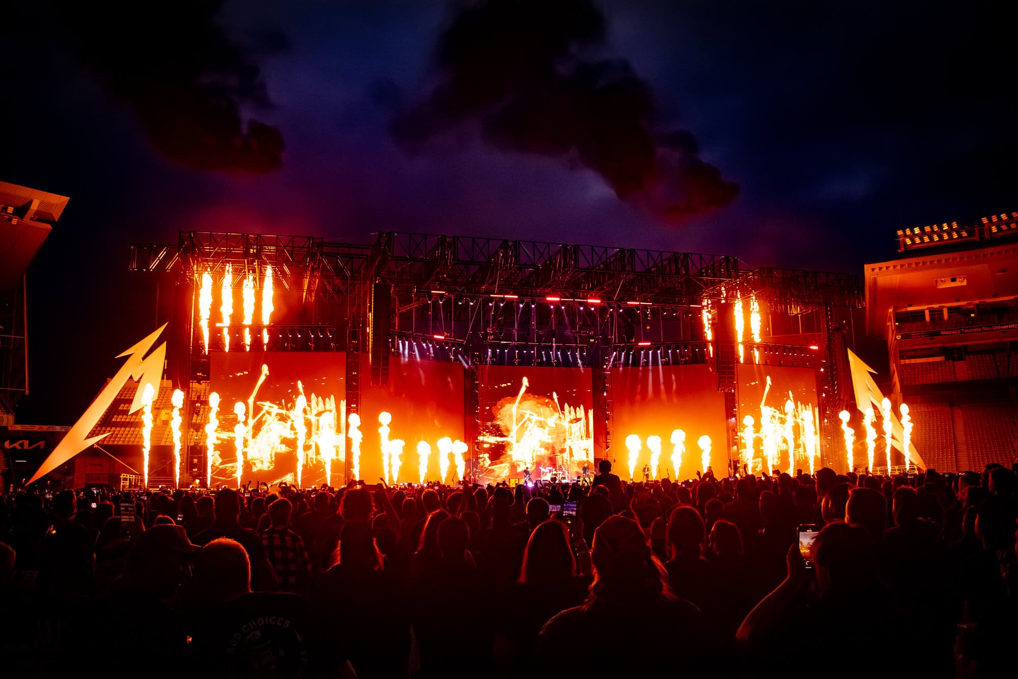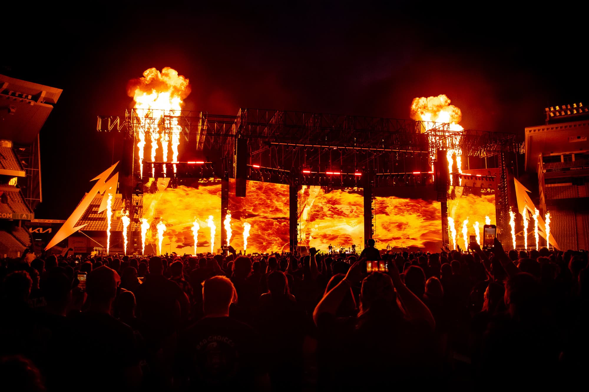For Whom The Bell Tolls followed, those chugging bass notes stalking across the field like something huge and unseen. Fuel ignited the front rows, literal jets of flame punctuating every chorus while strobes flickered like a broken engine room. Harvester Of Sorrow lumbered in, slow and menacing, a reminder of how deep and heavy their late-80s catalogue still is. The Unforgiven brought the first real mass singalong, thousands of voices turning that melancholy chorus into something fragile and communal. Wherever I May Roam all frantic pace and searing lights, lasers carving bright lines through the night.