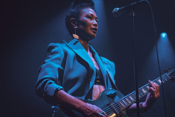 Besides, there’s no time to worry about that, Stellar* is about to bring me back to my misspent youth. New Religion is as familiar as it is welcome. Boh Runga immediately captivates, owning the stage. Her voice soars, as good as ever and it was, and it was always incredible. She’s giving us attitude in an oversized blue blazer and cut out crop top straight from her cool classy 90s look. Be Undone gets us into the groove and we all sing along. They kick into Maxine, a cover of a Sharon O’Neill song, a banger of a tune based on a dark crime. We sing along to that too.