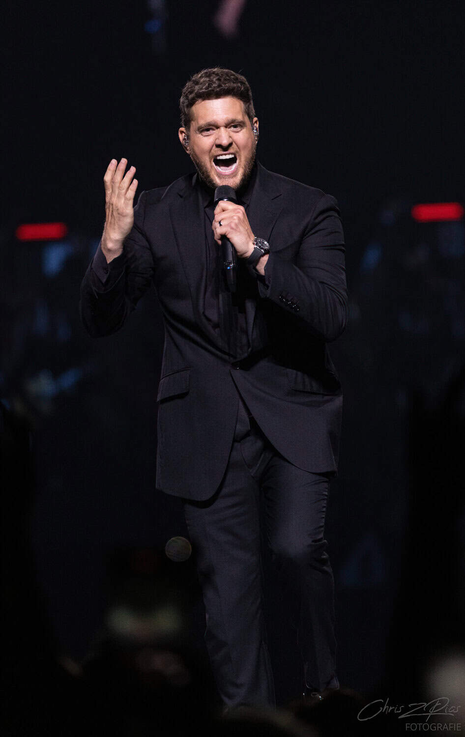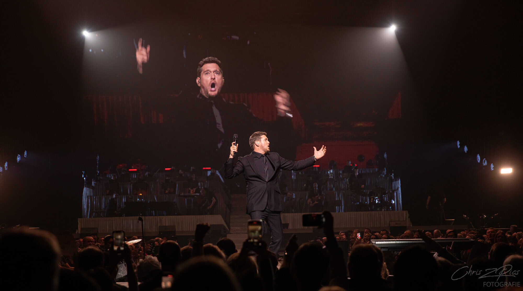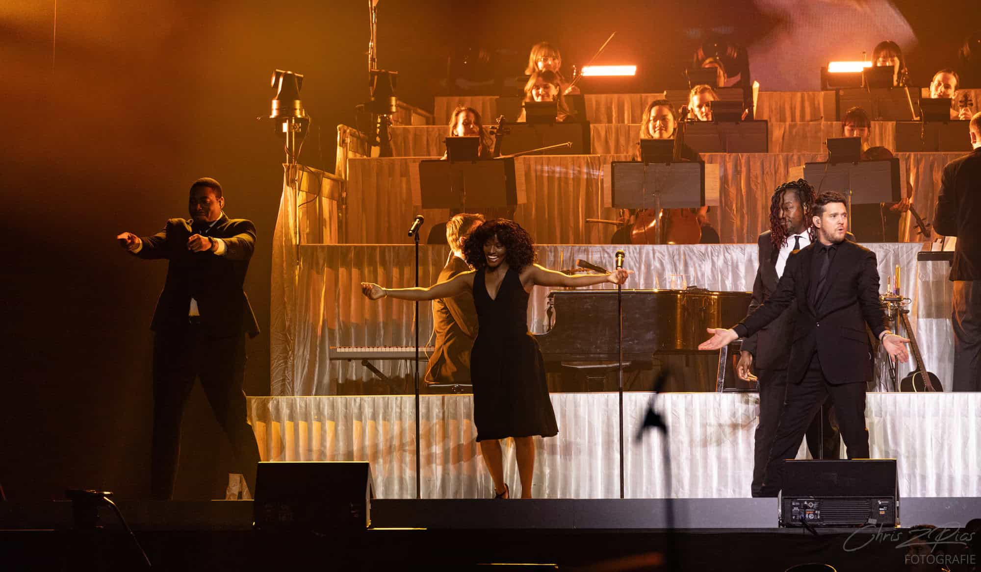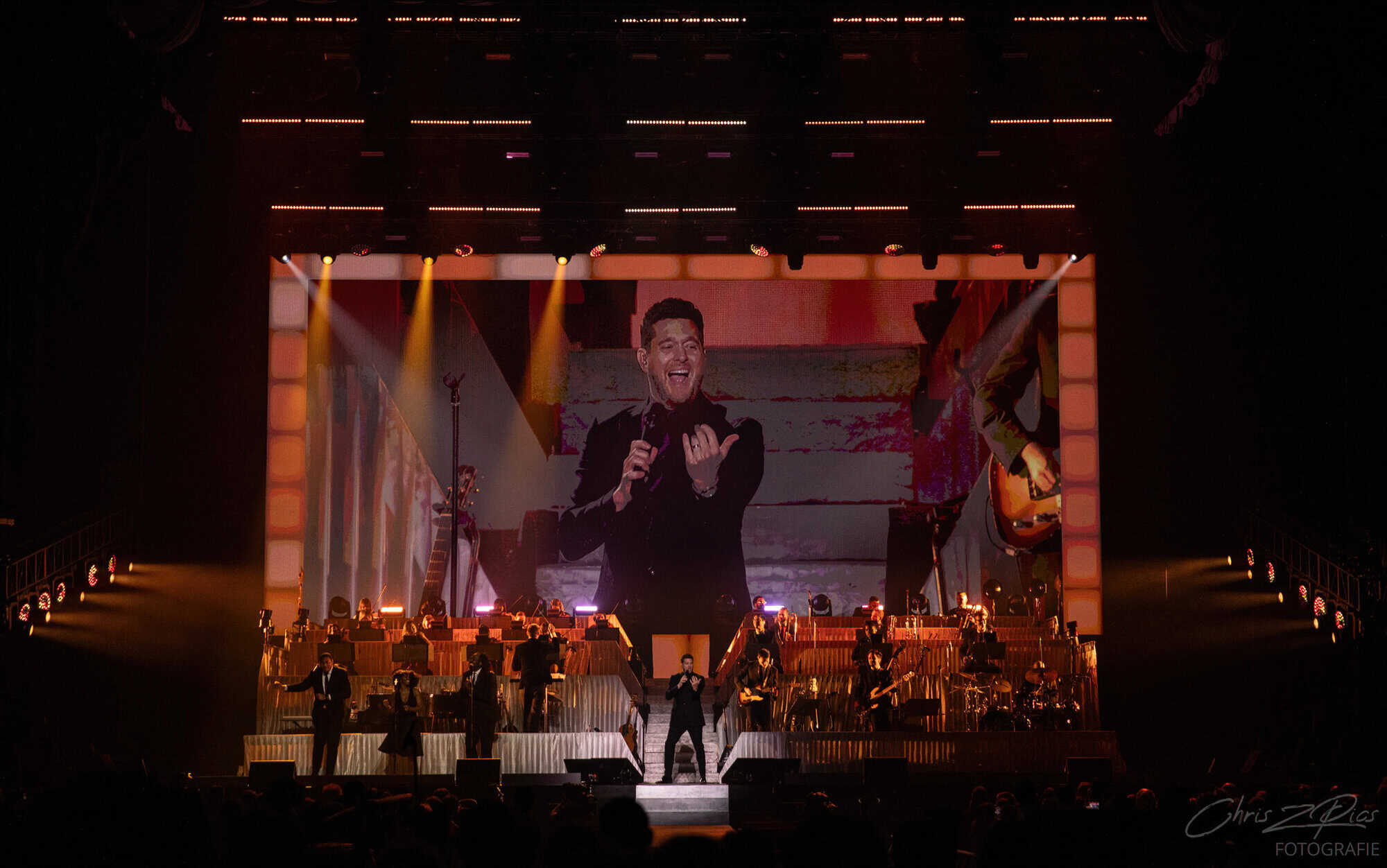 The mostly mature crowd were hyped up by a countdown projected onto a curtained stage, with the gig starting 15 minutes late to huge applause and a flamboyant 2 minute orchestral intro, before fireworks heralded the Canadian crooner’s arrival. The 30-piece big band were given a break for the opening number – an acapella version of Feeling Good which hit all the right notes with an adoring audience.