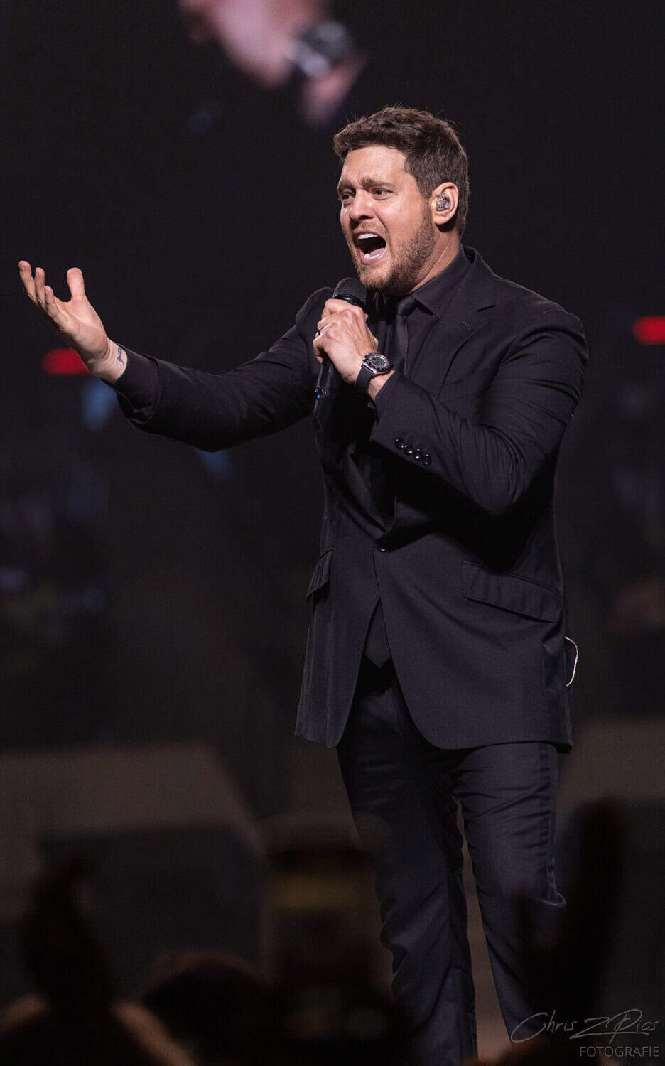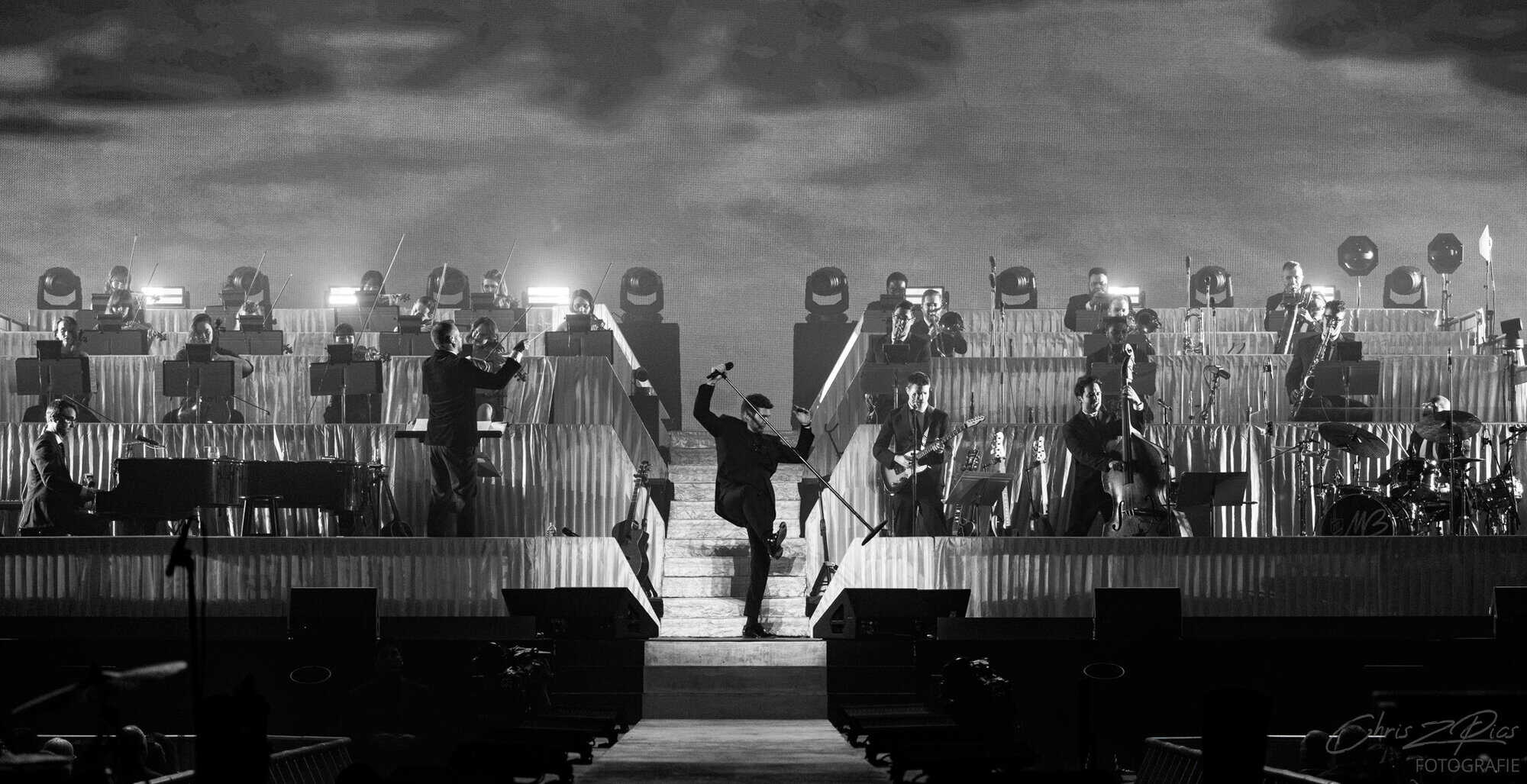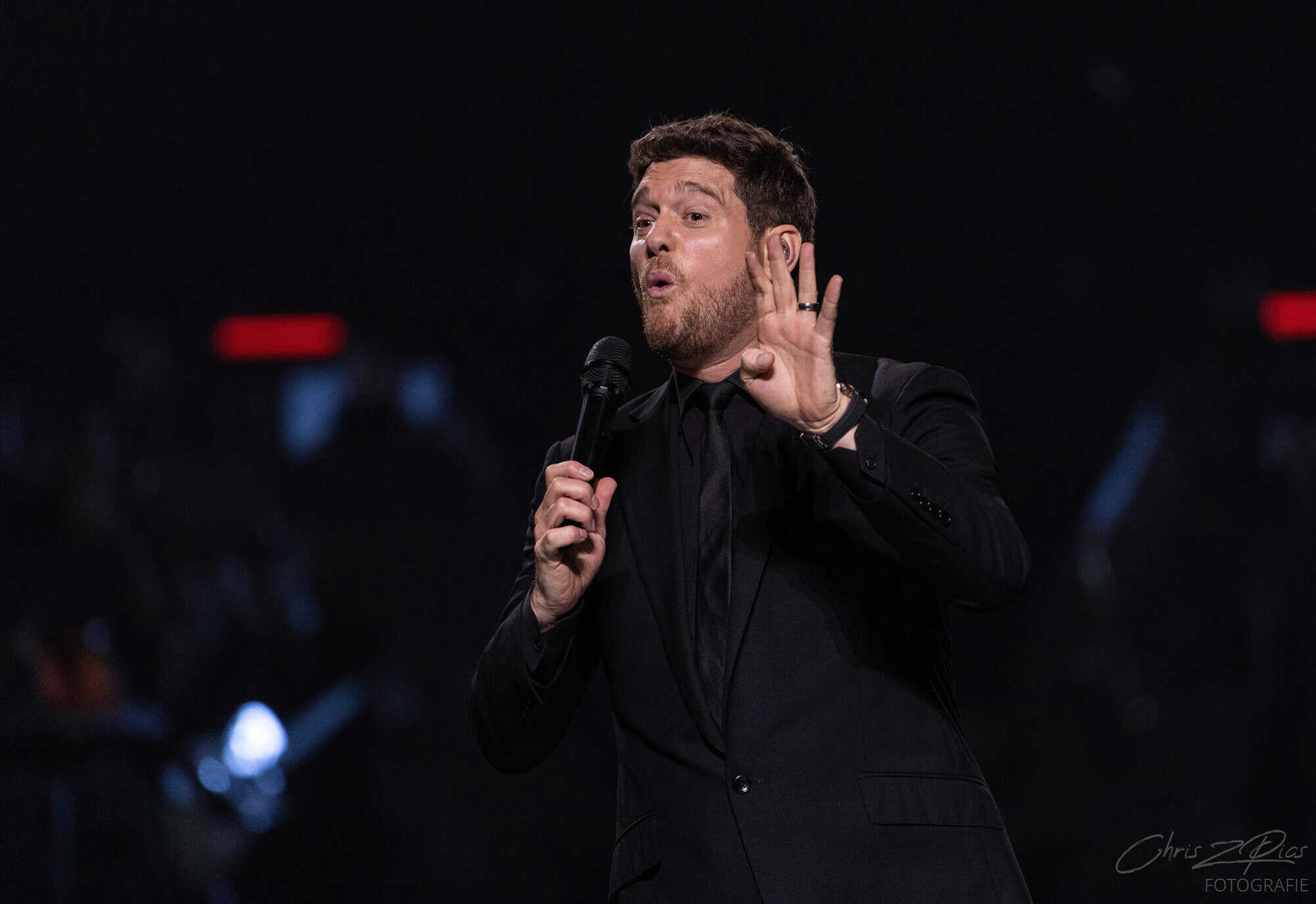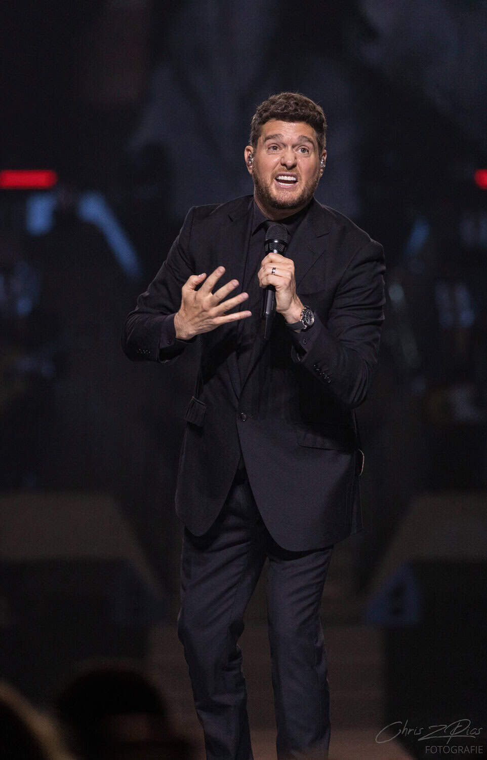The mostly mature crowd were hyped up by a countdown projected onto a curtained stage, with the gig starting 15 minutes late to huge applause and a flamboyant 2 minute orchestral intro, before fireworks heralded the Canadian crooner’s arrival. The 30-piece big band were given a break for the opening number – an acapella version of Feeling Good which hit all the right notes with an adoring audience.