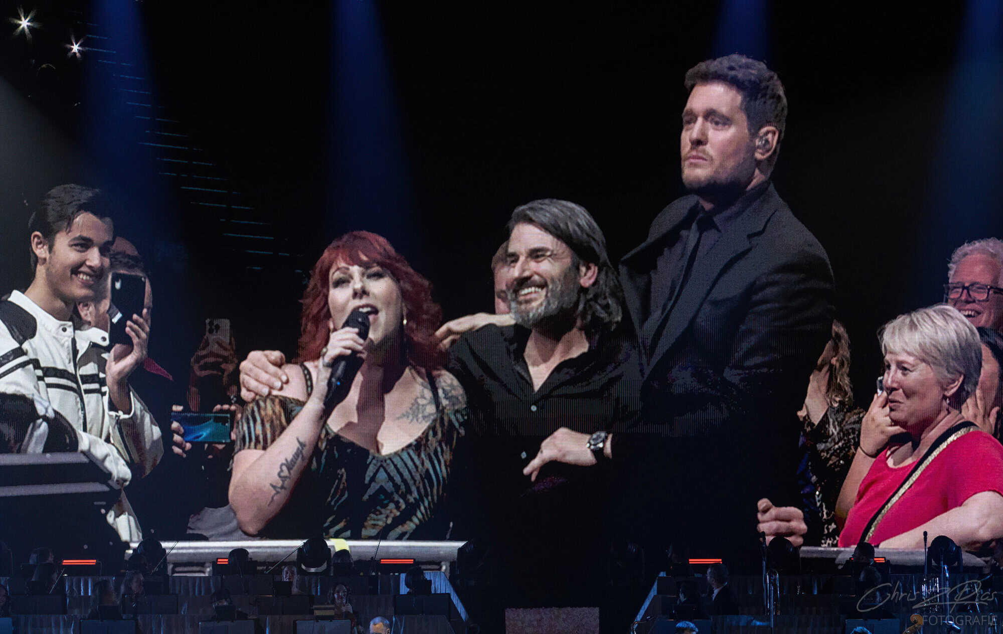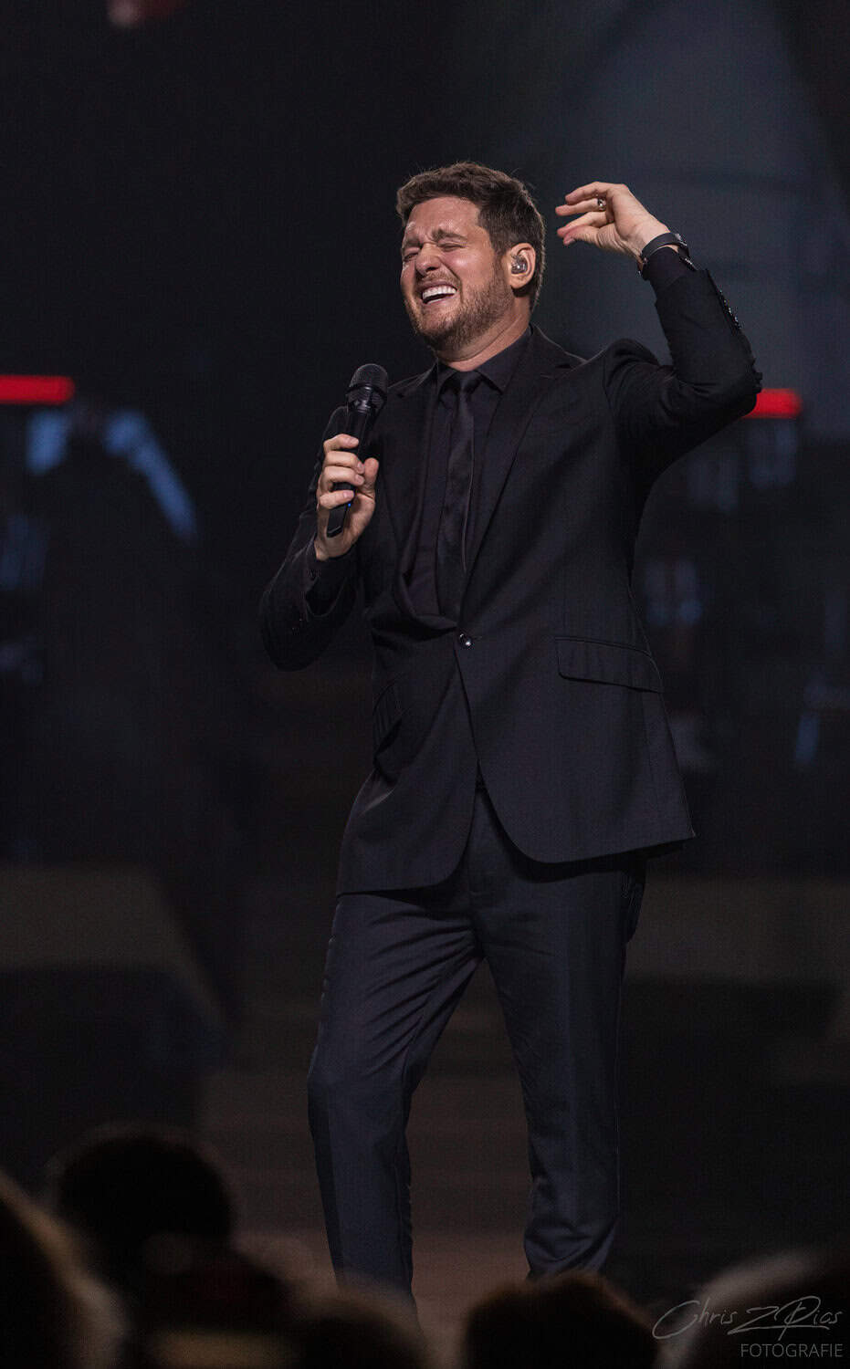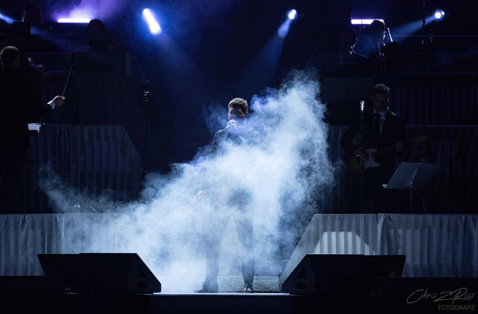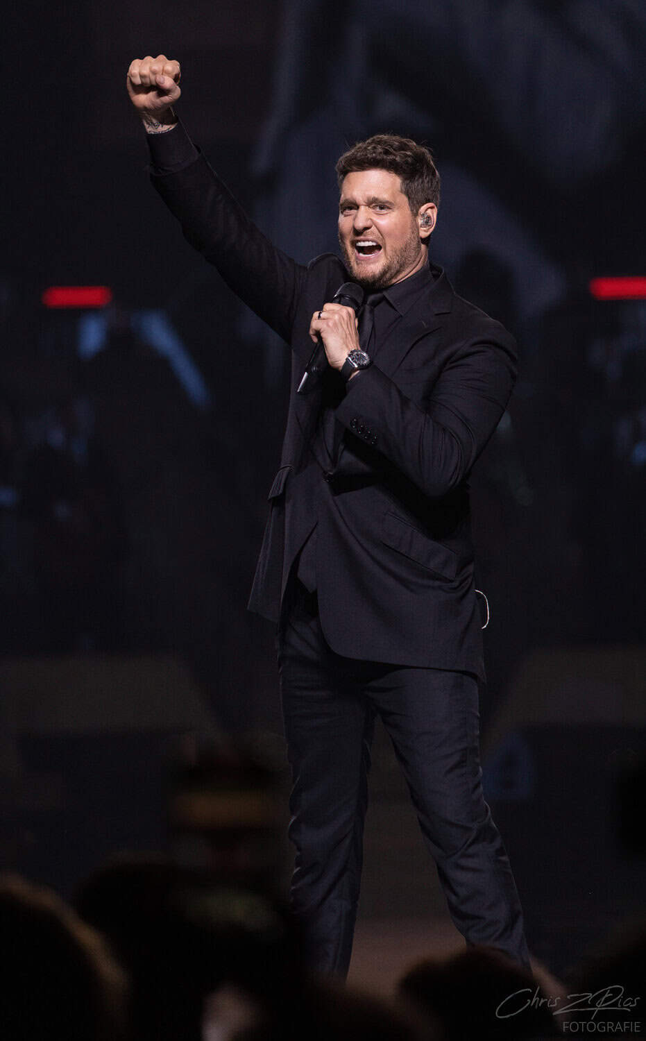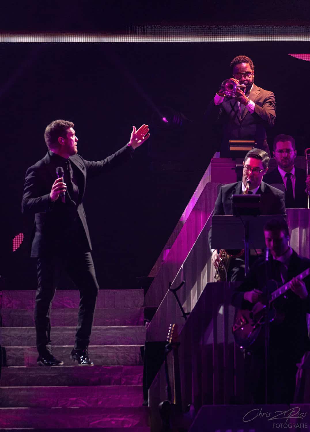 The mostly mature crowd were hyped up by a countdown projected onto a curtained stage, with the gig starting 15 minutes late to huge applause and a flamboyant 2 minute orchestral intro, before fireworks heralded the Canadian crooner’s arrival. The 30-piece big band were given a break for the opening number – an acapella version of Feeling Good which hit all the right notes with an adoring audience.