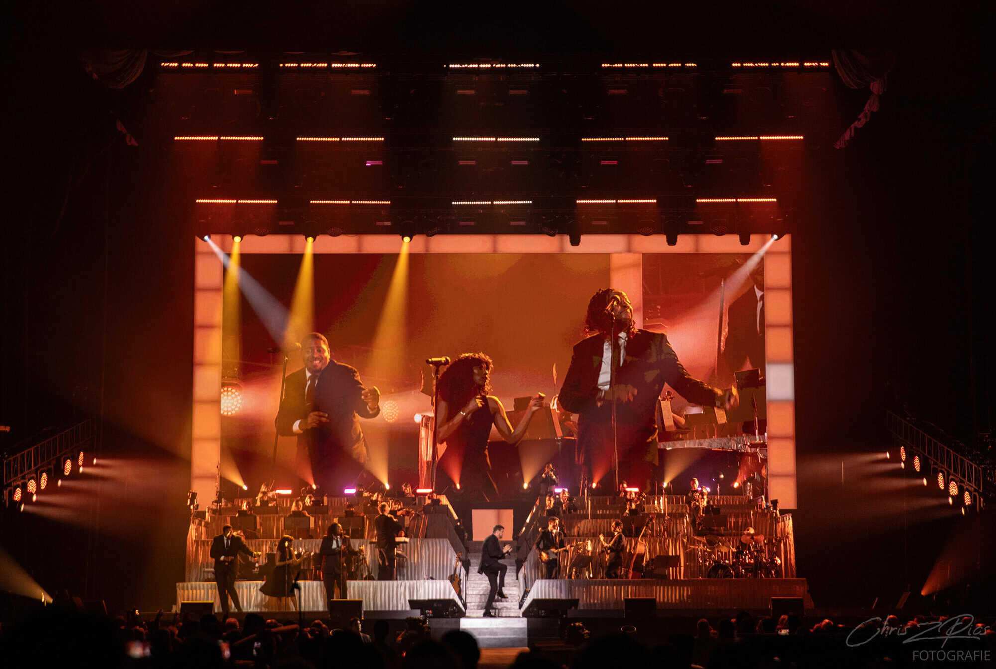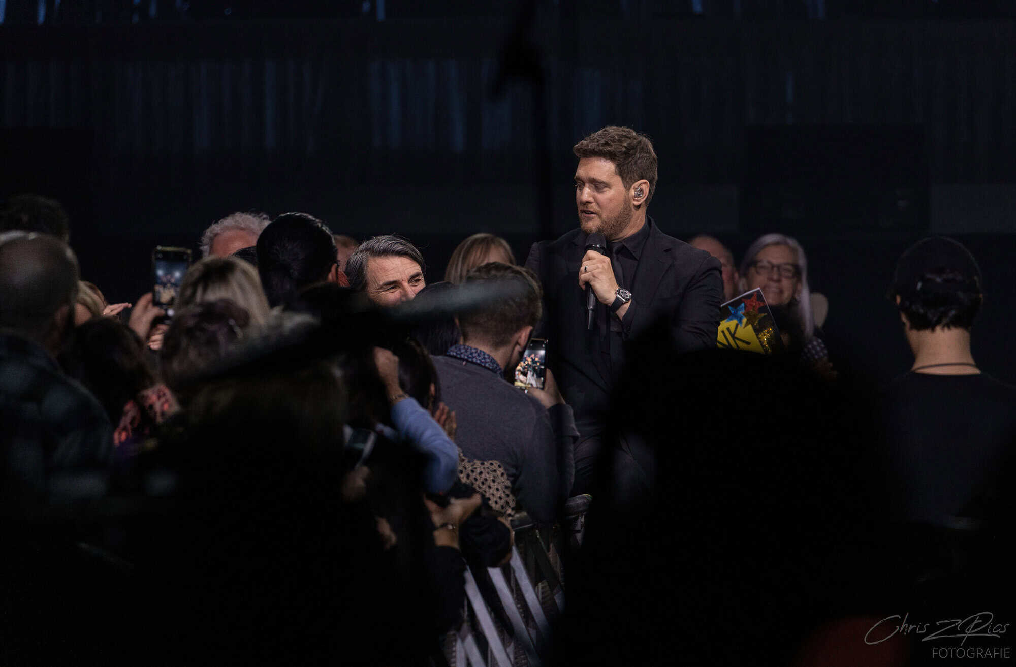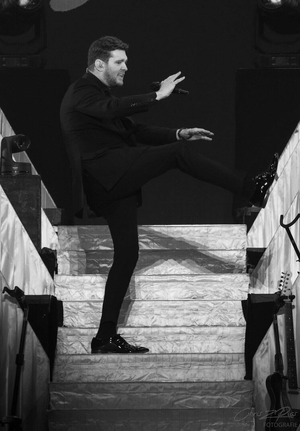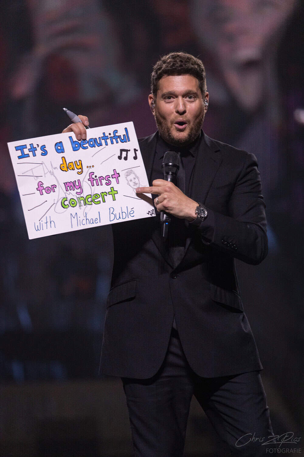 The mostly mature crowd were hyped up by a countdown projected onto a curtained stage, with the gig starting 15 minutes late to huge applause and a flamboyant 2 minute orchestral intro, before fireworks heralded the Canadian crooner’s arrival. The 30-piece big band were given a break for the opening number – an acapella version of Feeling Good which hit all the right notes with an adoring audience.