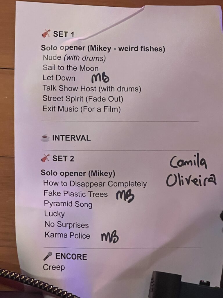 Mikey was forved to “roll with the punches” when a missing capo forced him to close the first set with Fake Plastic Trees instead of the planned Exit Music.