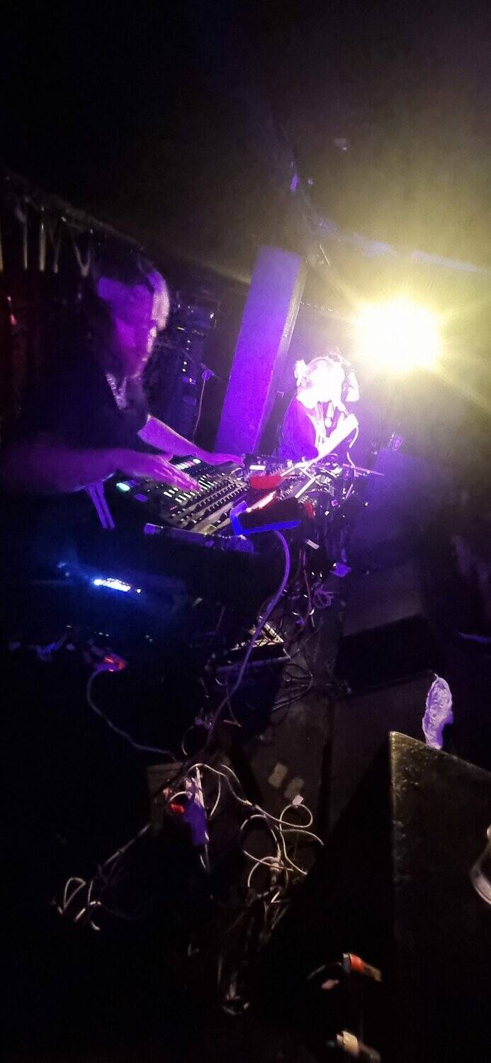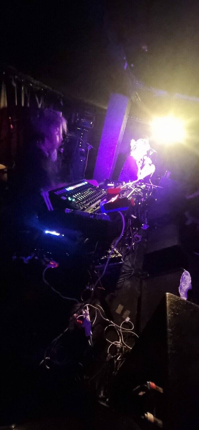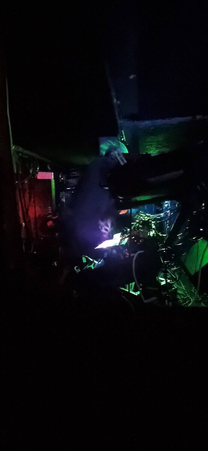 The volume builds, energy is sparked, doomsters are enflamed, and he(a)vy met(a)l envelopes the few, the some, the many assembled. Is it maths-metal. As ensemble members co-construct sabbath riffs aplenty, angelic vocals waft, and harmonies flow in operatic quivers. In moments of space, clarity appears, feedback, dark bass rhythms, unadorned beats, drumstick on drum and rim. Time slows down mid flow, and almost stops, the moment stretches forever (like slomo) then collapses forward.