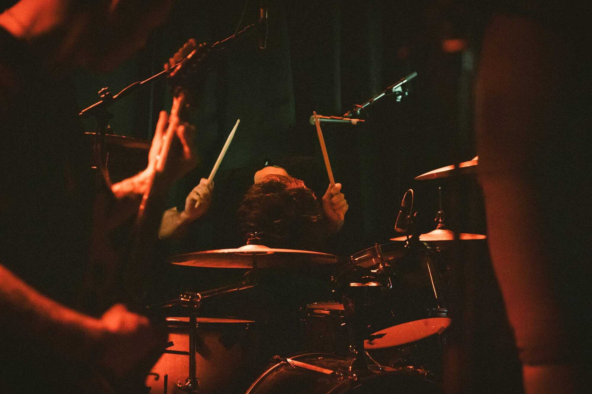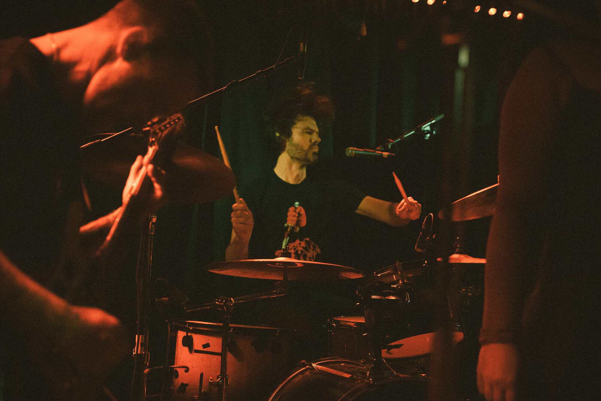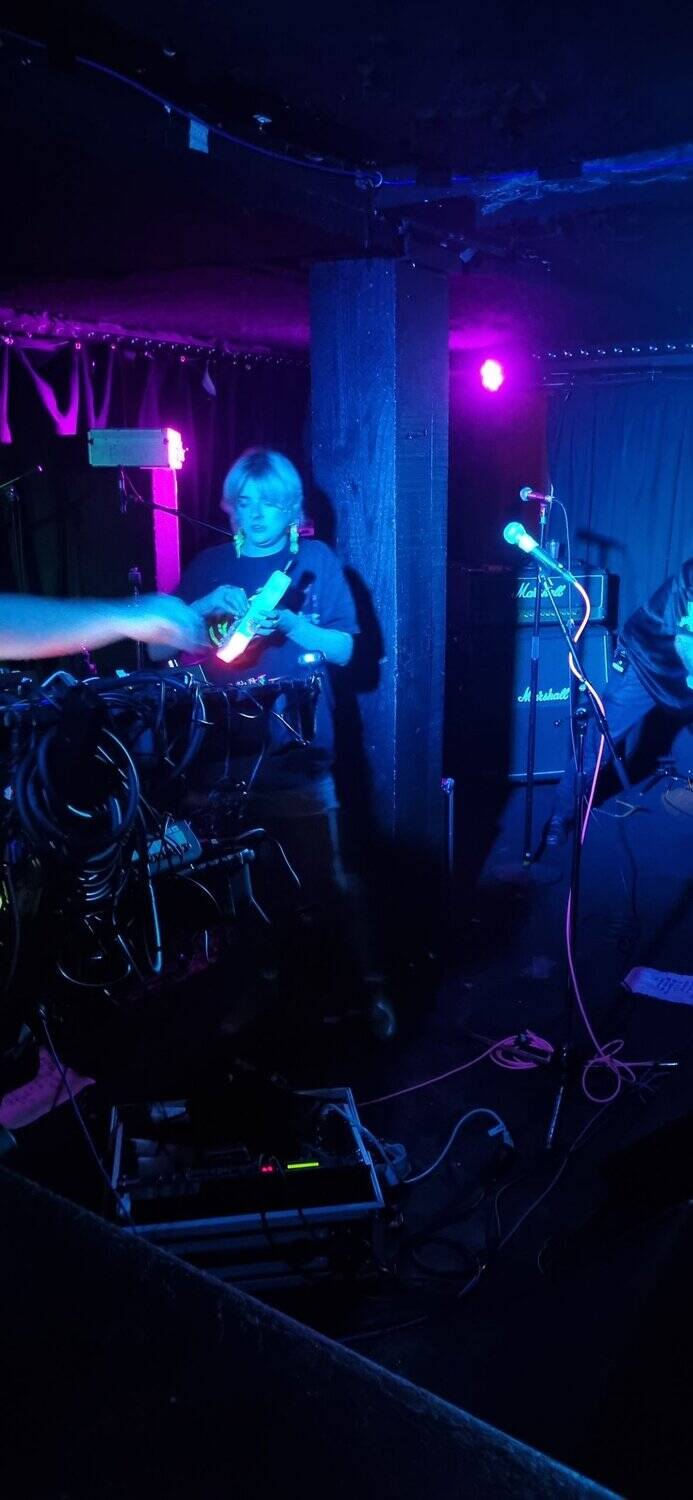 The volume builds, energy is sparked, doomsters are enflamed, and he(a)vy met(a)l envelopes the few, the some, the many assembled. Is it maths-metal. As ensemble members co-construct sabbath riffs aplenty, angelic vocals waft, and harmonies flow in operatic quivers. In moments of space, clarity appears, feedback, dark bass rhythms, unadorned beats, drumstick on drum and rim. Time slows down mid flow, and almost stops, the moment stretches forever (like slomo) then collapses forward.