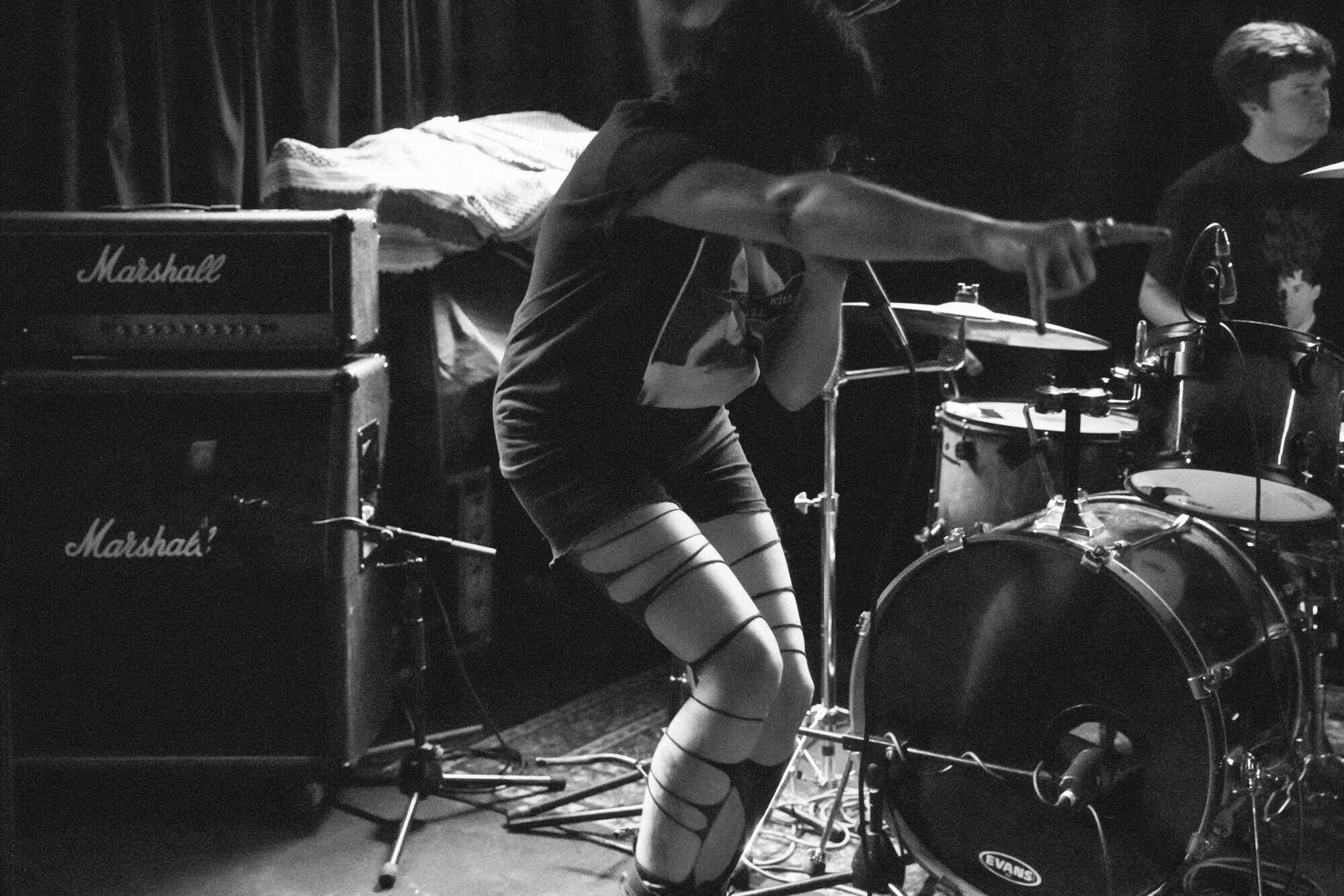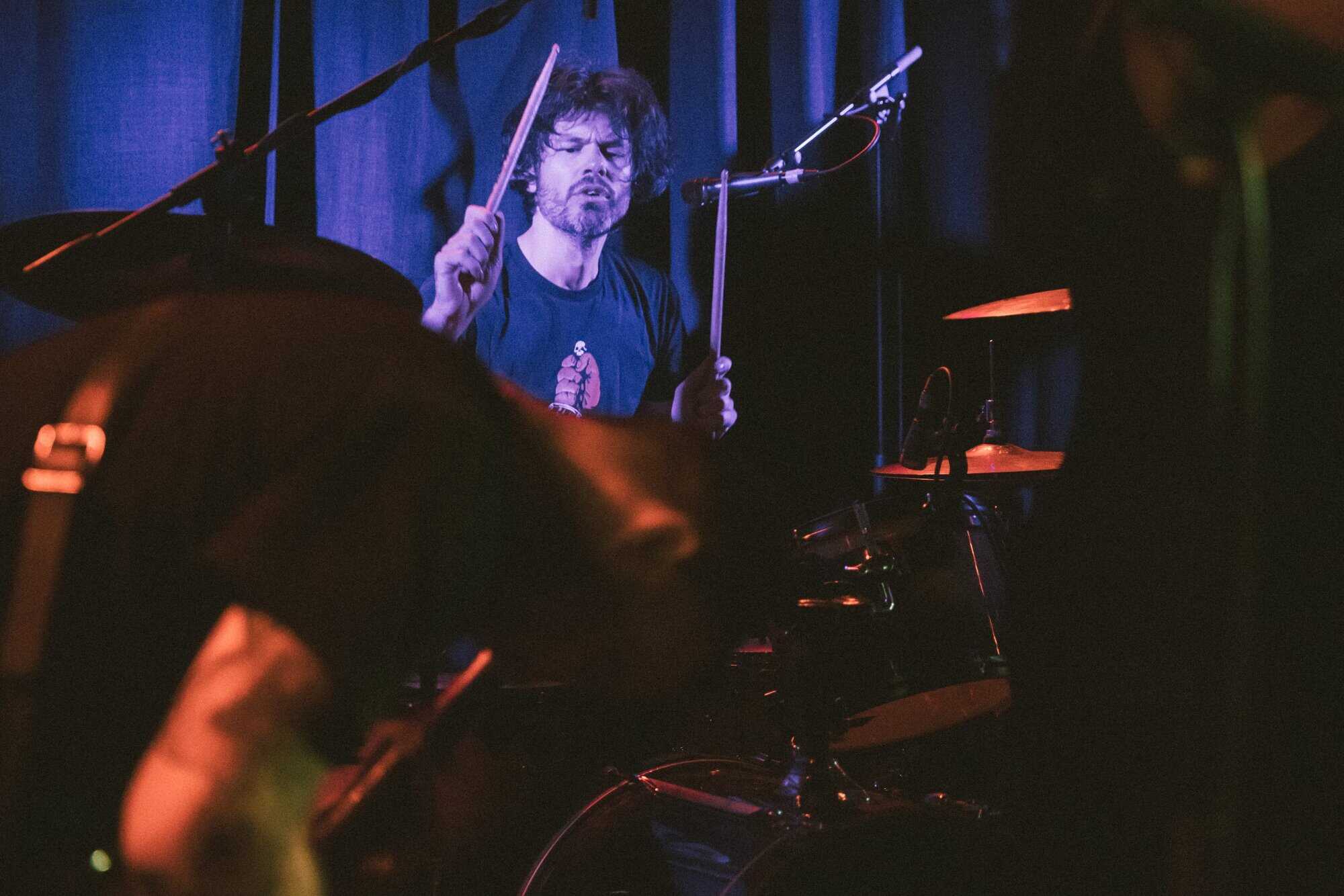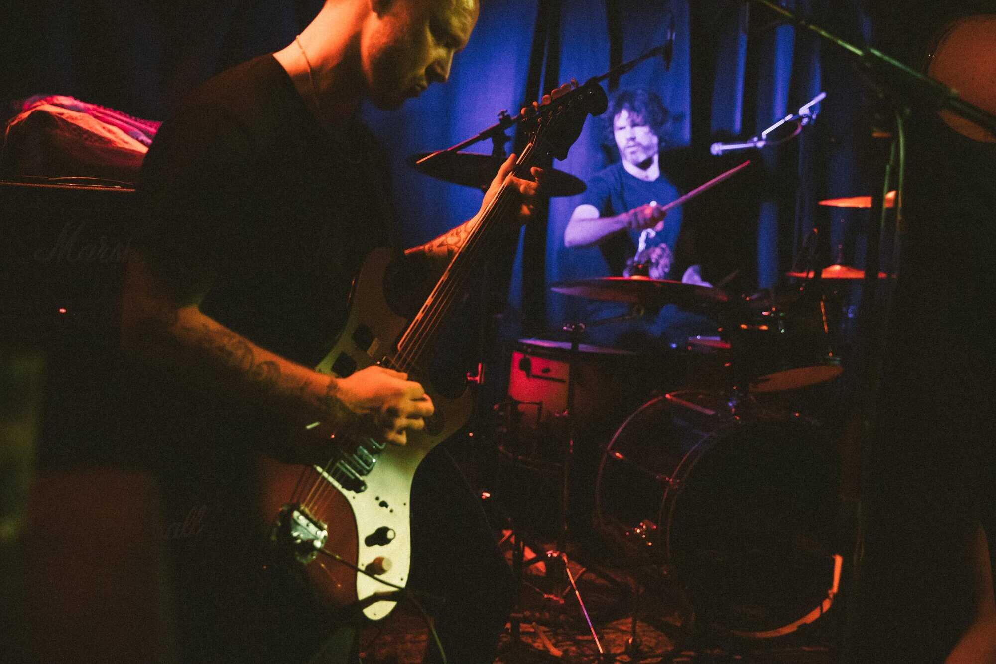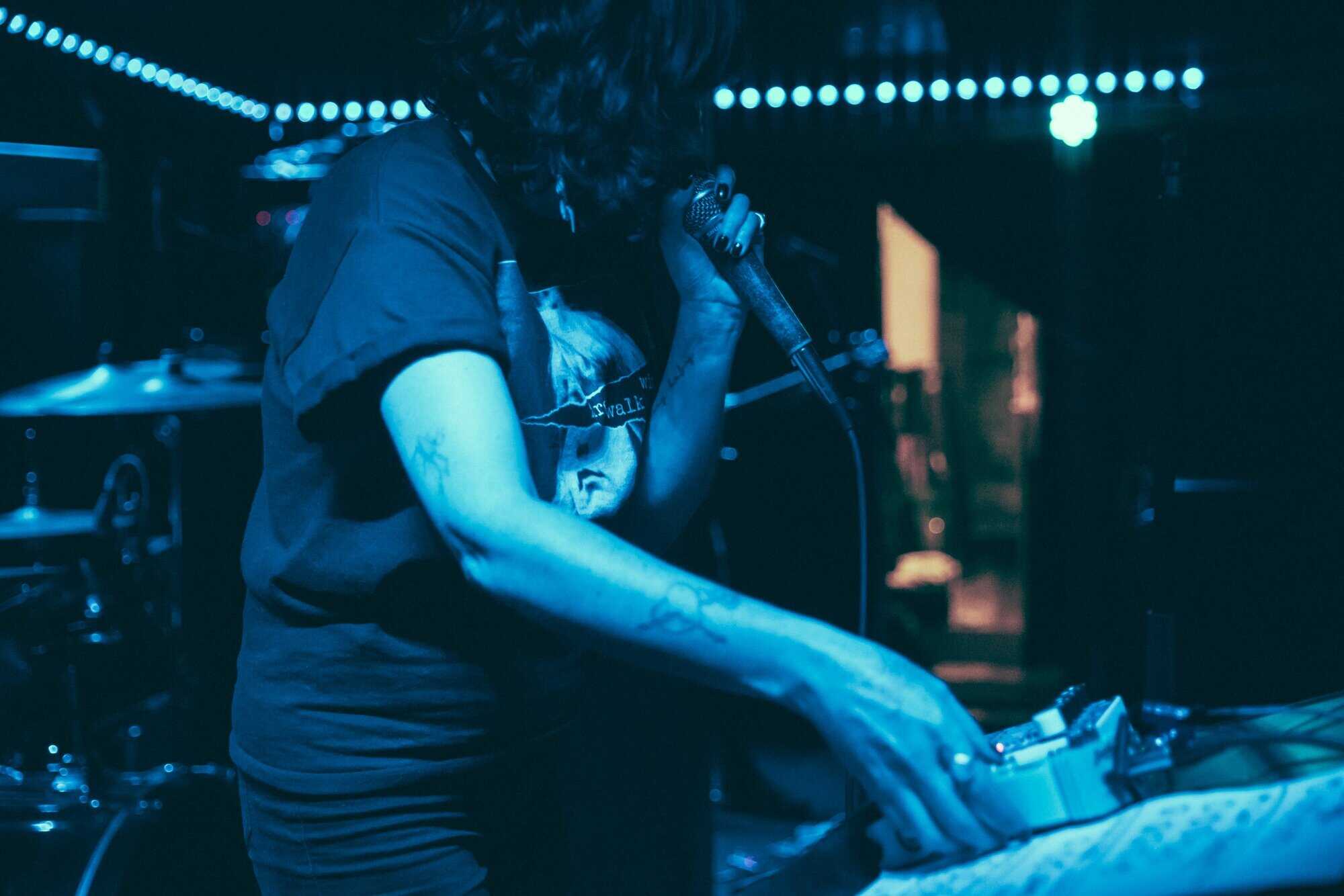 But if a group is going to bare themselves with just rhythmic tools, whence narratives are delivered in a manner of pre/post punk absurdism, think Cabaret Voltaire/Coum transmissions without the cut ups, visuals and triggers, then absolutism needs to prevail. Nick Harte’s bass skills are meritorious, there is a fluidity and an intricacy that holds, The affecting of Hannah Harte vocals adds. However the drumming is at times colourless, perhaps a symptom of youth. In a set that was a little long, I found myself wanting  a whole lot more from Moider Mother. Click on any image to view a photo gallery by Brenna Jo Gotje: