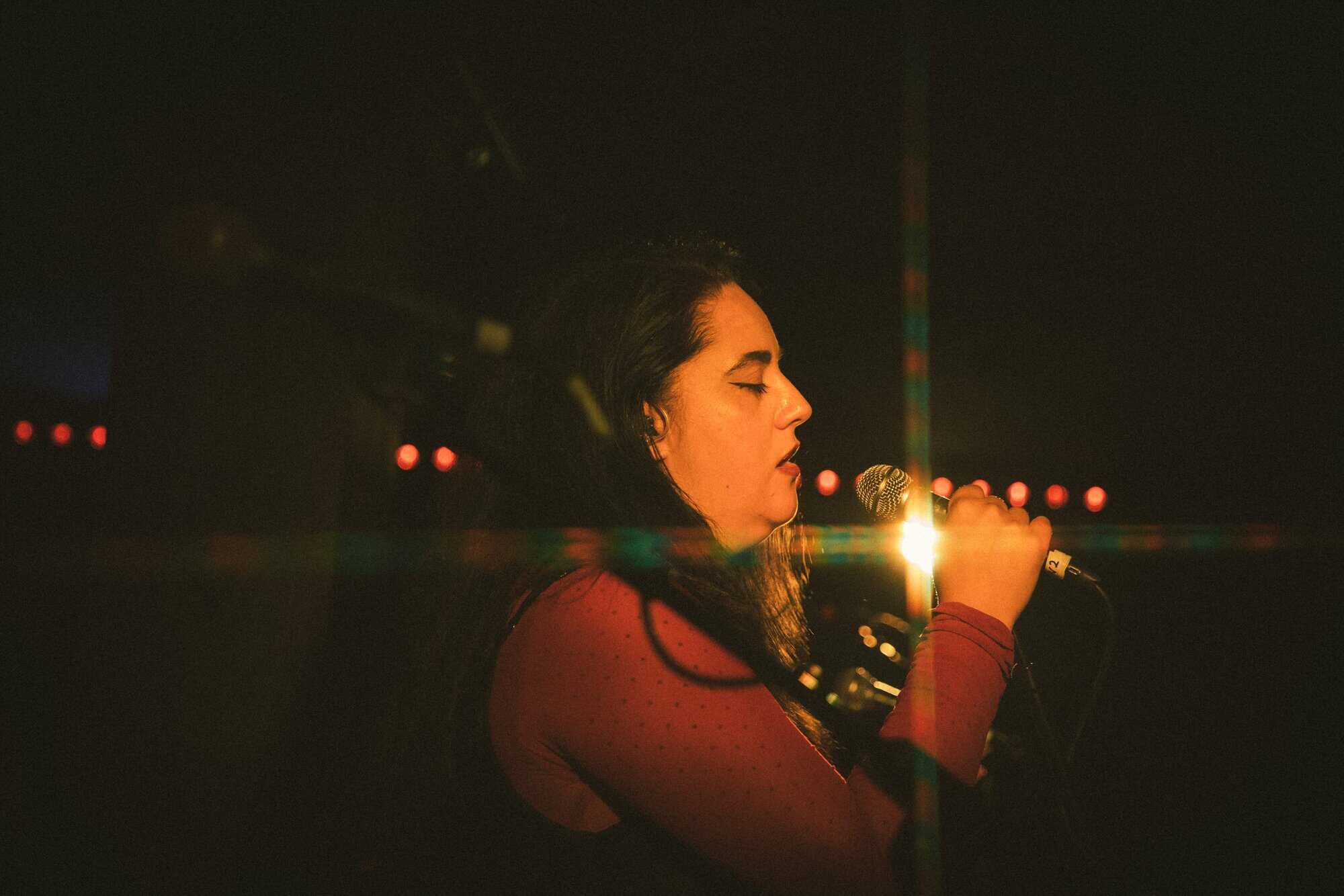 Hannah Harte commences as angel-like figure prophesying, early on the sound person is battling feedback, as she uses an array of effects to distort, delay, harmonize her vocals. It gets sorted and the distraction from the trios drums, bass and vox compositions is allayed.