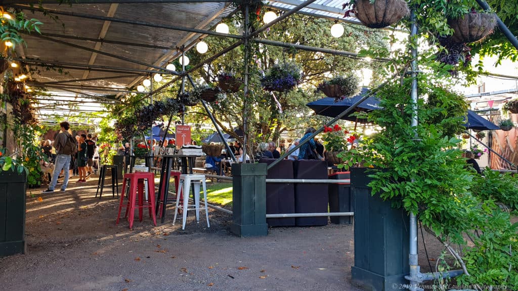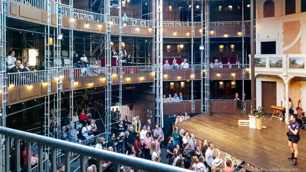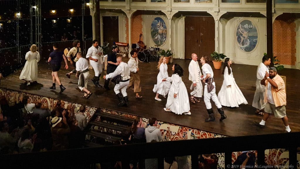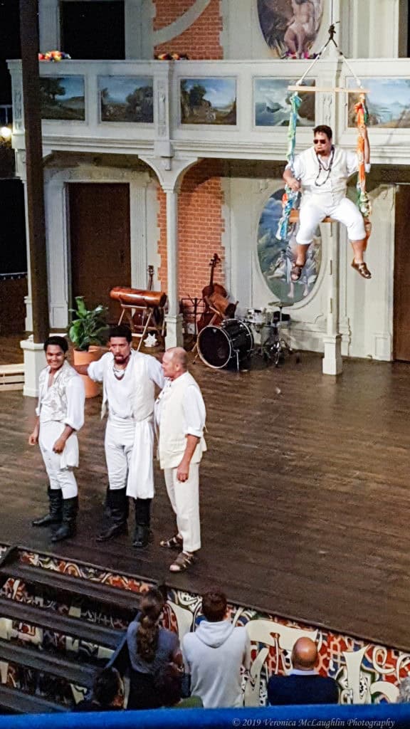 One could not hope for a more perfect evening to visit Pop-up Globe. Though the weather gods had promised rain, the air was warm and still, perfect for strolling through the glittering garden with a glass of wine before taking our seats in the theatre itself. The Pop-up Globe is a painstaking recreation of Shakespeare’s own second Globe theatre, but instead of wood, it is made of modern scaffolding, with three levels of seating and standing room only for Groundlings who pay a mere $10 for the privilege of both watching the performance and inevitably taking part in the proceedings.