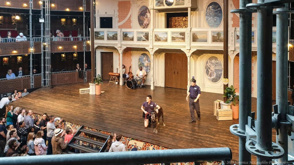 The show opens with constable Dogberry (Tom Wingfield) and his deputy Verges (Darcy Kent), along with their sidekick, the most agreeable pooch on the planet, warming up the audience with a bit of Elizabethan slapstick and engaging the crowd in a call-and-response of “You can’t bring bananas!” Settling into policework, they stumble into an unfolding crime.