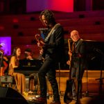 A string section of a dozen or so, conductor Leonard Weiss and NZ Trio member Somi Kim on grand piano occupied one side of the stage. On the other, Nadia’s band for the evening: long-time bassist Richie Picard; the superb Joe McCallum on drums; and – surprise of the night – the incomparable Brett Adams on guitar.
