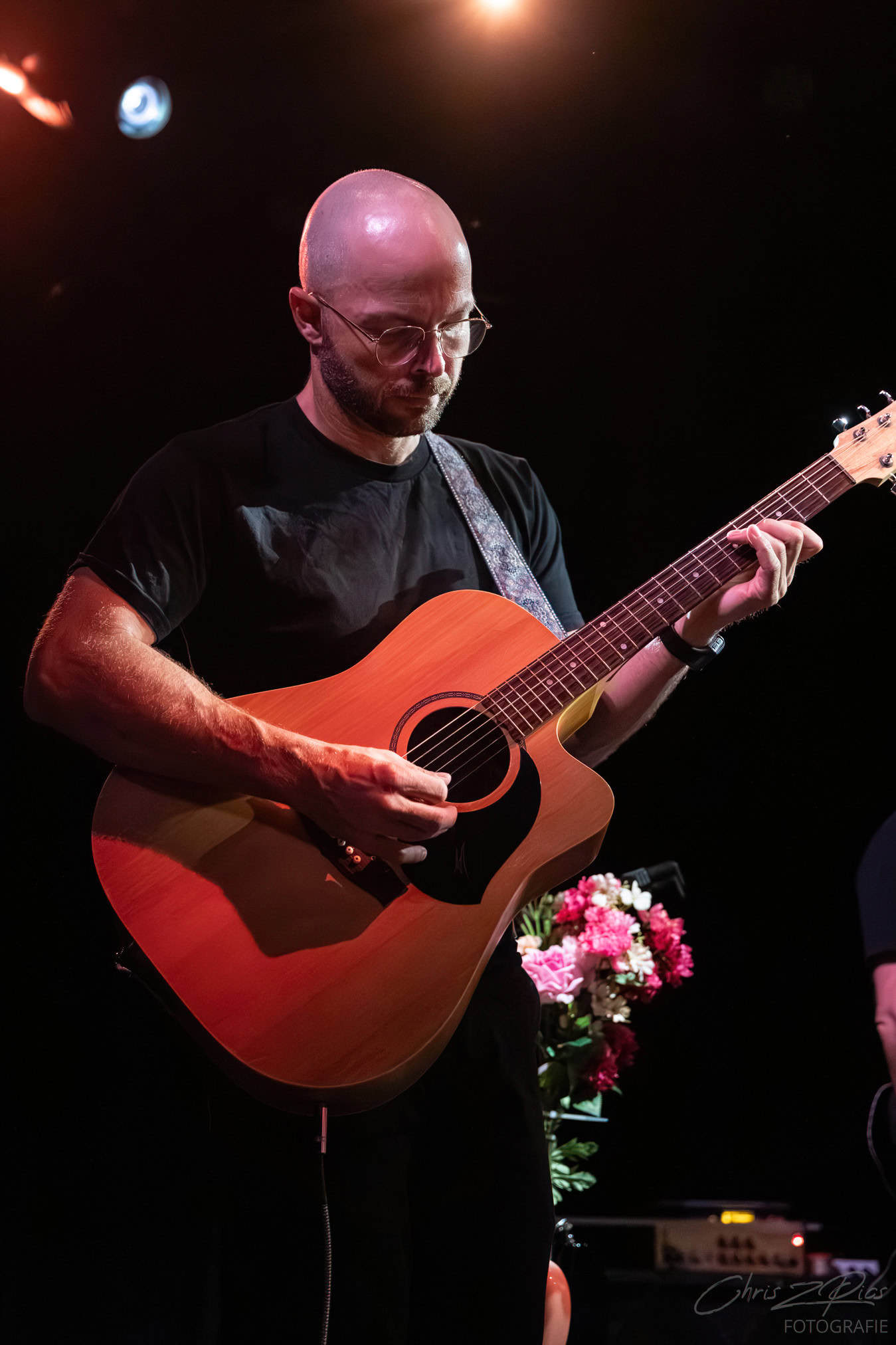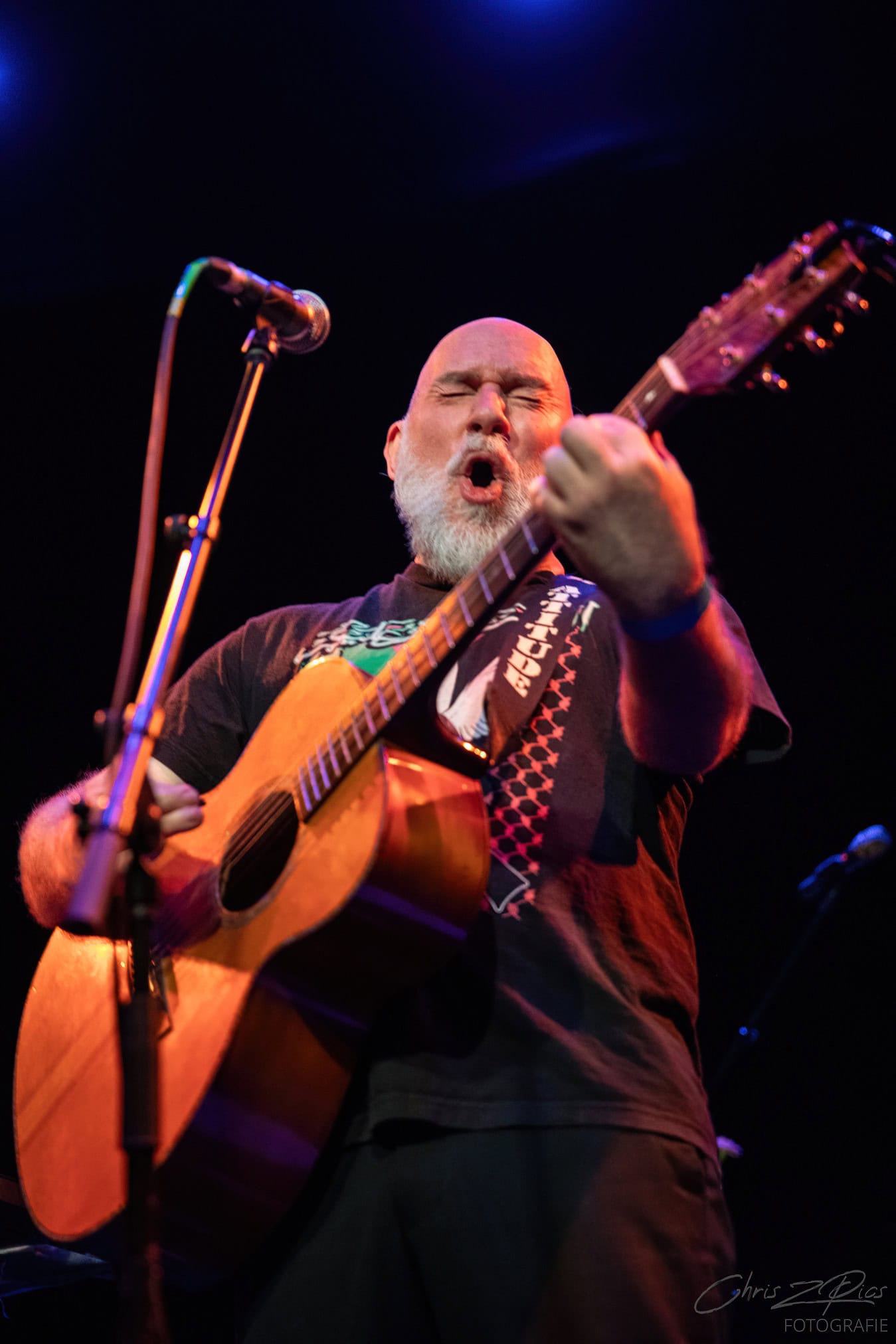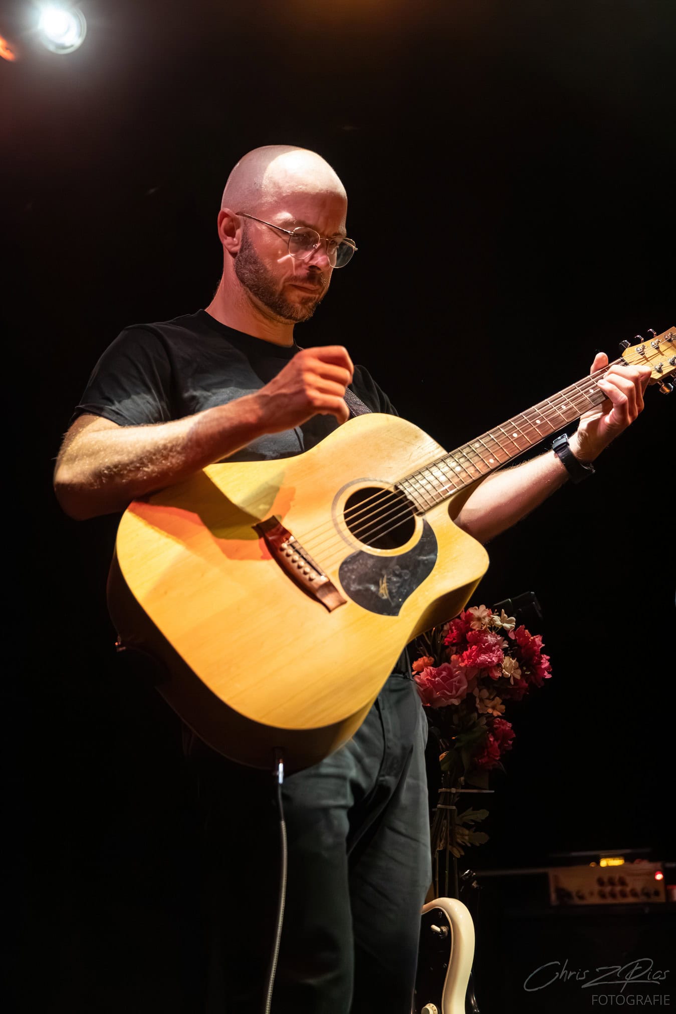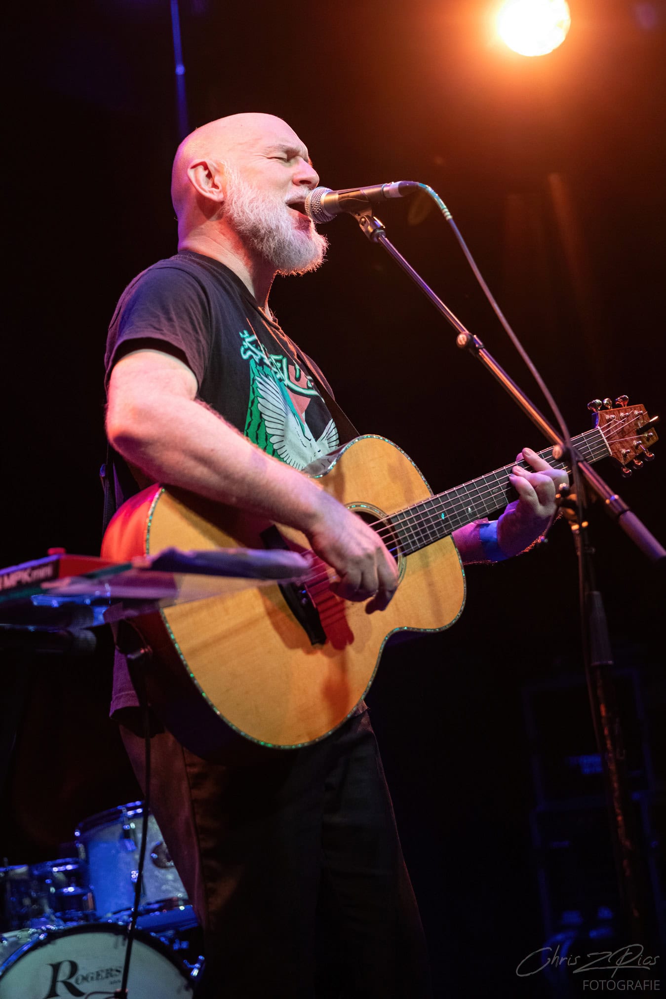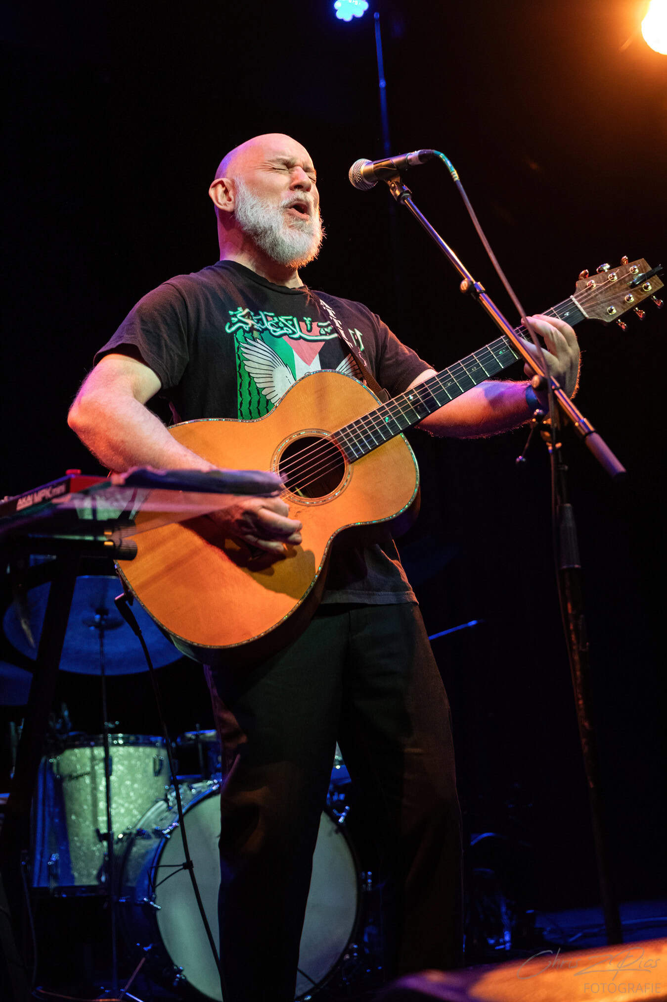 Tonight, its SJD on acoustic guitar overlaying various pedals that bring in a wide palette of sounds. Looking  monastic, happy and comfortable in his skin.