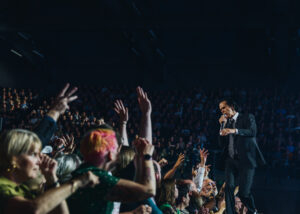 The backing singers were central to the night’s emotional architecture. Initially stationed at the rear like a gospel choir, they stepped down at key moments to become equals with Cave, singing beside him, reaching outward, touching hands, sharing the physical work of connection. Their voices lifted the music into something choral and communal, widening the emotional register each time they entered fully.